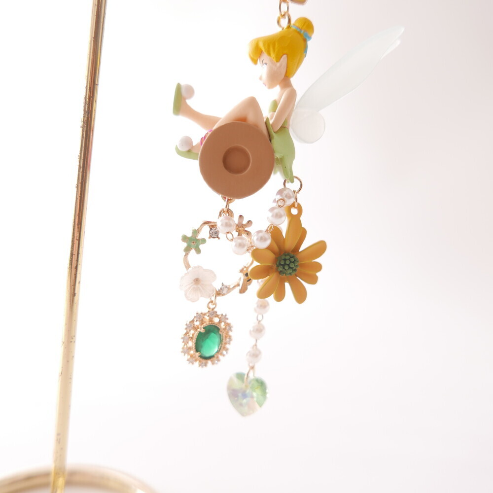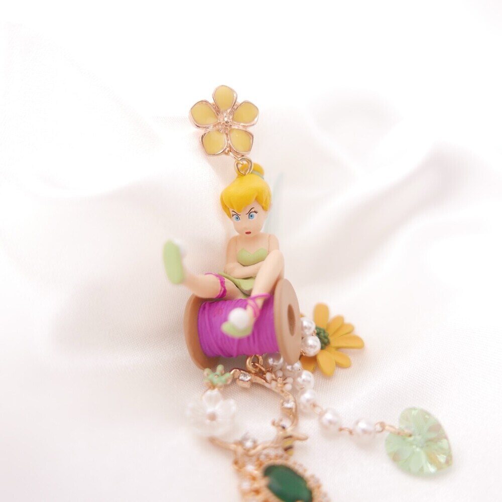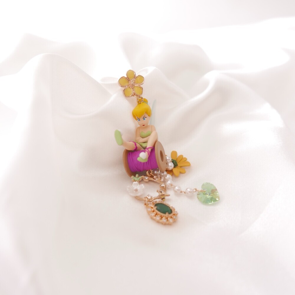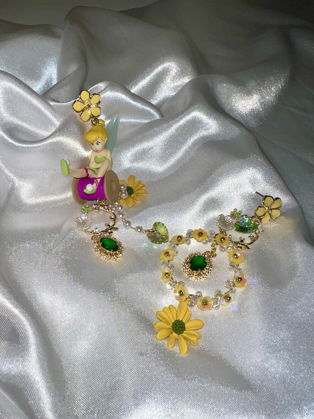 Bring a little pixie magic to your outfit with these whimsical Tinker Bell earrings. One side features a vintage Tinker Bell figure caught in playful threads, while the other side showcases an ornate arrangement of floral elements, green heart crystals, and sparkling gems. Carefully crafted with charming asymmetry, this pair is made from a rare unopened vintage figure and floral jewelry components.