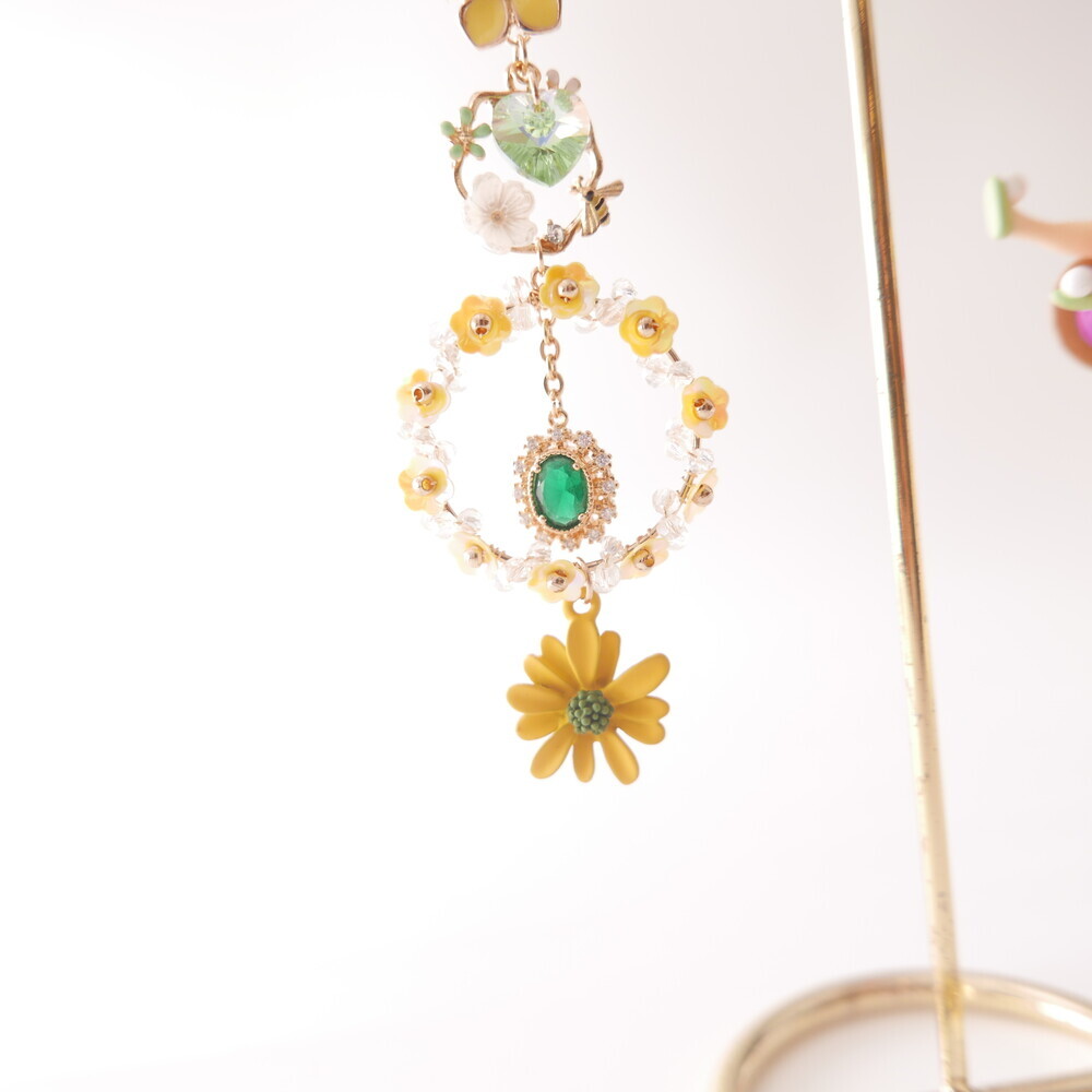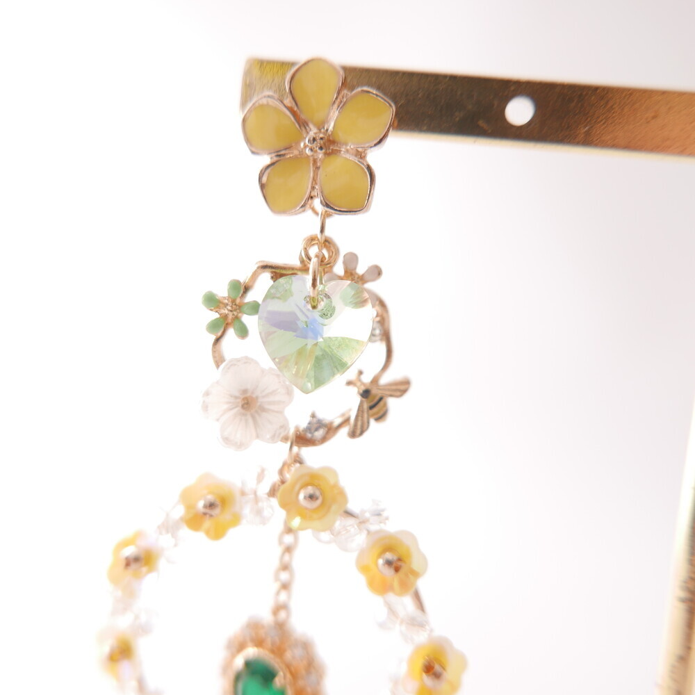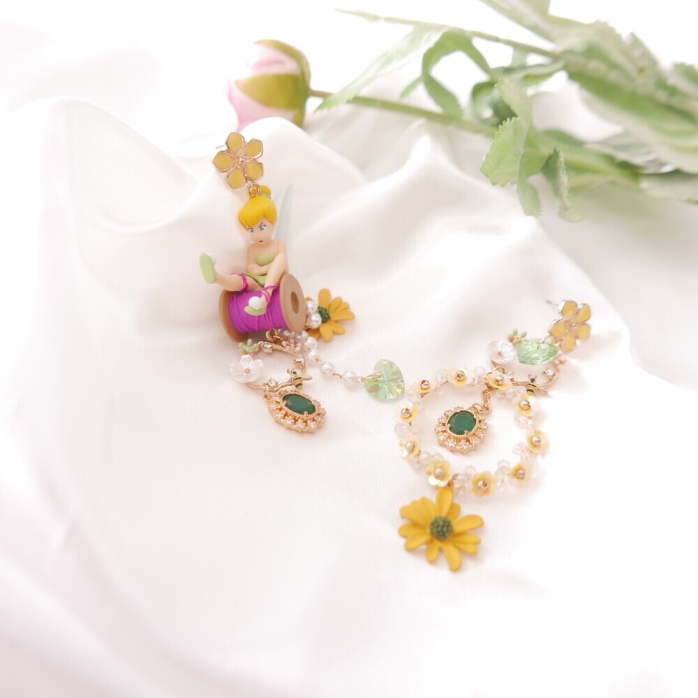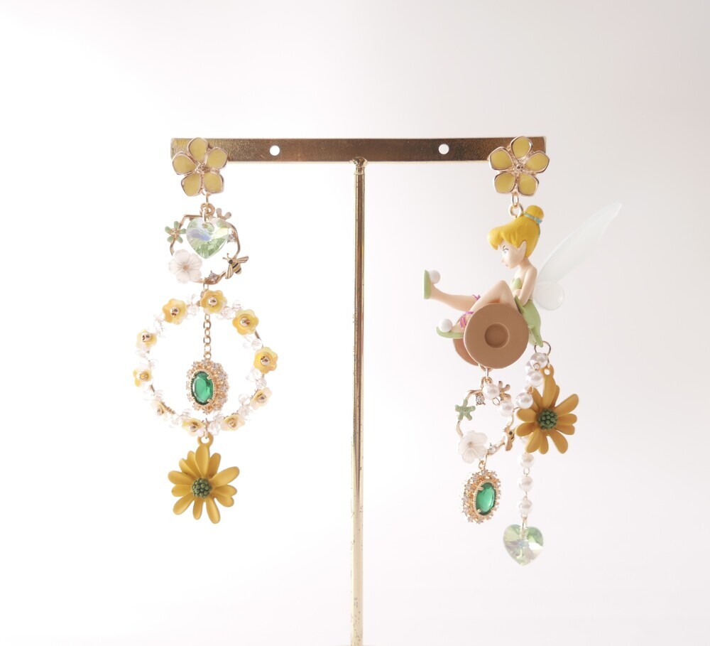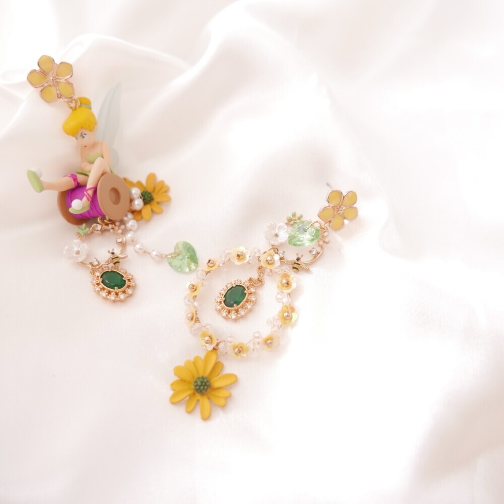 Bring a little pixie magic to your outfit with these whimsical Tinker Bell earrings. One side features a vintage Tinker Bell figure caught in playful threads, while the other side showcases an ornate arrangement of floral elements, green heart crystals, and sparkling gems. Carefully crafted with charming asymmetry, this pair is made from a rare unopened vintage figure and floral jewelry components.