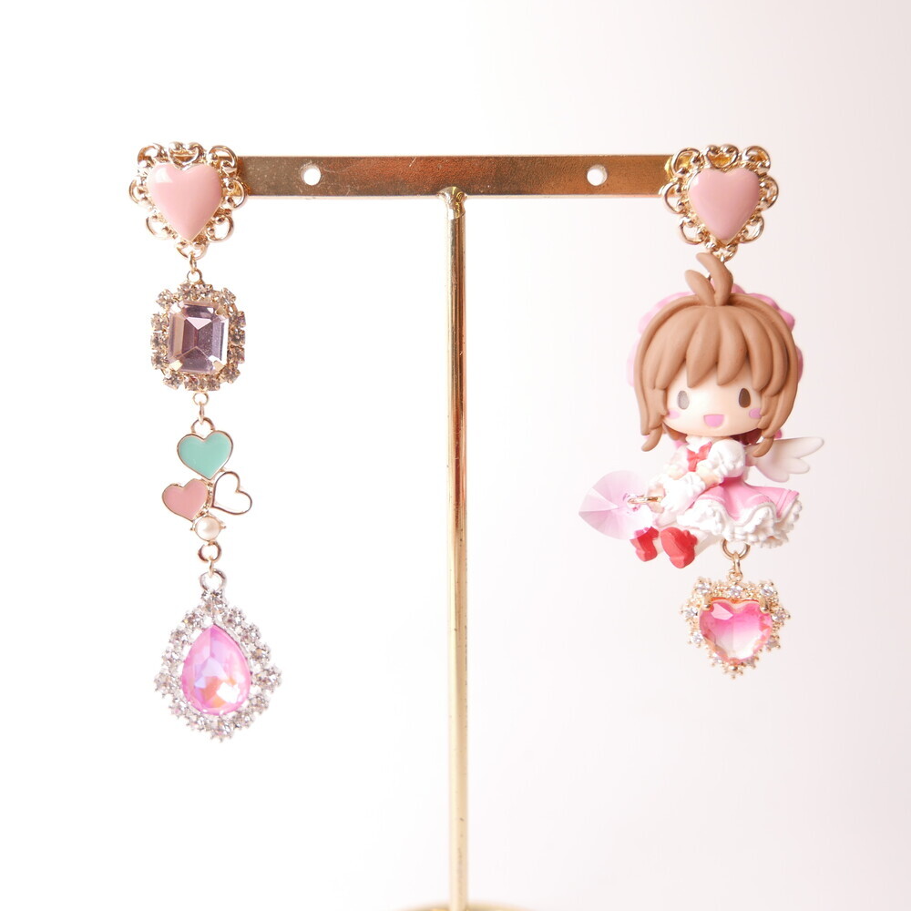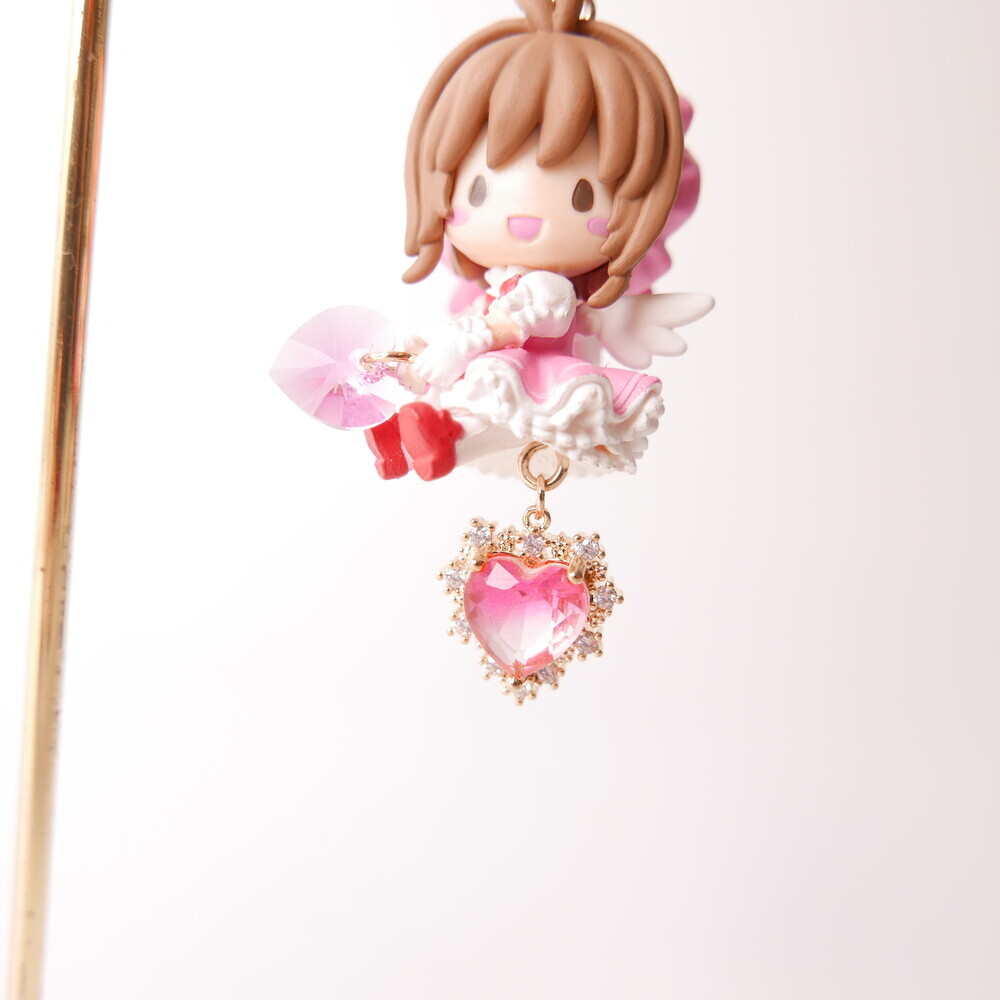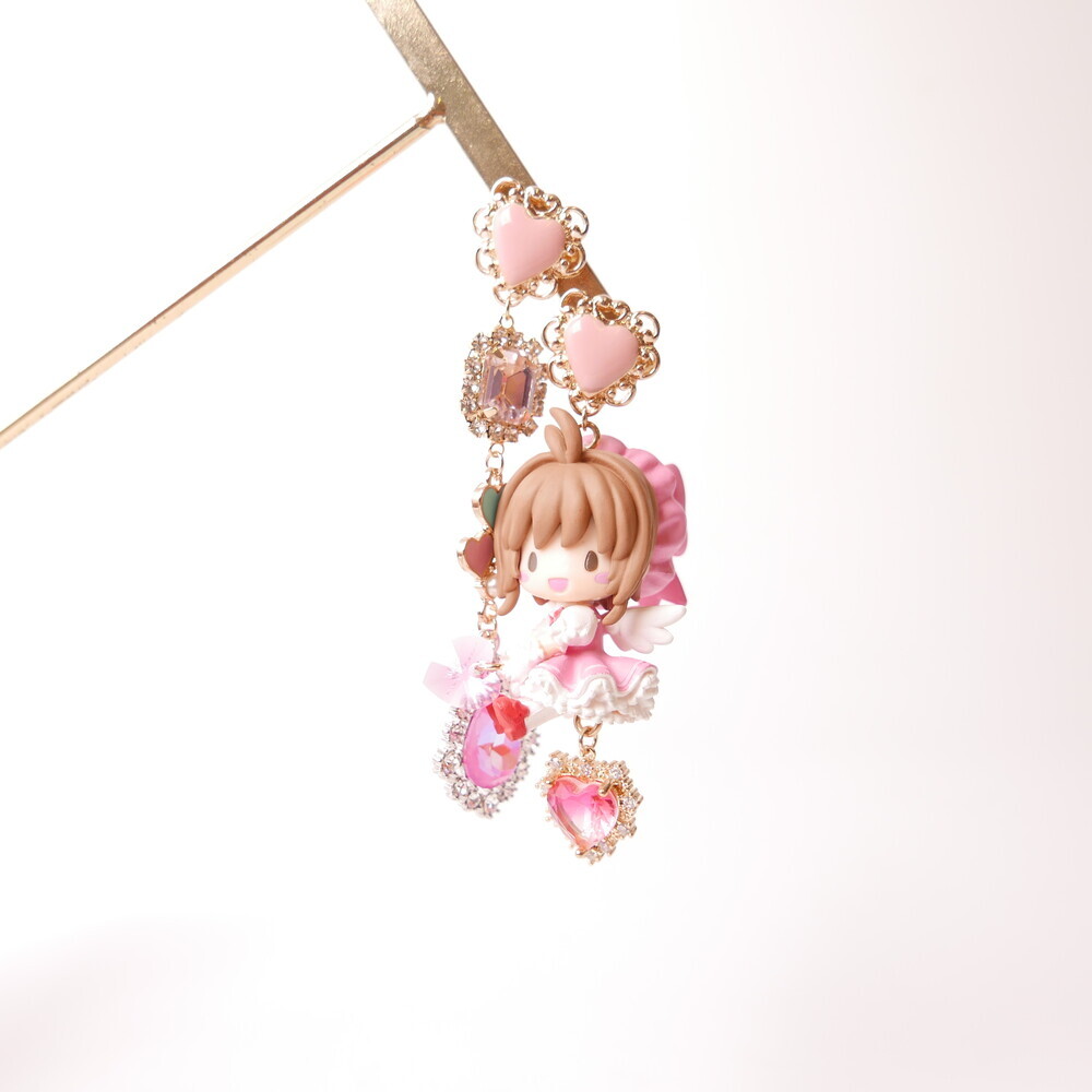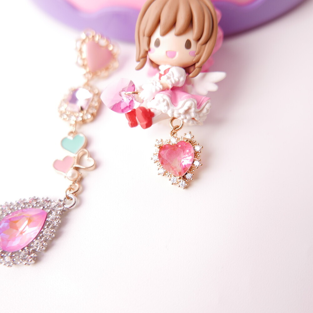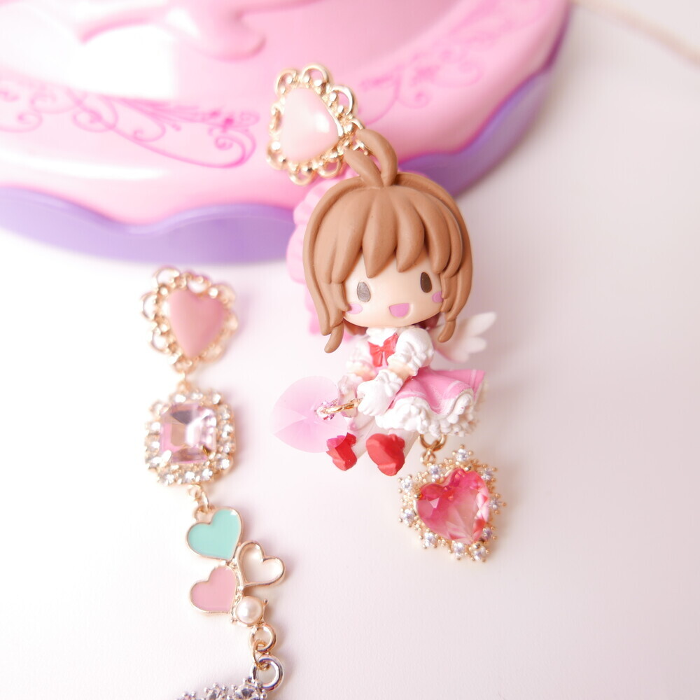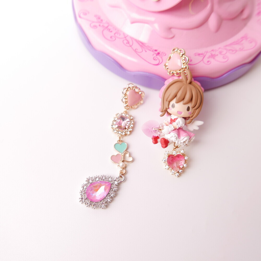 A celebration of all things cute and pink! These Cardcaptor Sakura earrings feature a sweet chibi-style Sakura figure holding a wand, paired with sparkling pastel hearts, rhinestones, and dainty gem accents. Designed to bring a dash of magical girl energy to your everyday look. Available in both pierced and clip-on options.