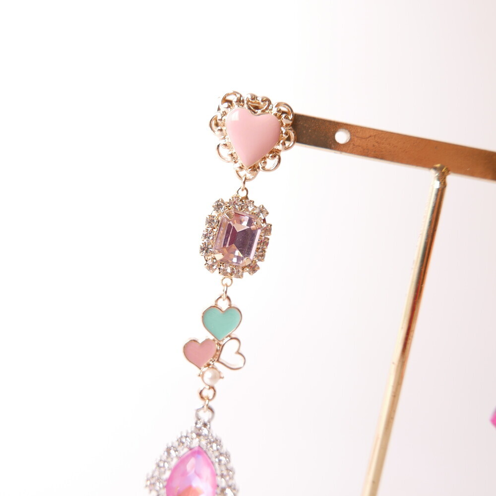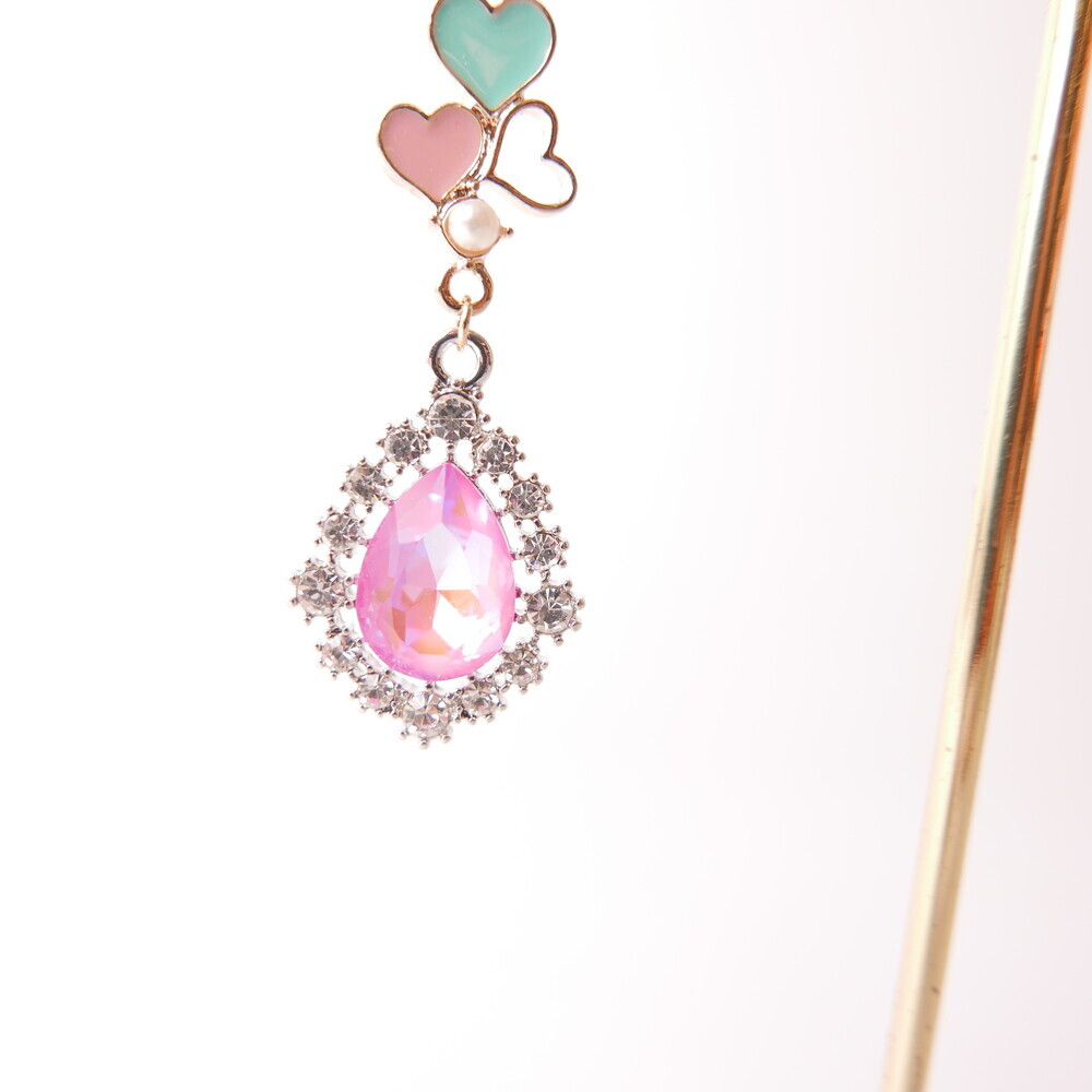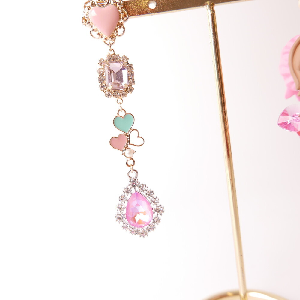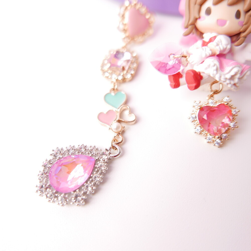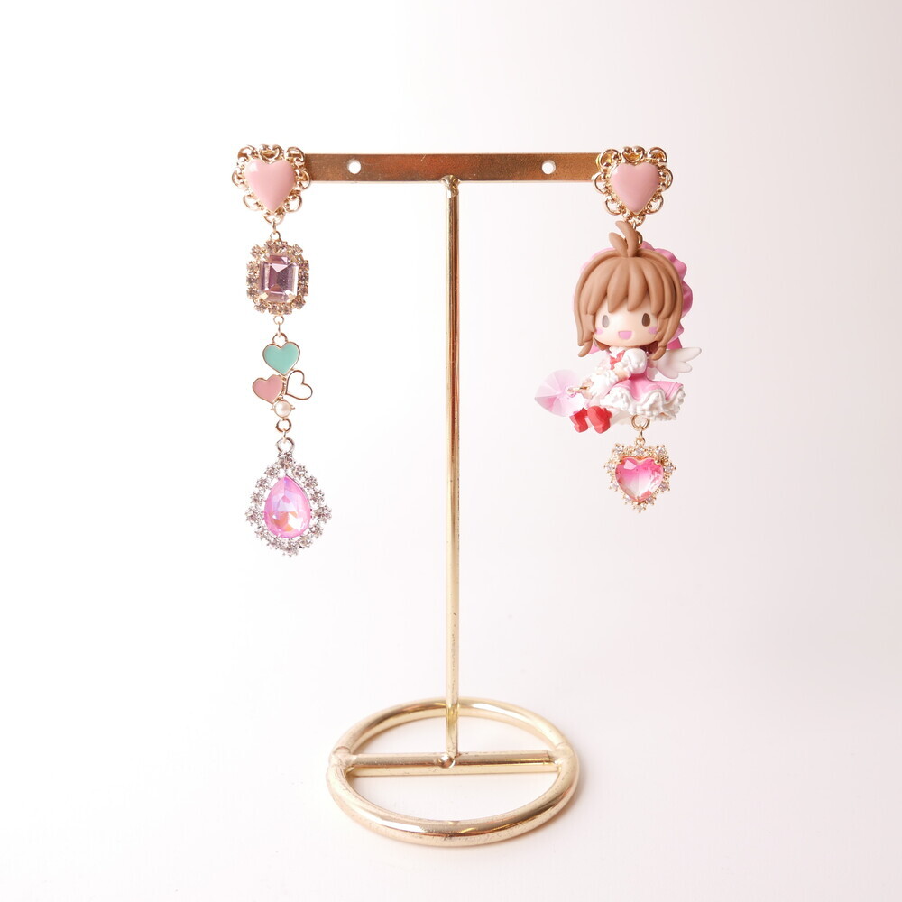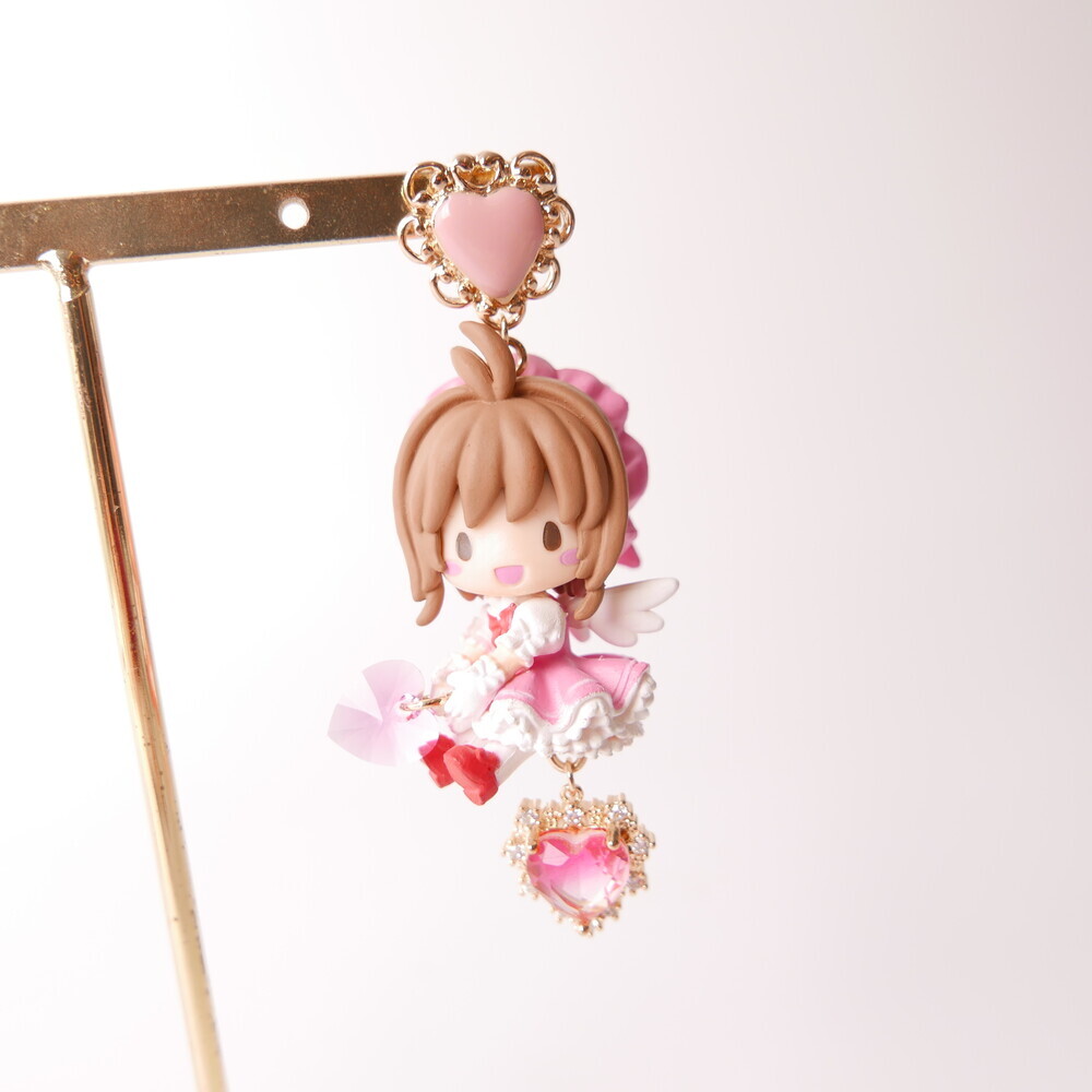 A celebration of all things cute and pink! These Cardcaptor Sakura earrings feature a sweet chibi-style Sakura figure holding a wand, paired with sparkling pastel hearts, rhinestones, and dainty gem accents. Designed to bring a dash of magical girl energy to your everyday look. Available in both pierced and clip-on options.