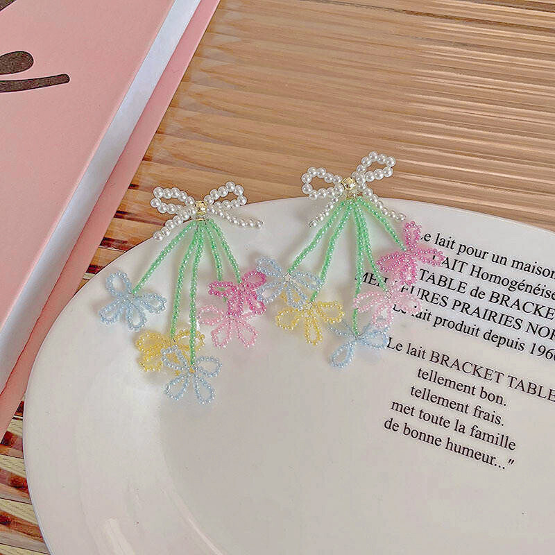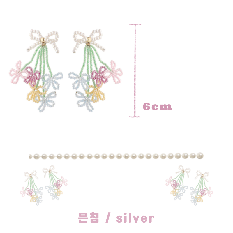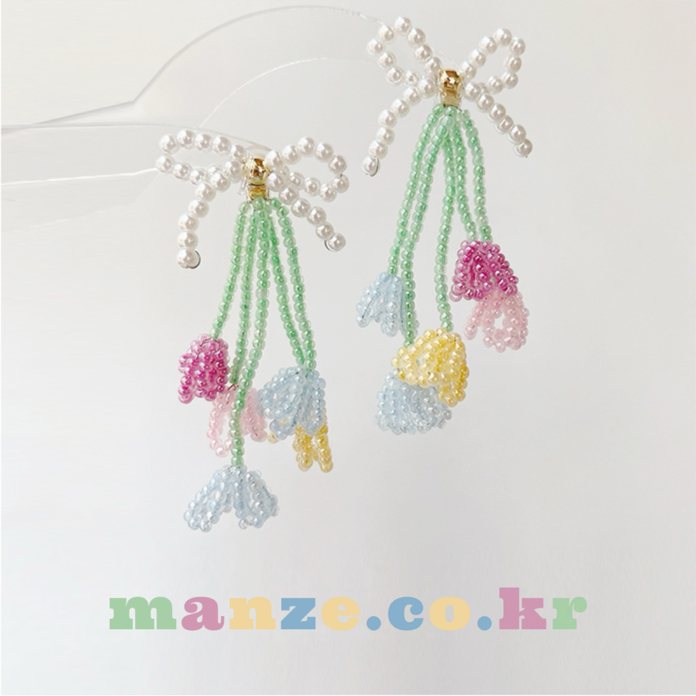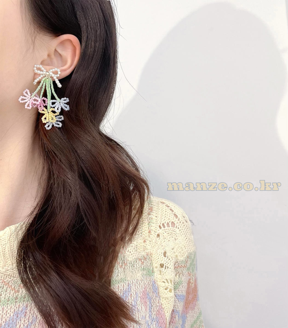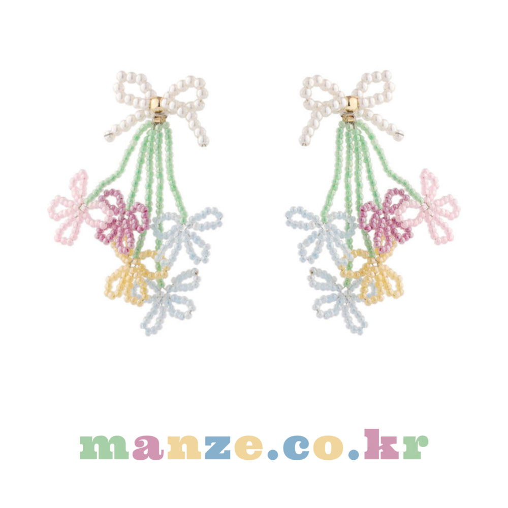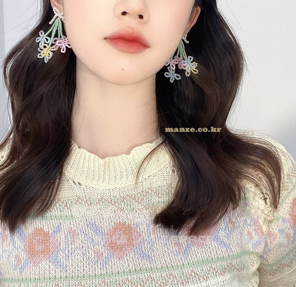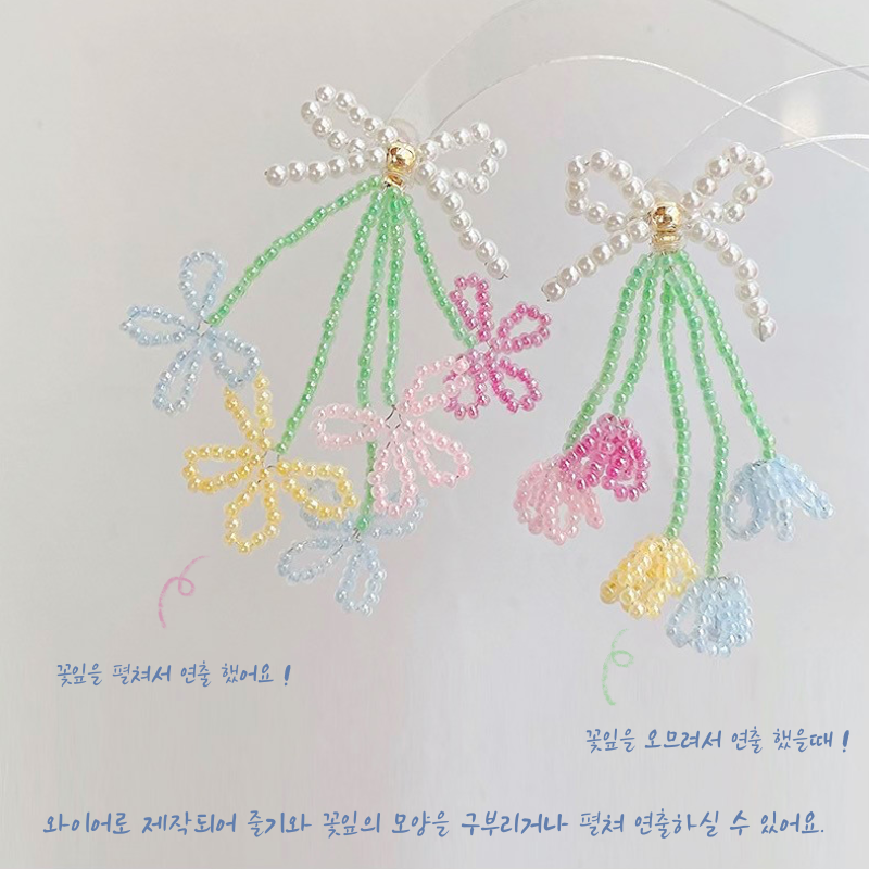 A floral celebration captured in beads –The Spring Bouquet Earrings feature pastel-colored flowers arranged like a tiny blooming bouquet, topped with a beaded bow.Worn by IVE's Gaeul on stage, this piece adds a touch of playful elegance to your daily or special occasion looks.