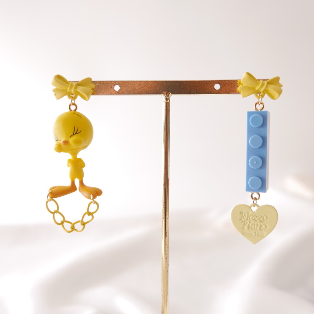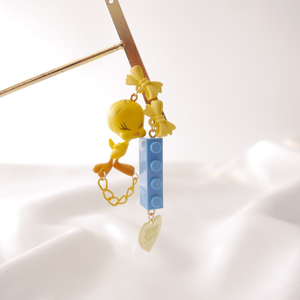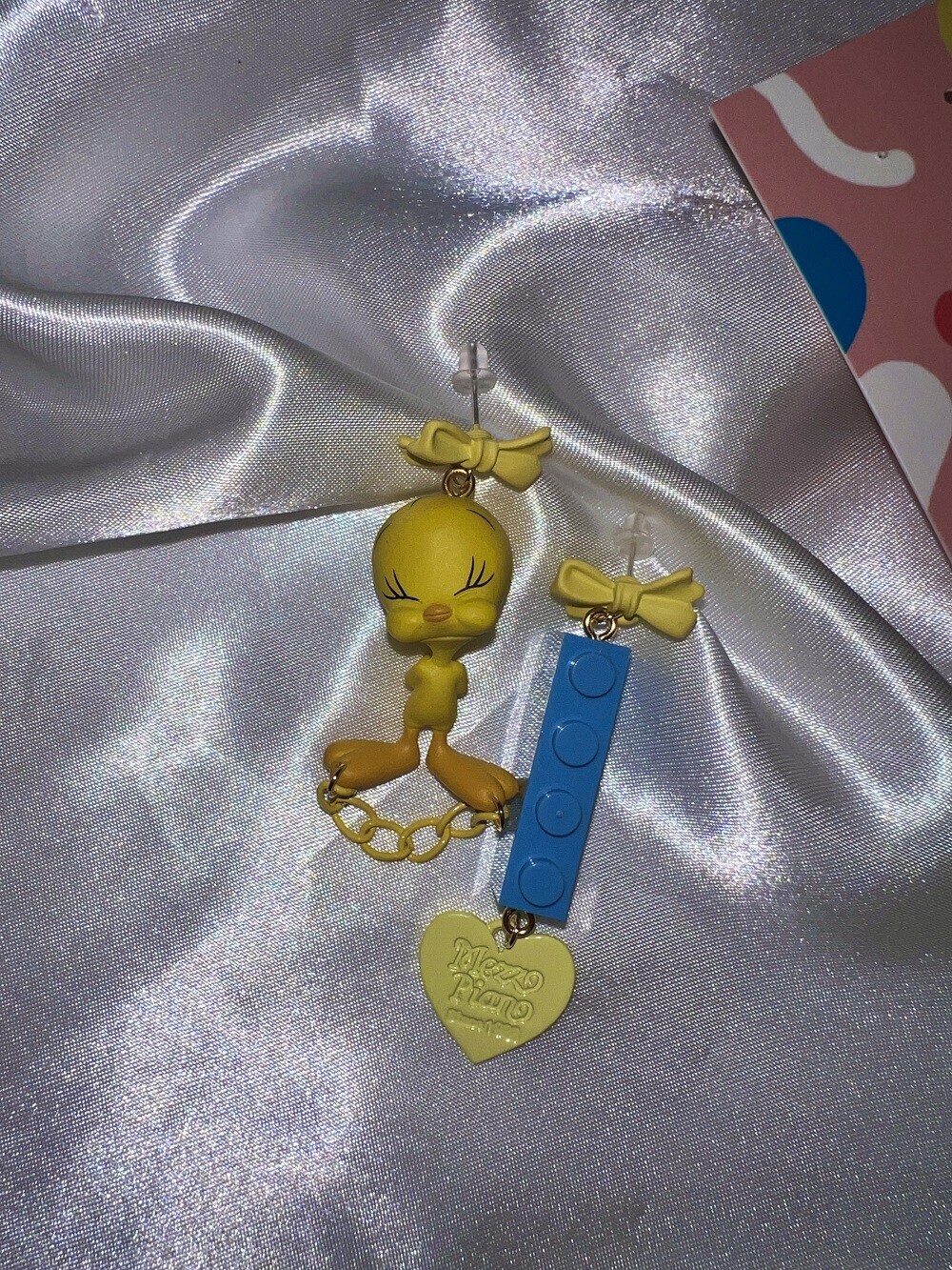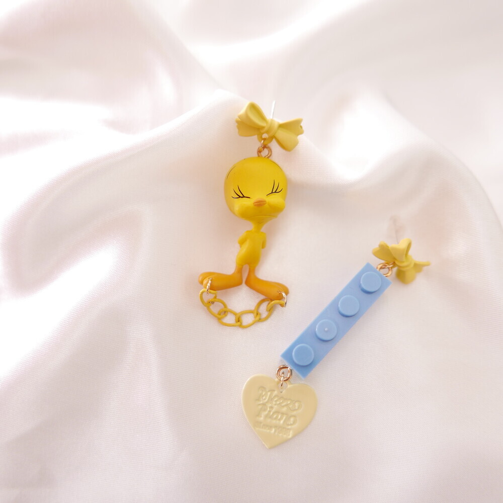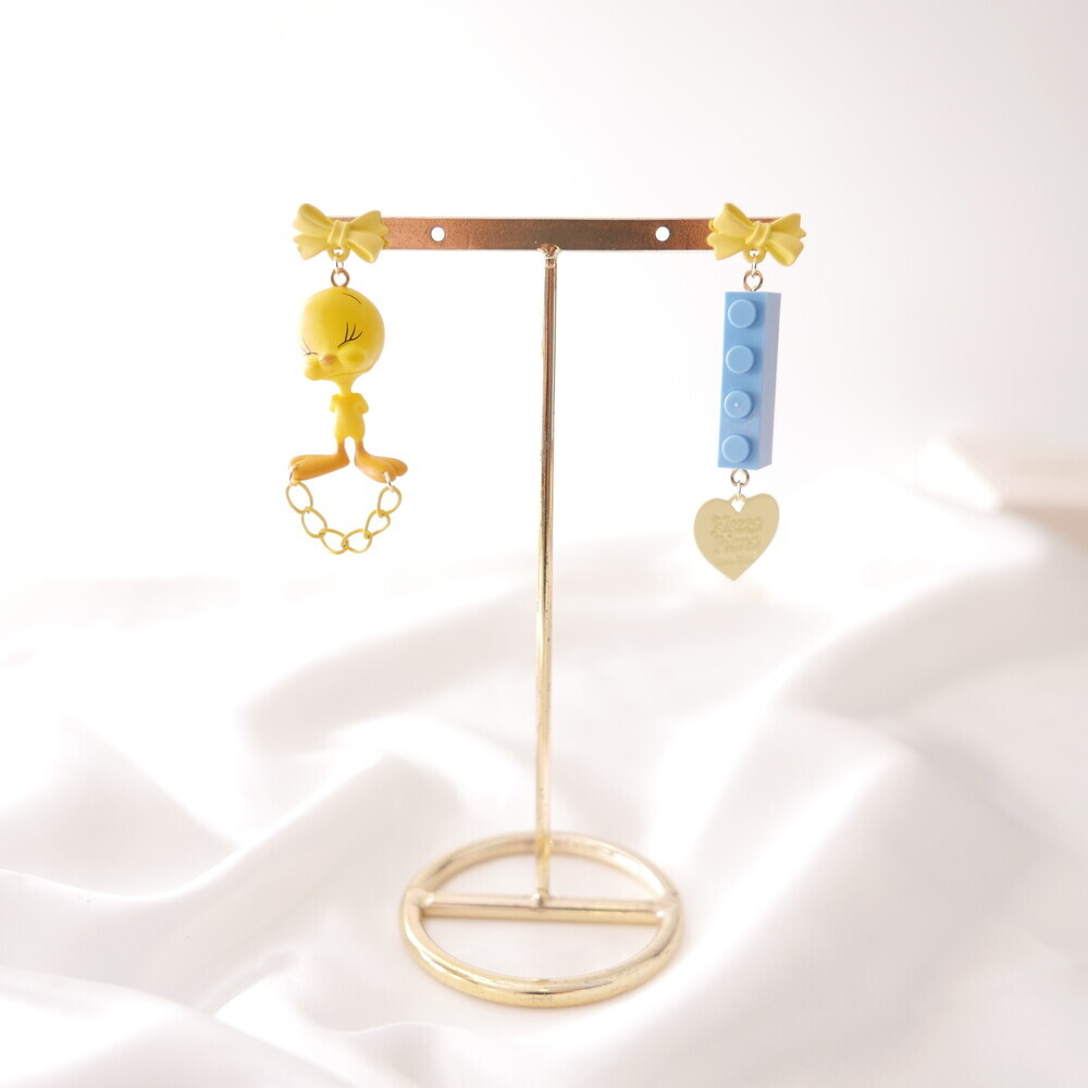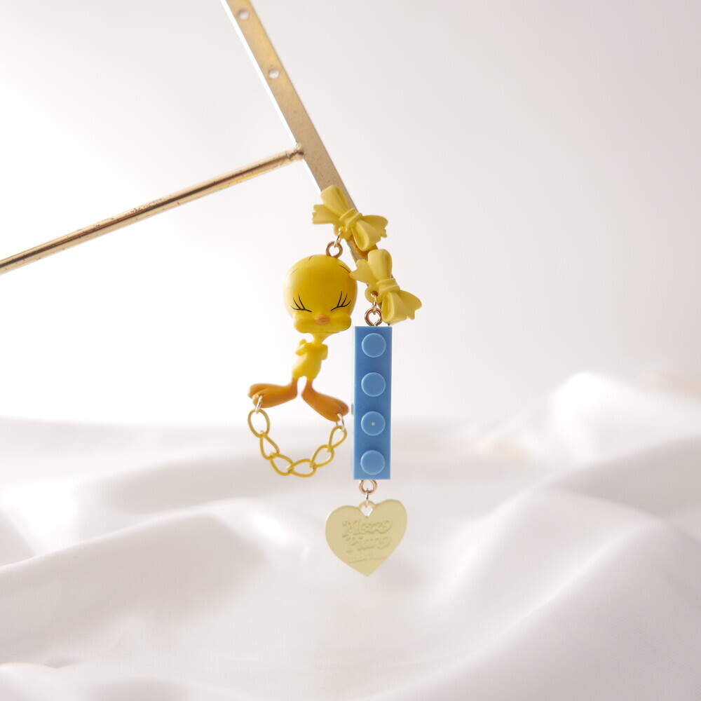 A charming and quirky pair of earrings featuring the adorable face of Tweety ๐. With yellow ribbon-style studs, playful chain and heart details, and a contrasting blue LEGO-style charm, this piece delivers a fun and kitschy vibe. Perfect for lovers of character accessories and unique styles.