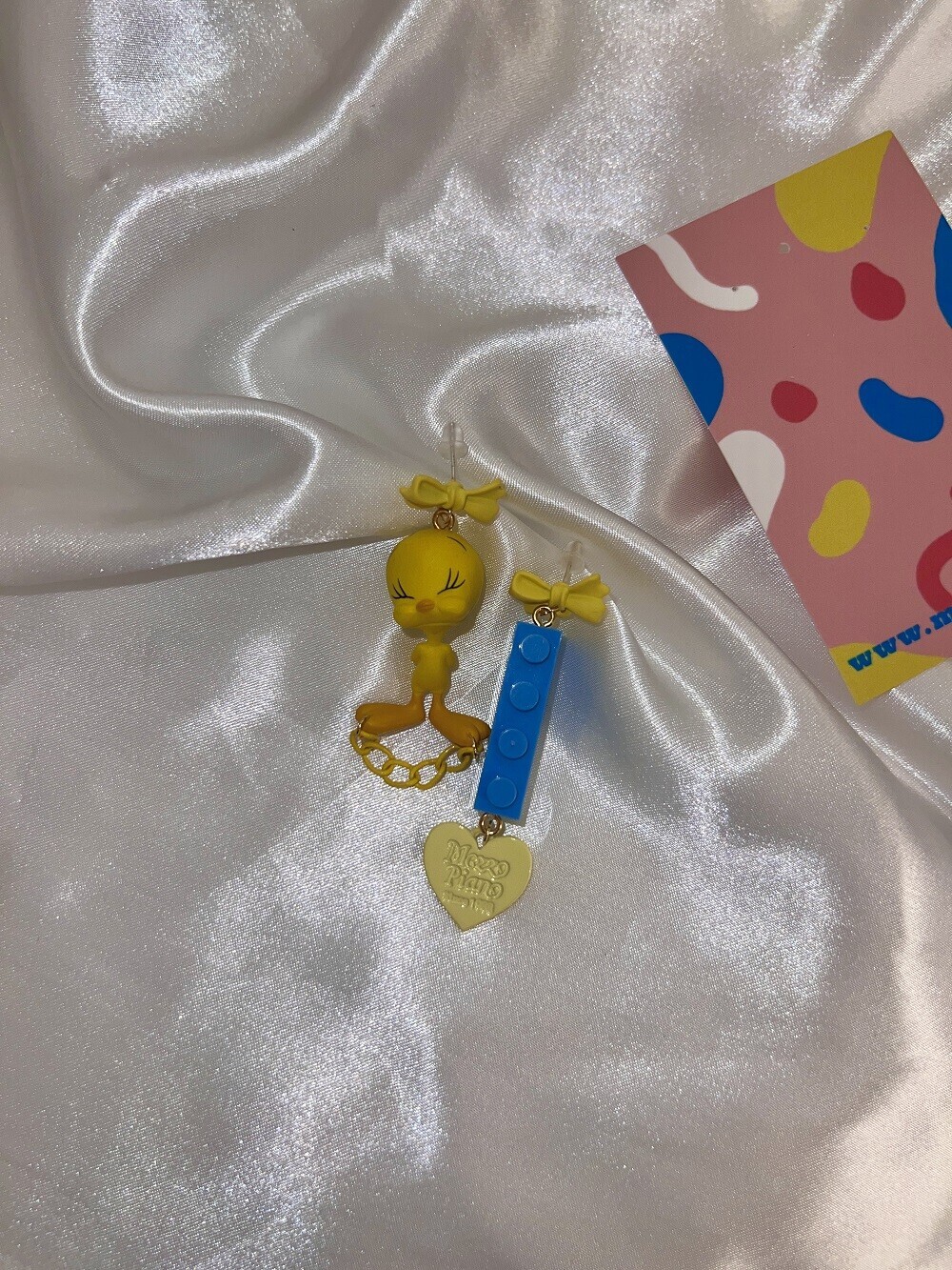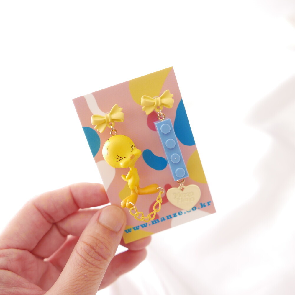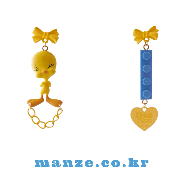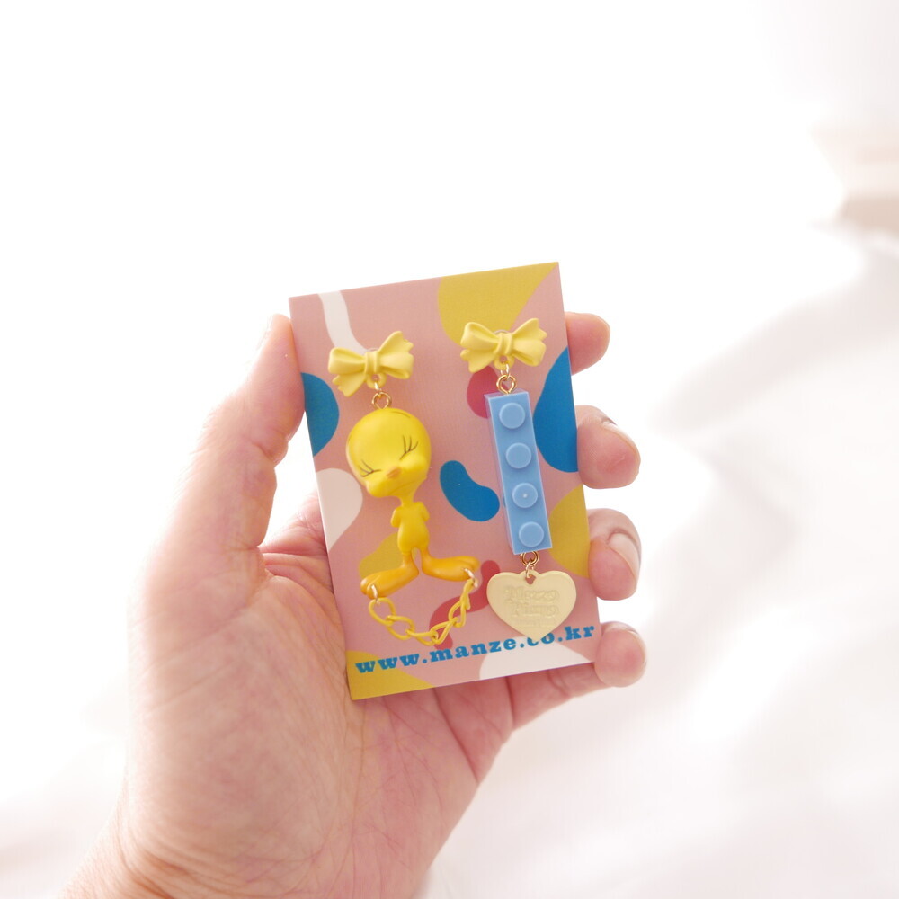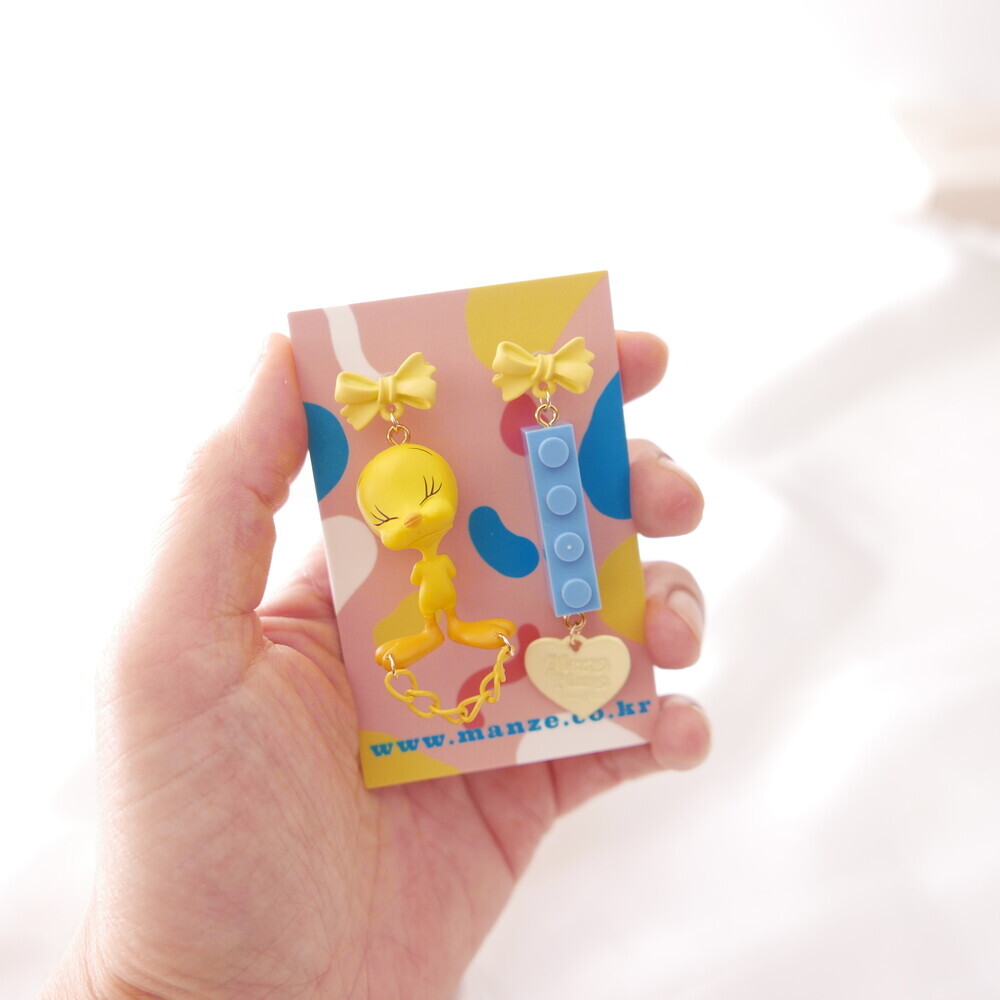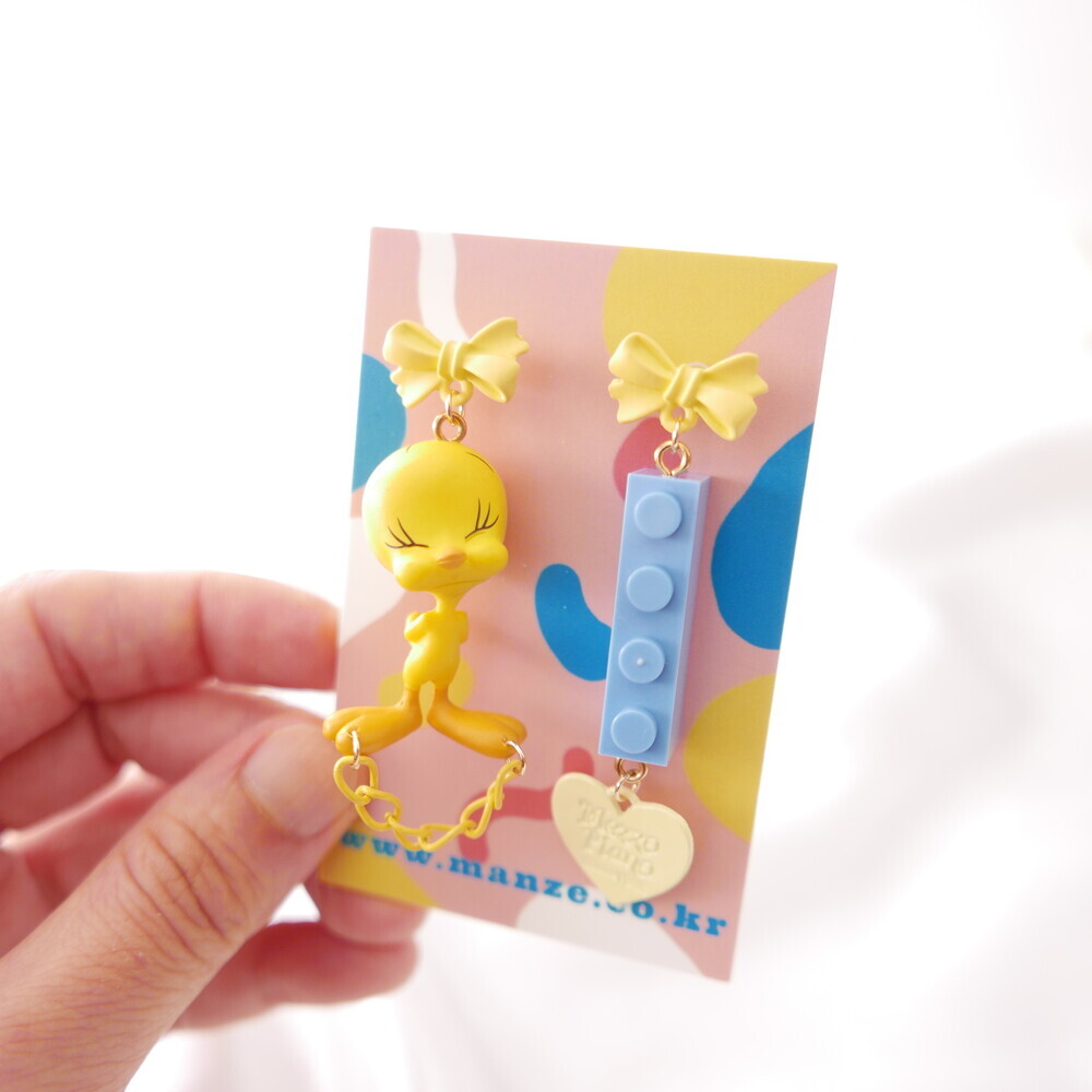 A charming and quirky pair of earrings featuring the adorable face of Tweety ๐. With yellow ribbon-style studs, playful chain and heart details, and a contrasting blue LEGO-style charm, this piece delivers a fun and kitschy vibe. Perfect for lovers of character accessories and unique styles.