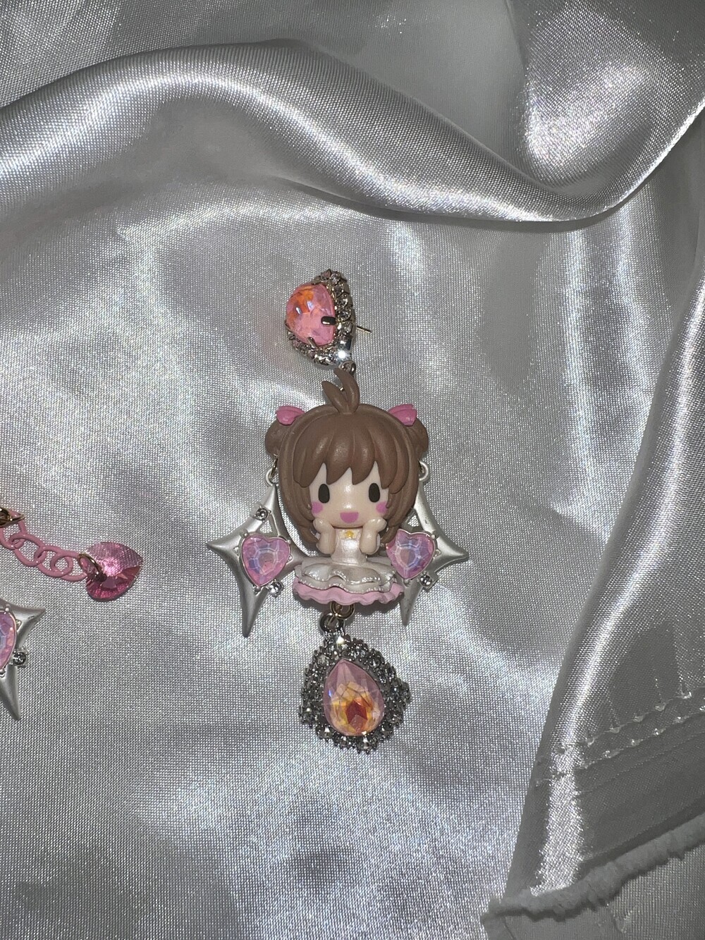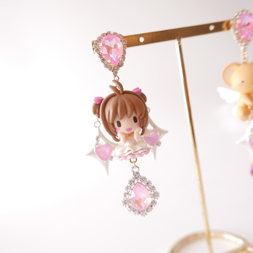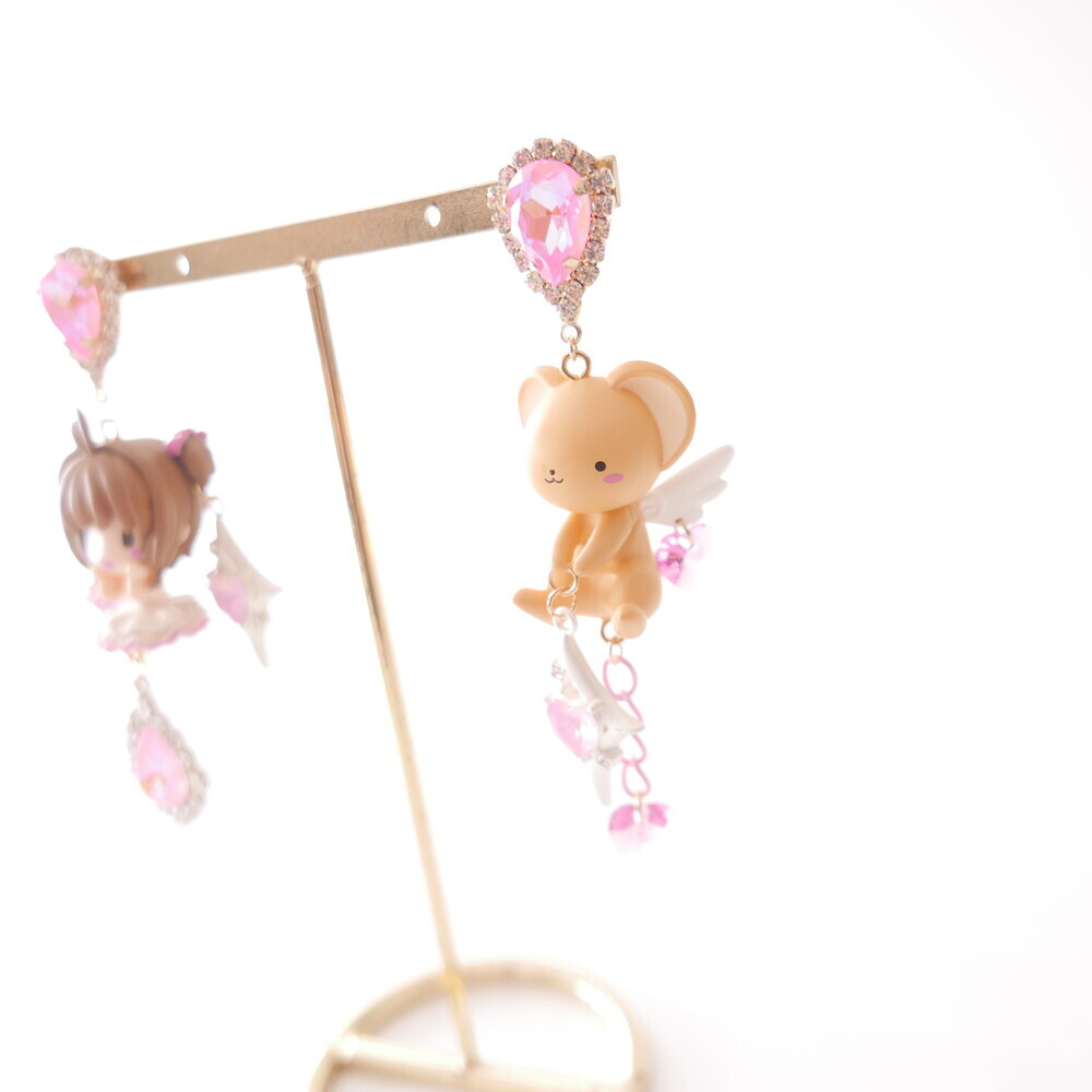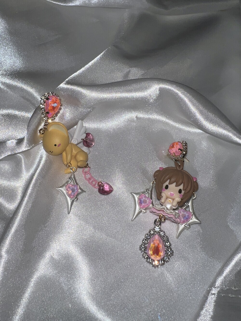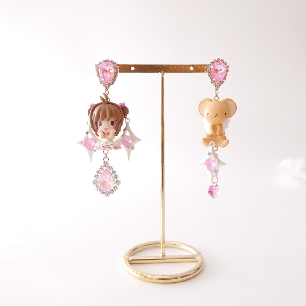 Featuring the beloved duo – Sakura and Kero – from the world of Cardcaptor Sakura, these asymmetric earrings are crafted with glossy crystals, charming character drops, and star-like accents. A dream piece for lovers of cute, nostalgic, and eye-catching accessories!