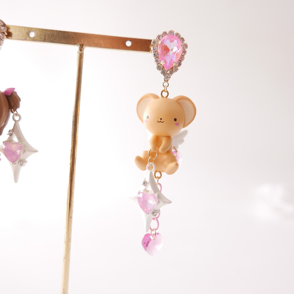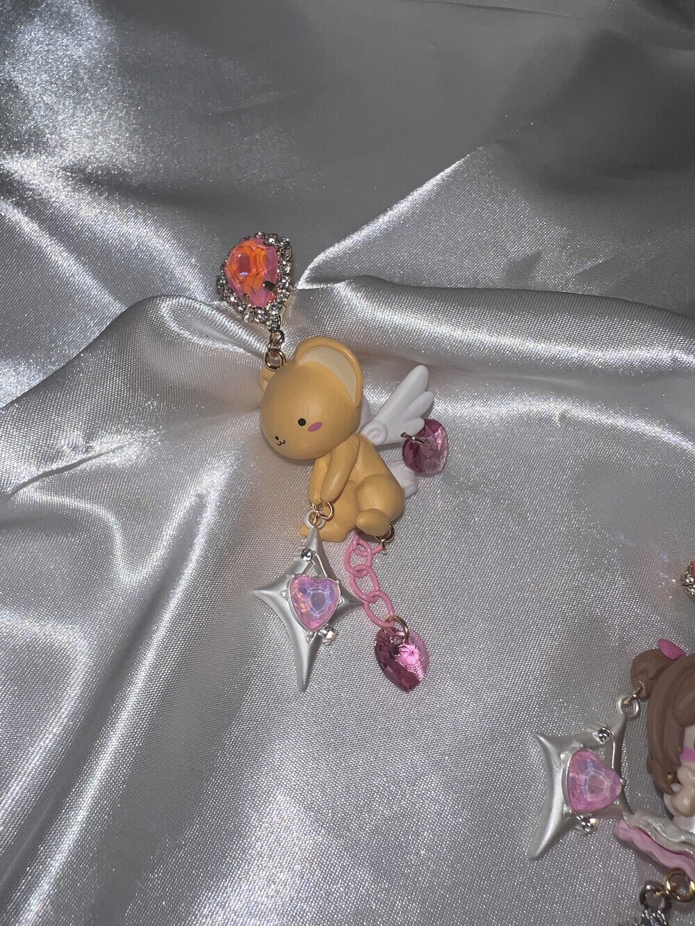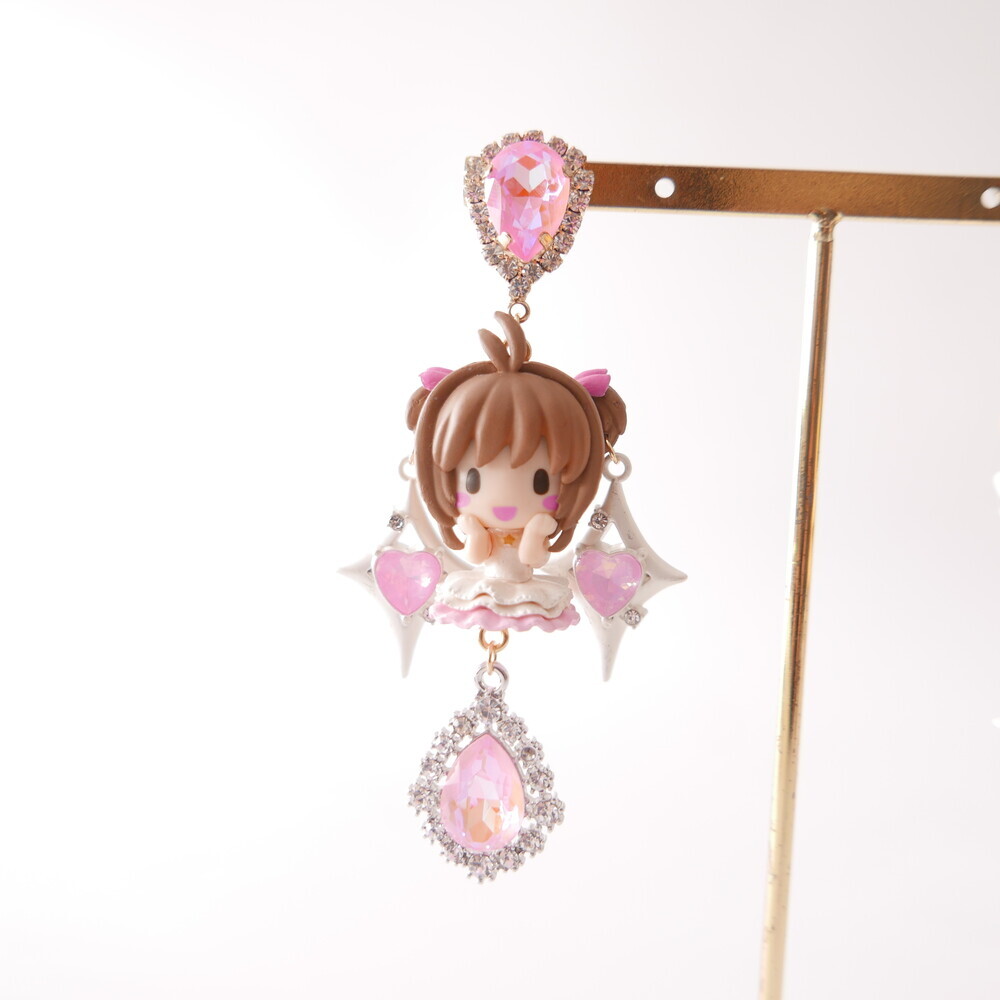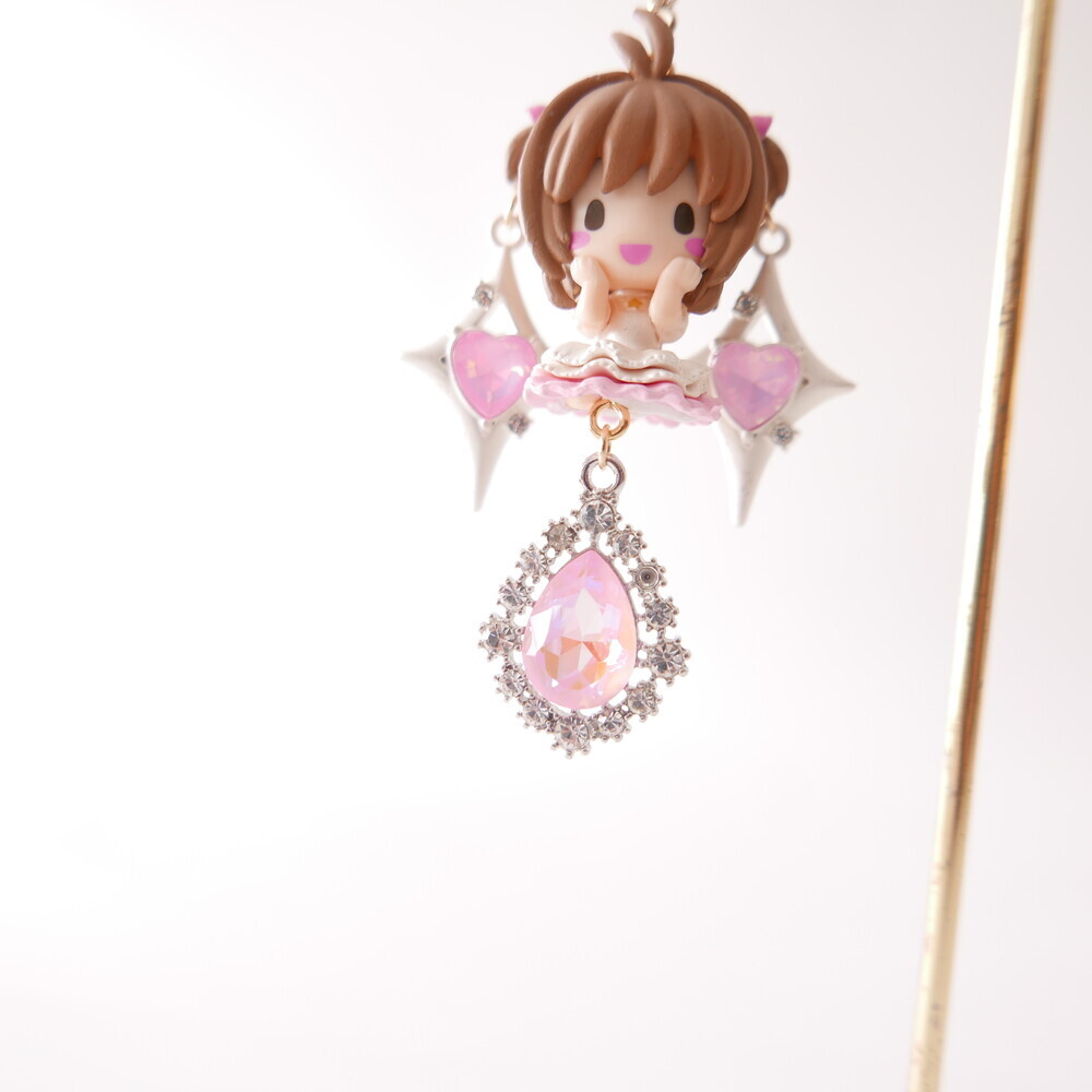 Featuring the beloved duo – Sakura and Kero – from the world of Cardcaptor Sakura, these asymmetric earrings are crafted with glossy crystals, charming character drops, and star-like accents. A dream piece for lovers of cute, nostalgic, and eye-catching accessories!