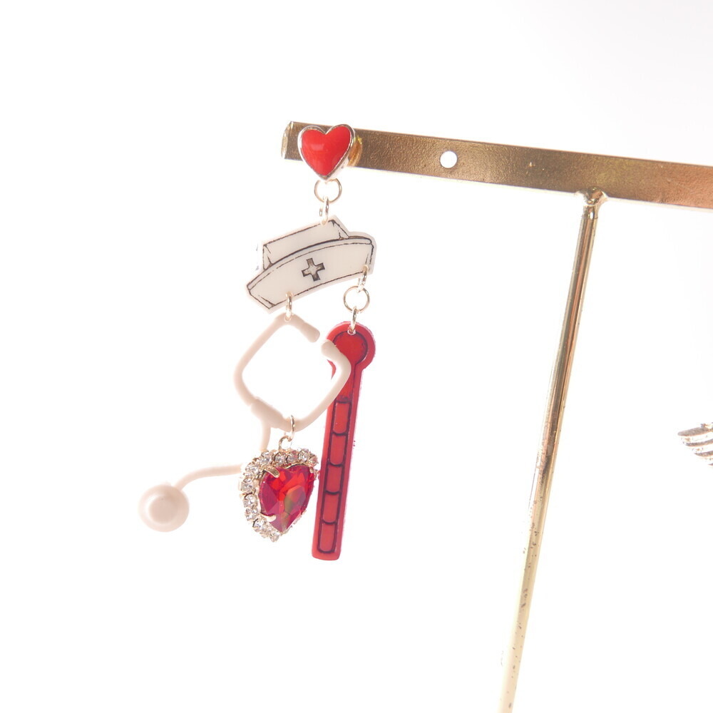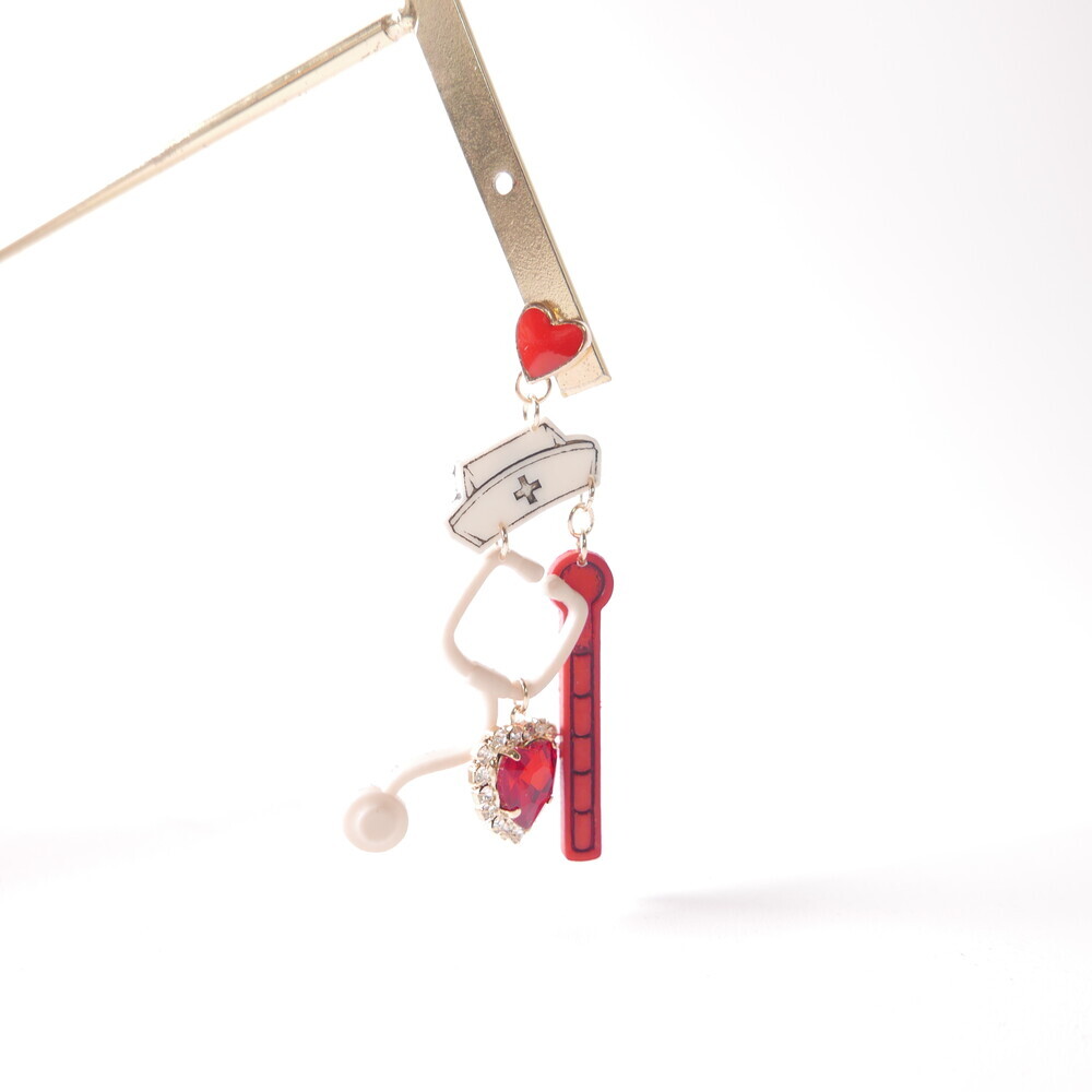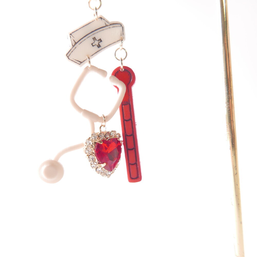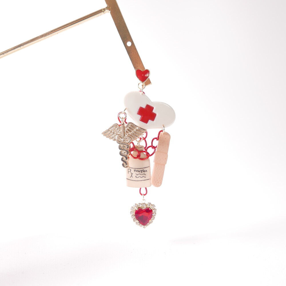 Step into the cutest ER ever with these Love Hospital earrings, packed with playful medical motifs like a nurse cap, stethoscope, thermometer, heart-shaped crystals, bandages, and a red cross. These asymmetrical statement earrings are a kitsch lover’s dream, combining charm and humor with eye-catching details.