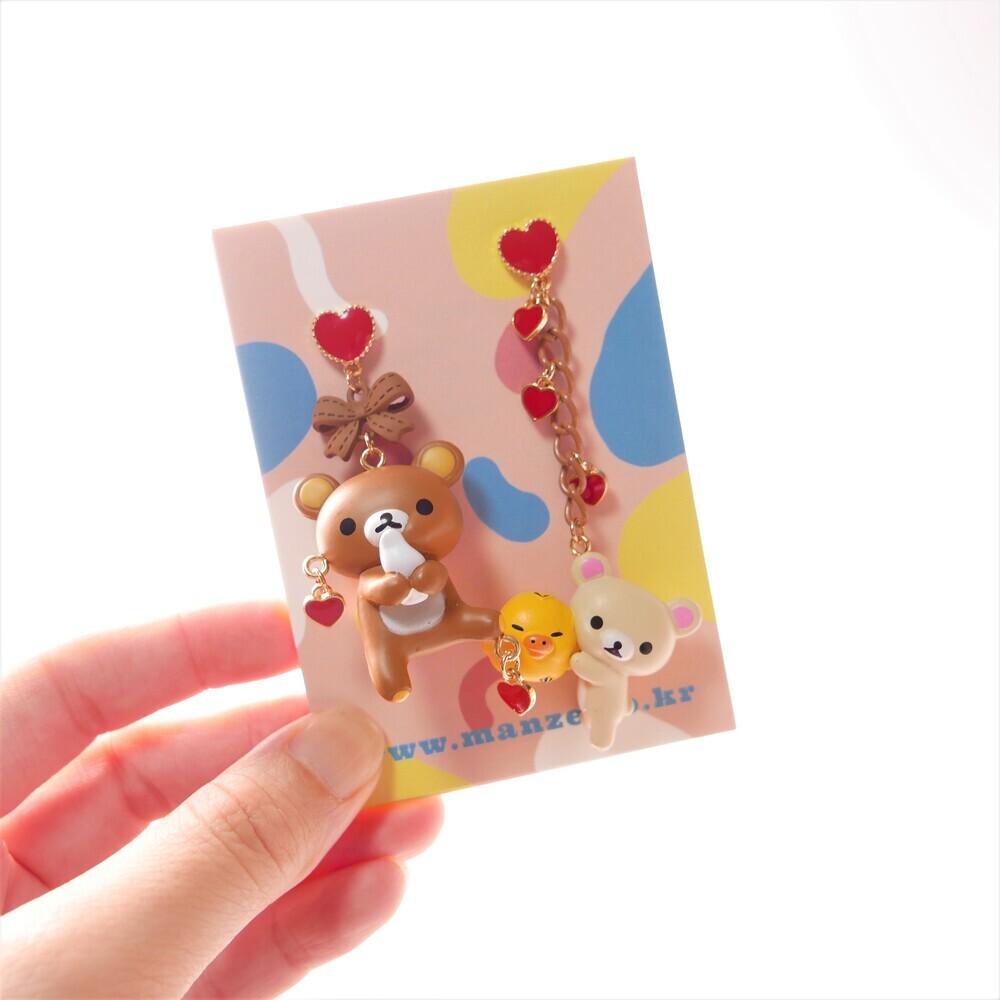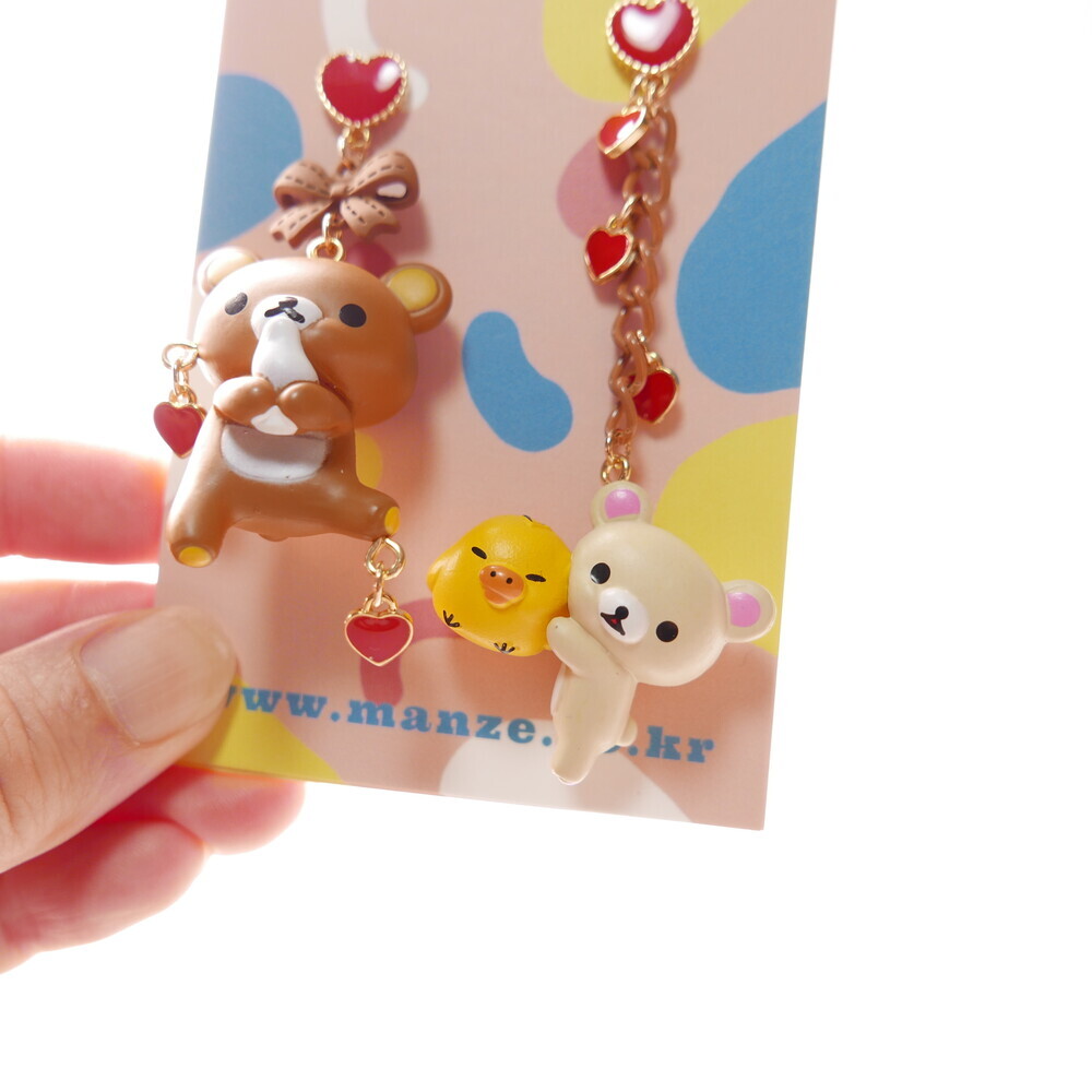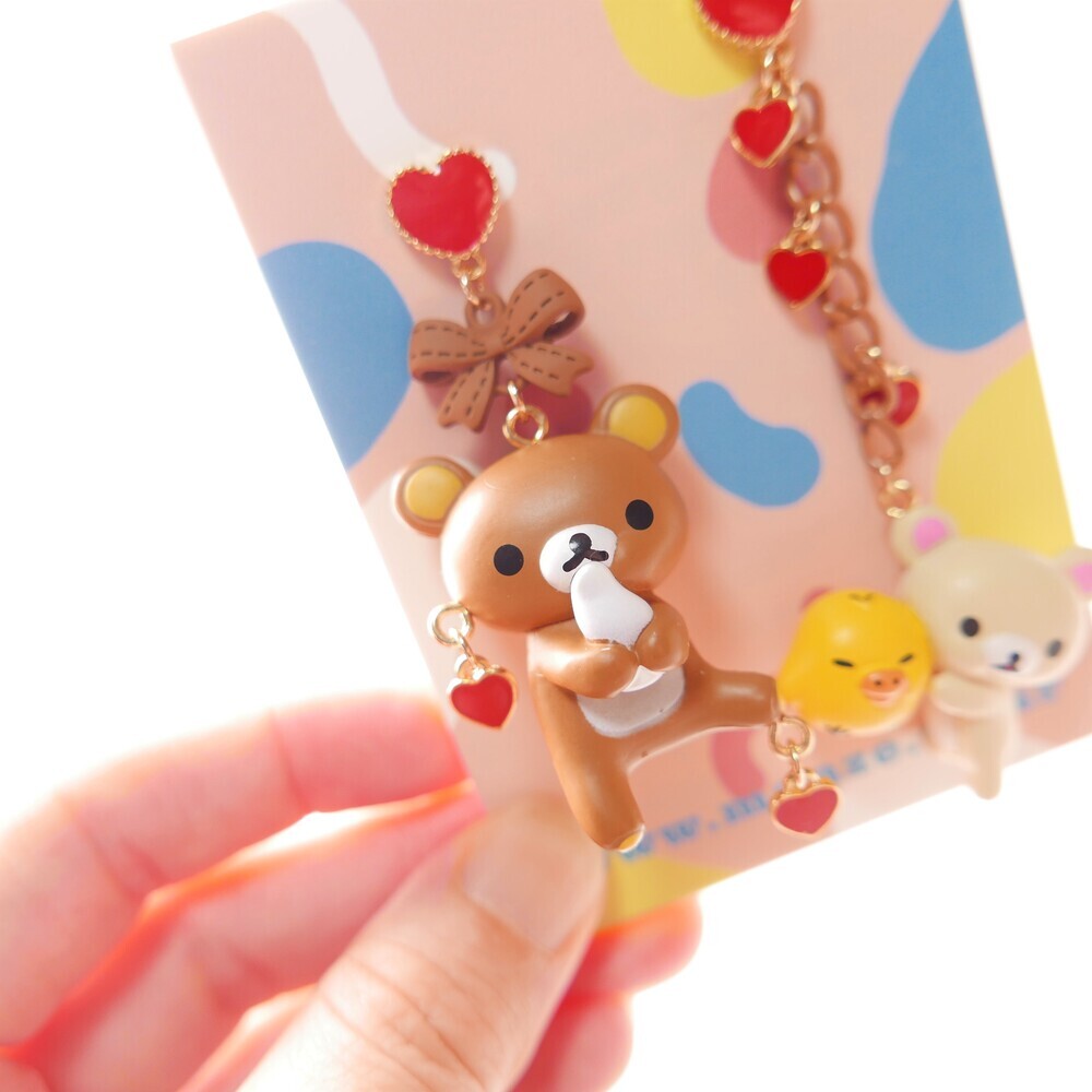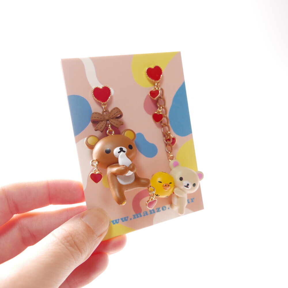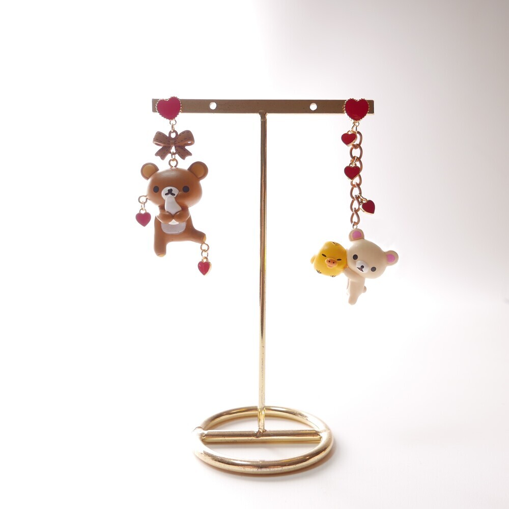 Adorn your ears with sweet affection! These mismatched earrings feature Rilakkuma and Korilakkuma with a tiny yellow chick, each paired with dangling red hearts and charming details. With a rich brown-and-red palette and playful shapes, these earrings are perfect for those who love character jewelry with a whimsical twist.