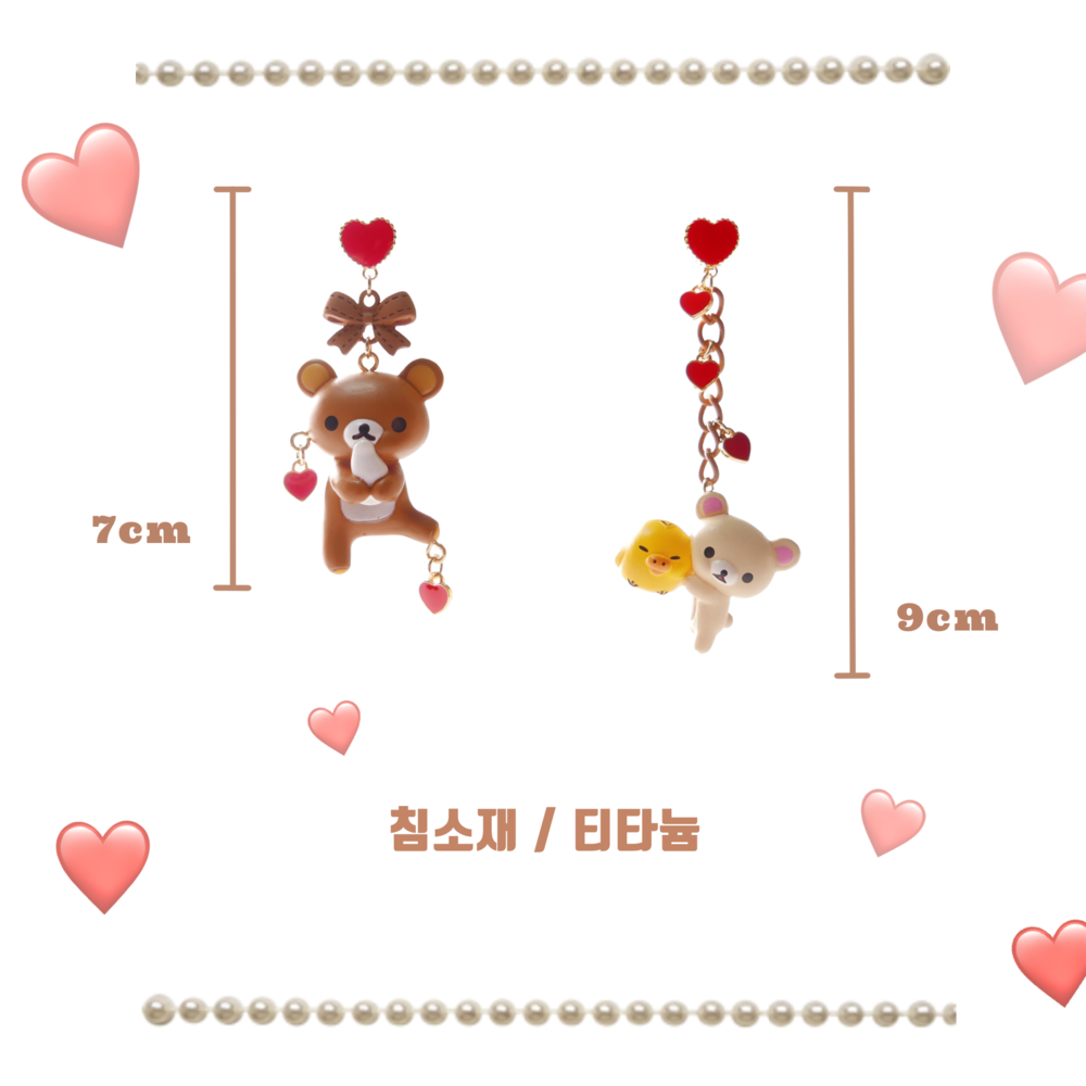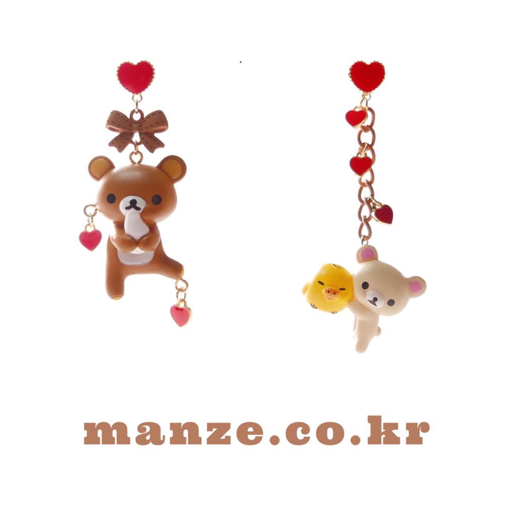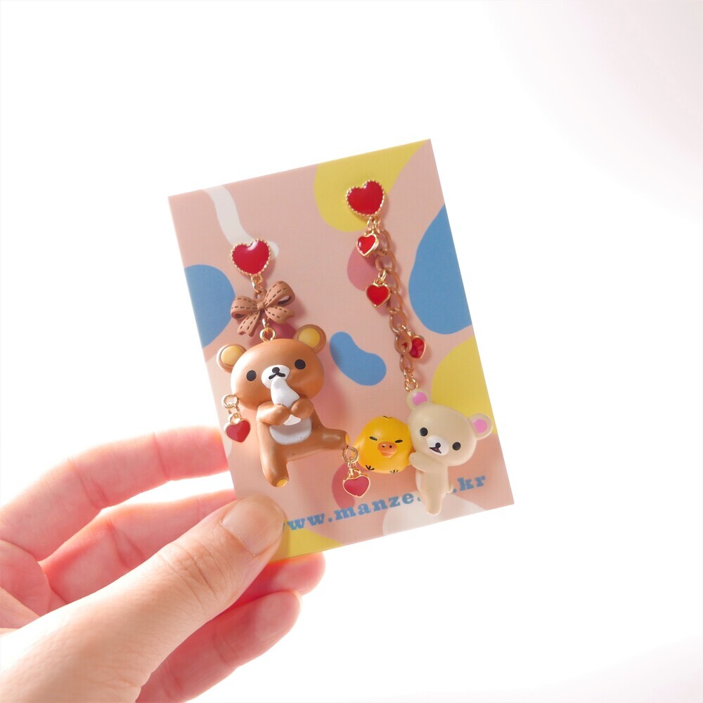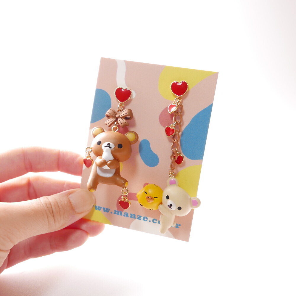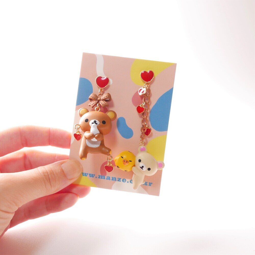 Adorn your ears with sweet affection! These mismatched earrings feature Rilakkuma and Korilakkuma with a tiny yellow chick, each paired with dangling red hearts and charming details. With a rich brown-and-red palette and playful shapes, these earrings are perfect for those who love character jewelry with a whimsical twist.