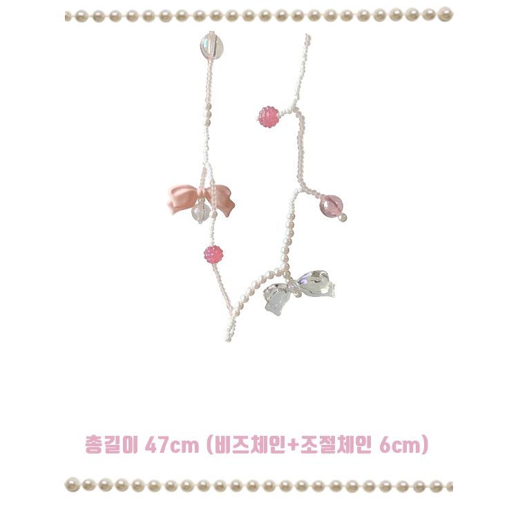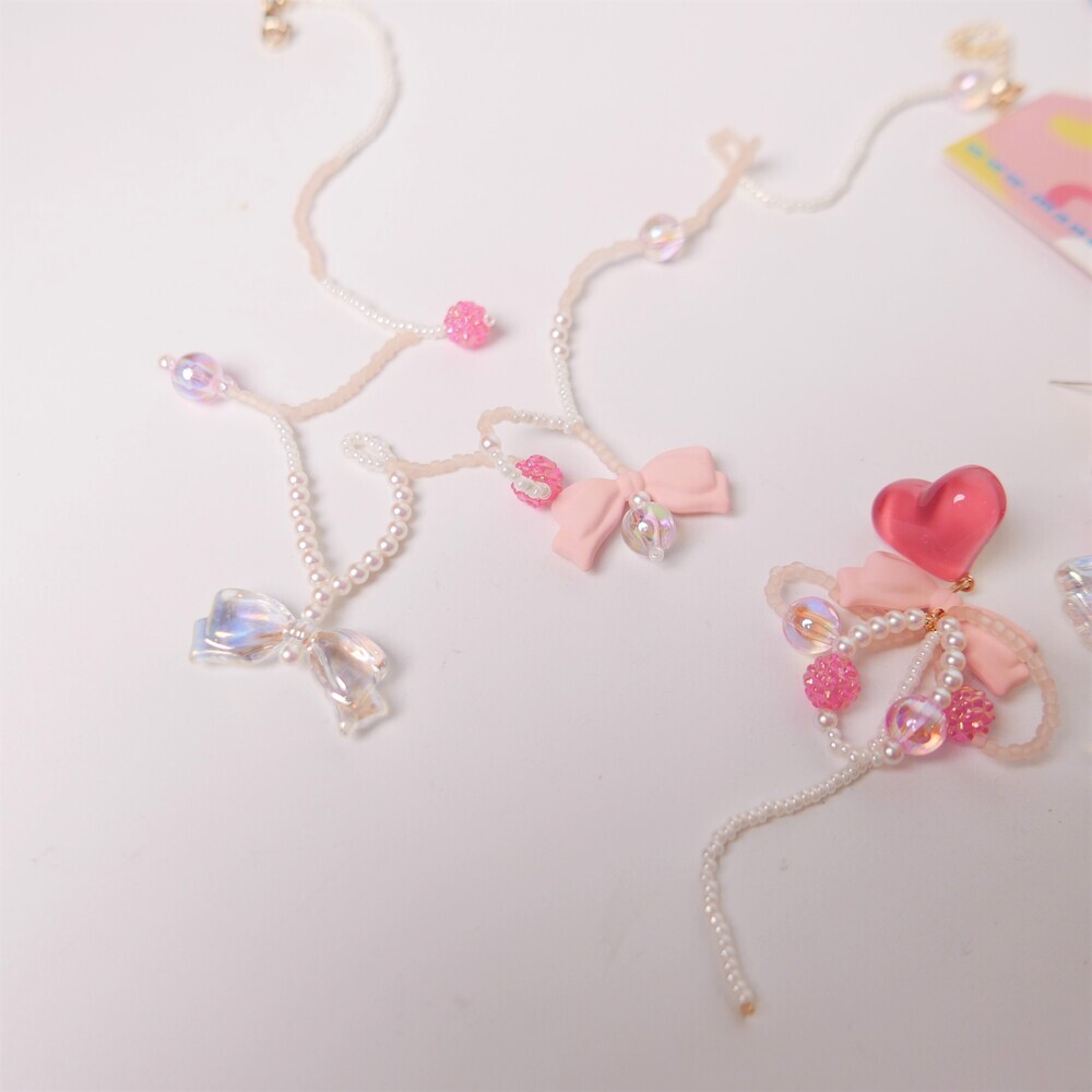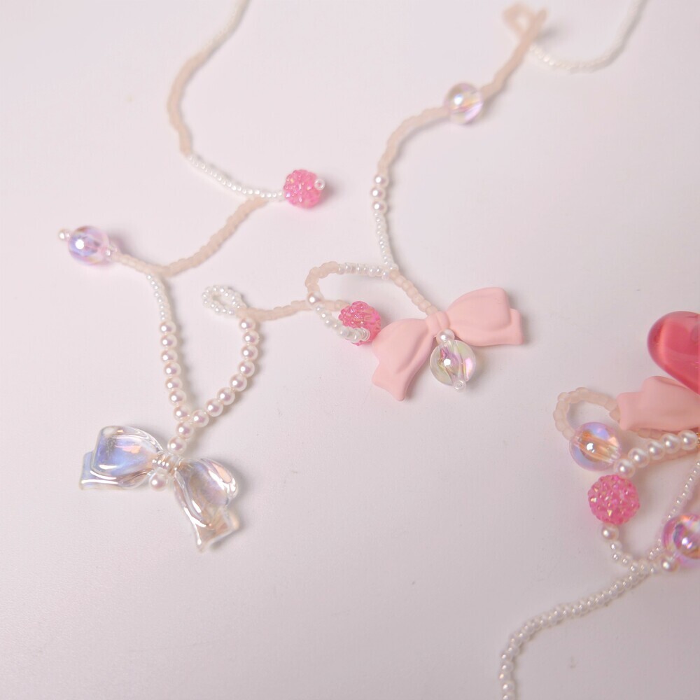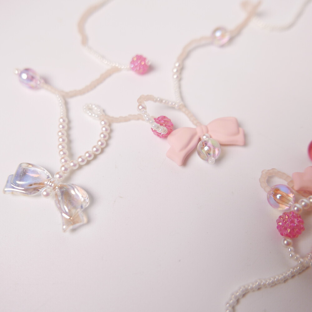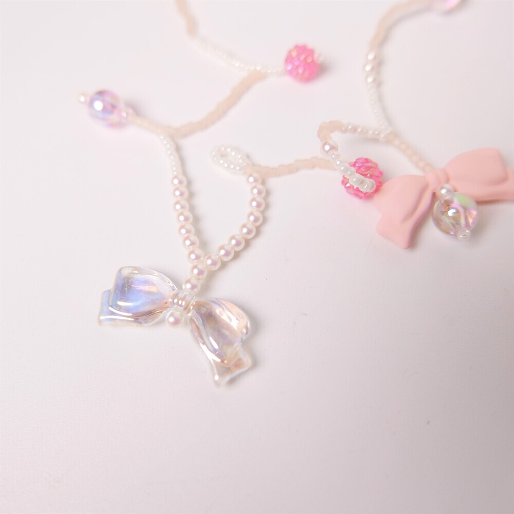 A sweet and playful necklace featuring pink and clear beads, pastel ribbon accents, and glossy charms. The delicate pearl-style chain adds elegance, while the adjustable 6cm extension allows for a comfortable fit. With its dreamy, soft color palette and charming details, it's perfect for those who love feminine and whimsical styles.