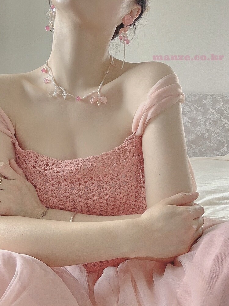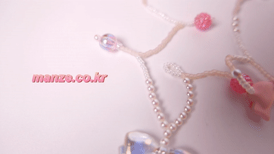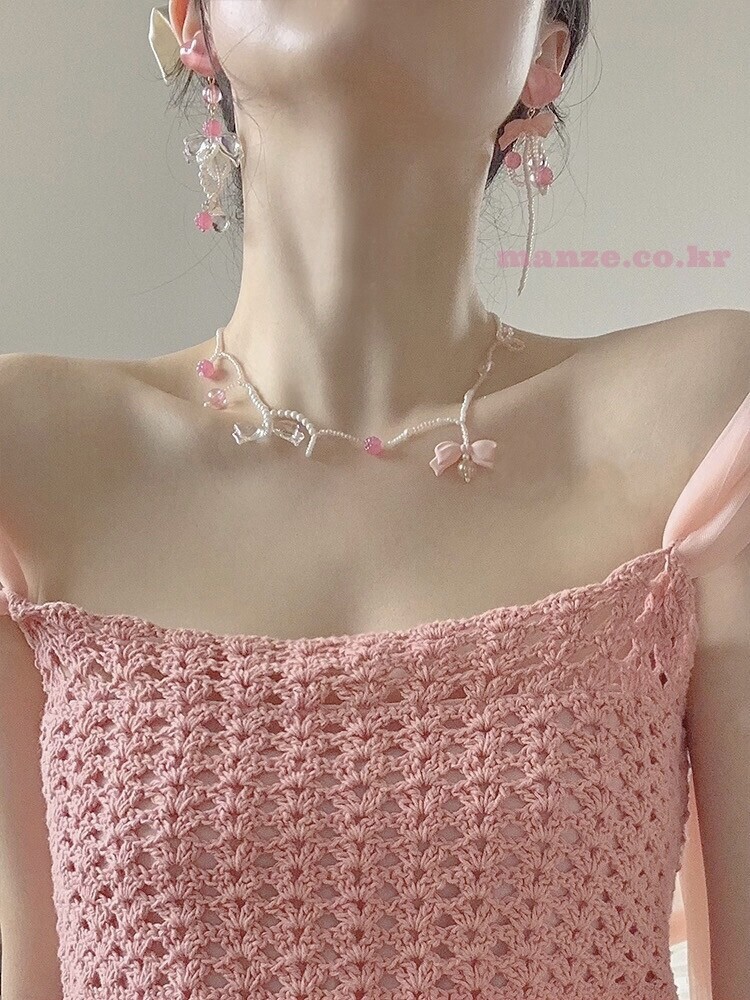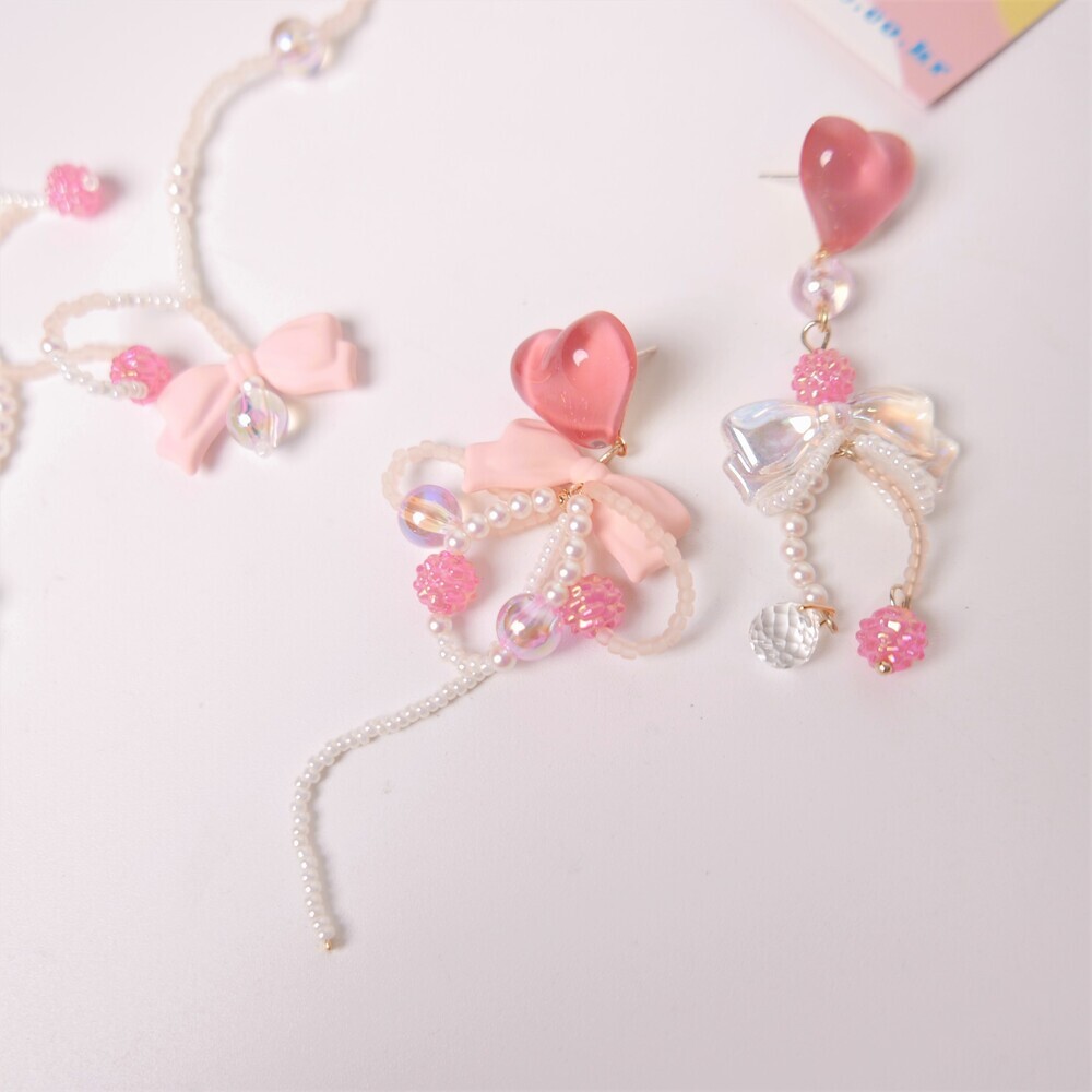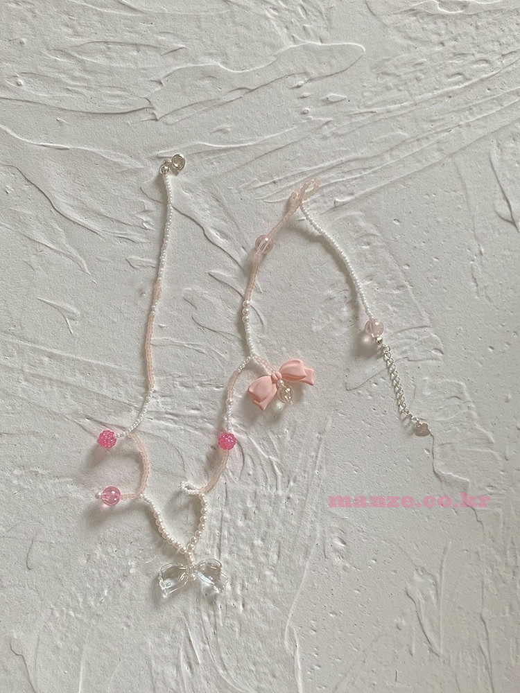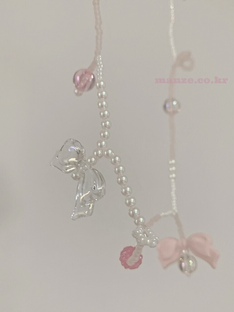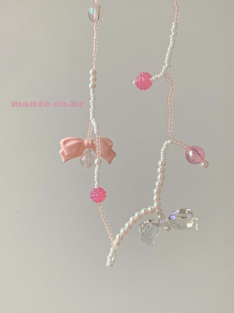 A sweet and playful necklace featuring pink and clear beads, pastel ribbon accents, and glossy charms. The delicate pearl-style chain adds elegance, while the adjustable 6cm extension allows for a comfortable fit. With its dreamy, soft color palette and charming details, it's perfect for those who love feminine and whimsical styles.