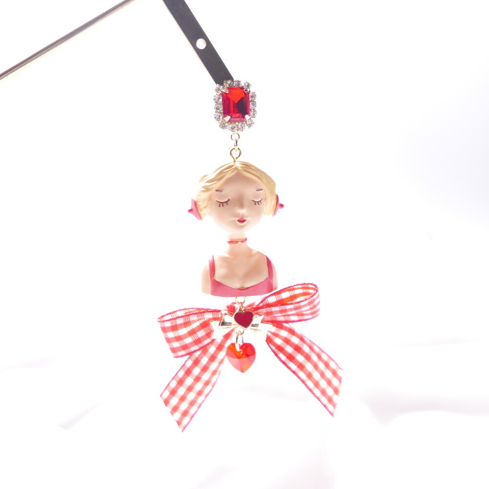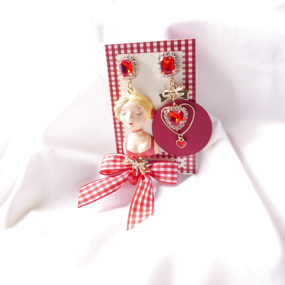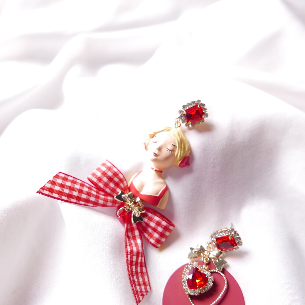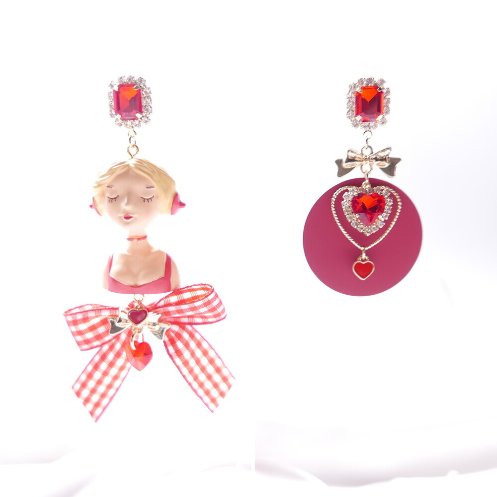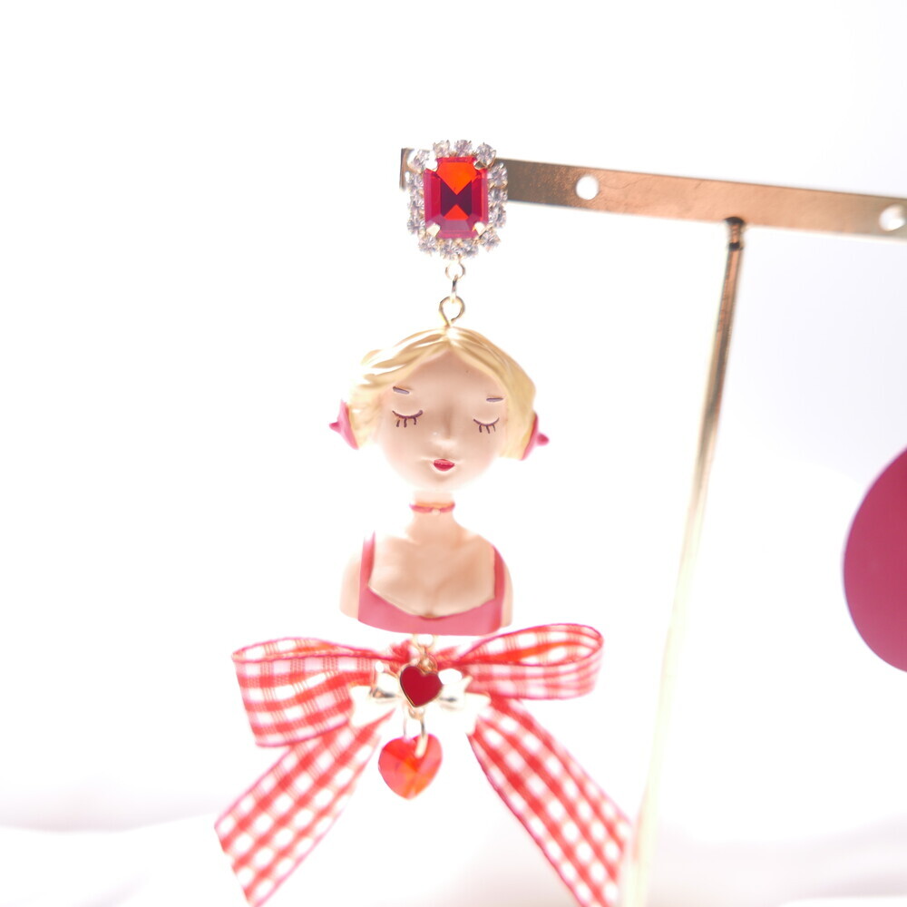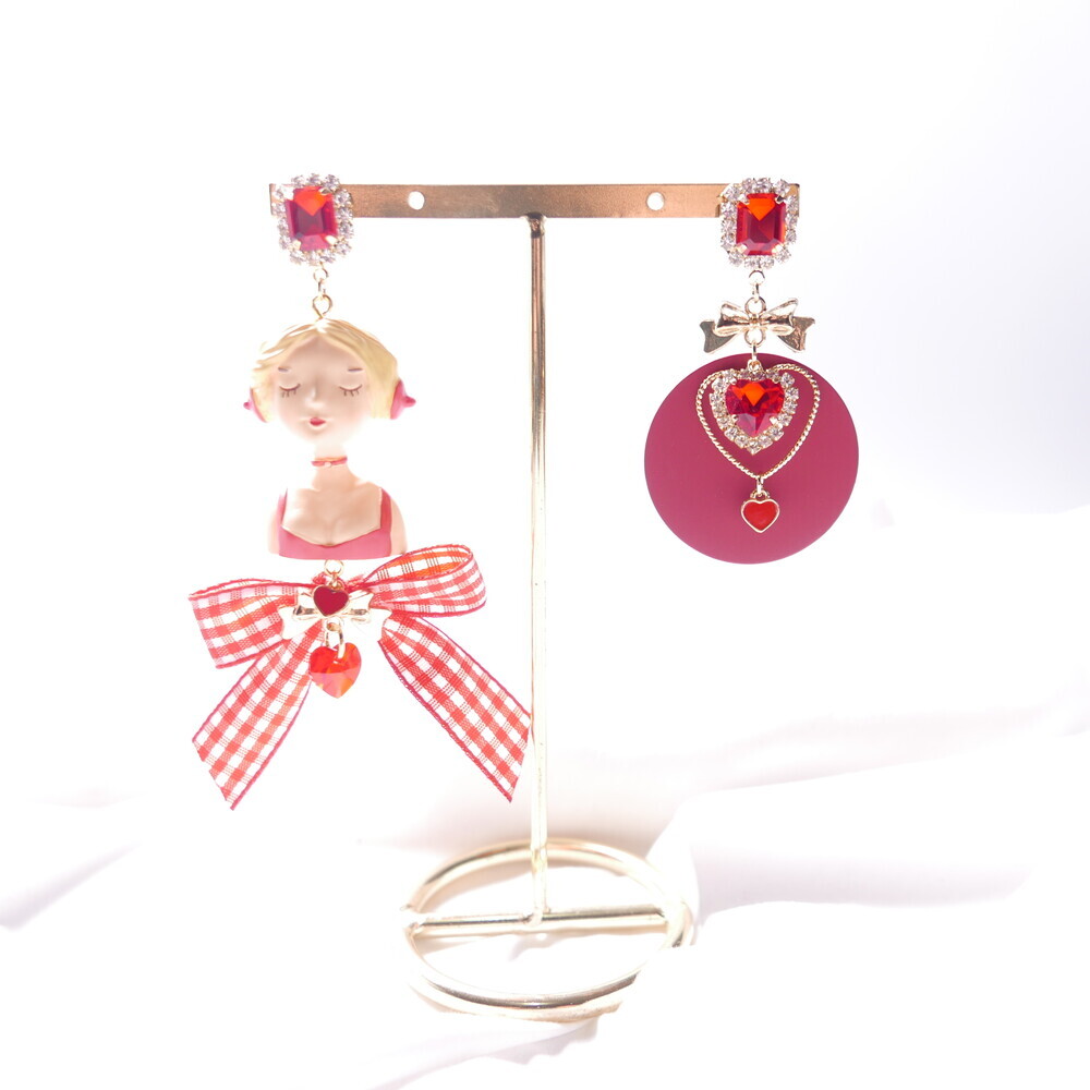These asymmetrical Girl Rose Earrings feature a blonde girl figurine wearing a red top and choker on one side, and playful red heart charms with a bow accent on the other. Delicately decorated with a gingham ribbon, vivid red crystals, and a retro vibe, this set brings a lovely and nostalgic flair to your outfit.