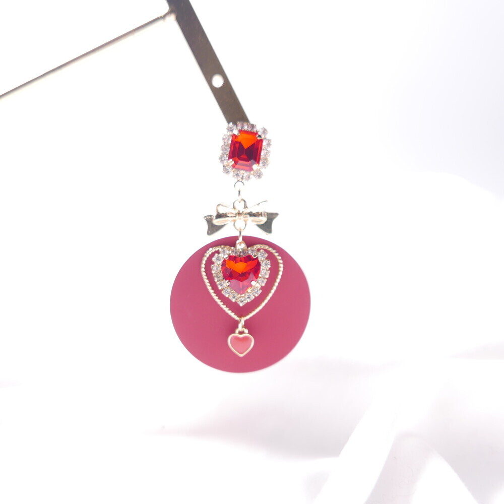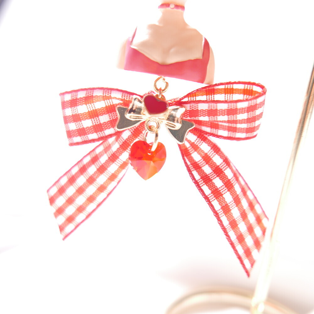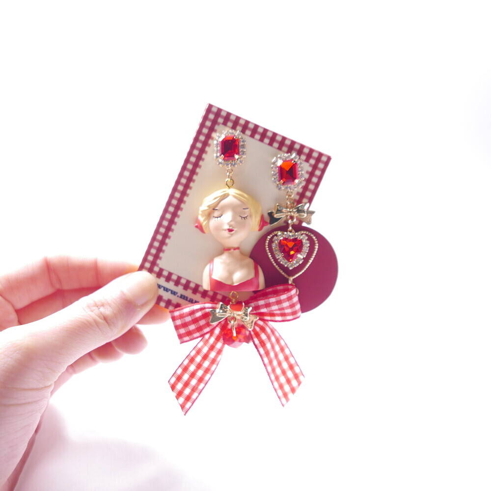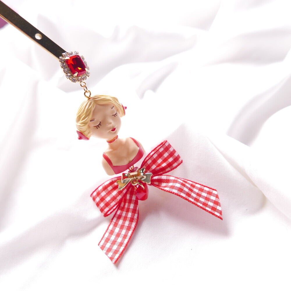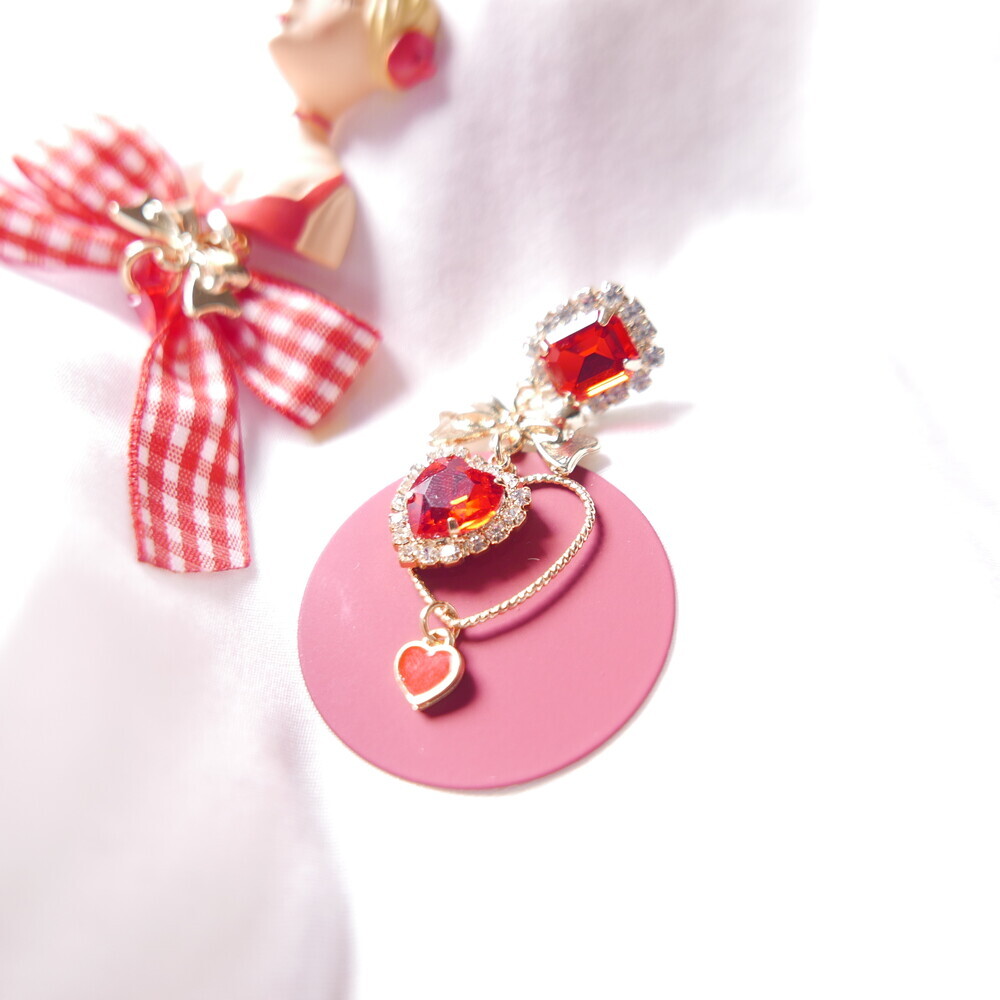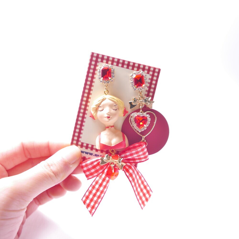 These asymmetrical Girl Rose Earrings feature a blonde girl figurine wearing a red top and choker on one side, and playful red heart charms with a bow accent on the other. Delicately decorated with a gingham ribbon, vivid red crystals, and a retro vibe, this set brings a lovely and nostalgic flair to your outfit.