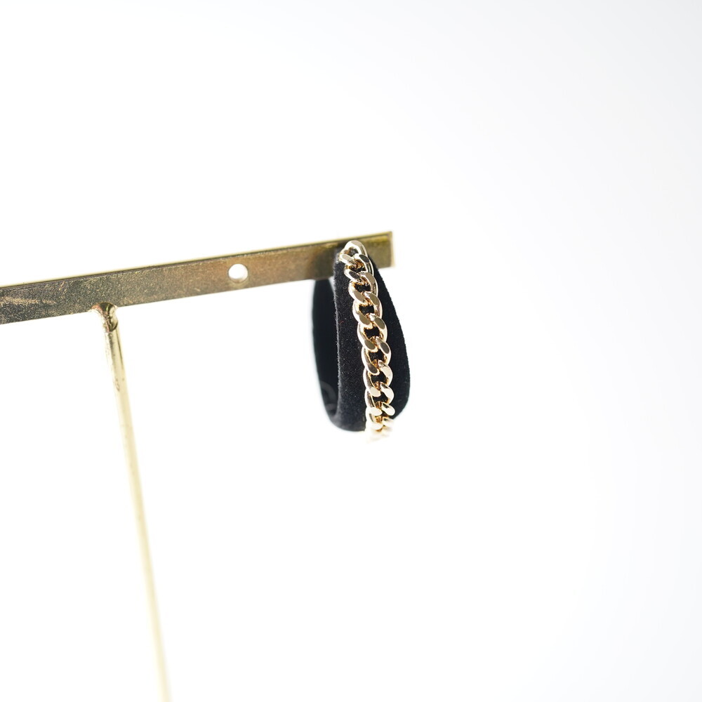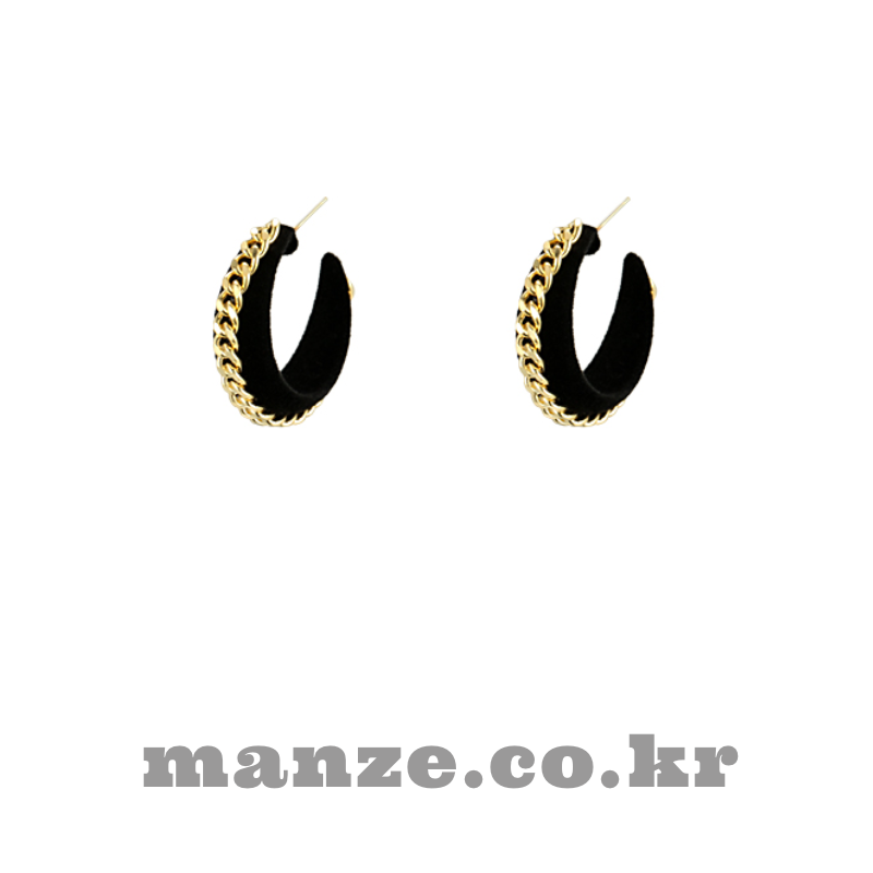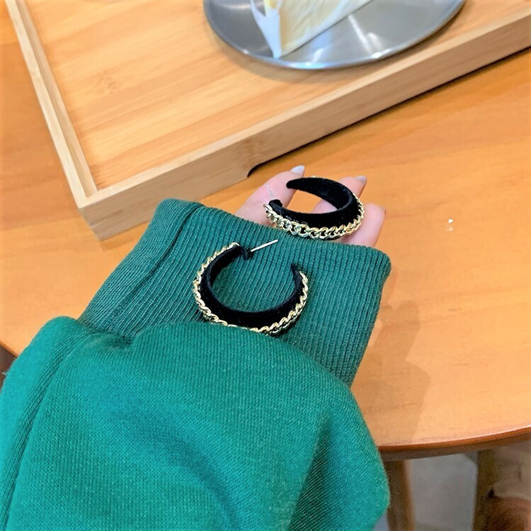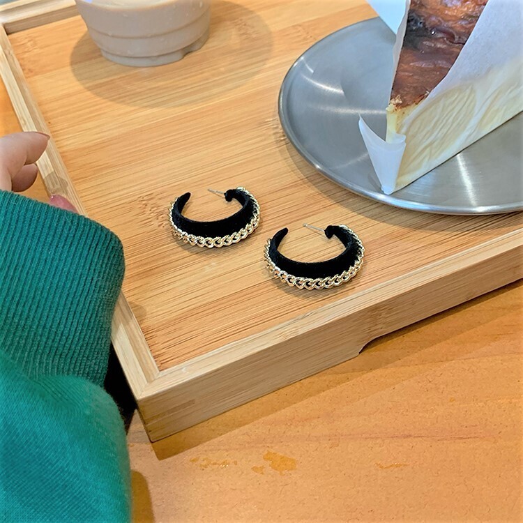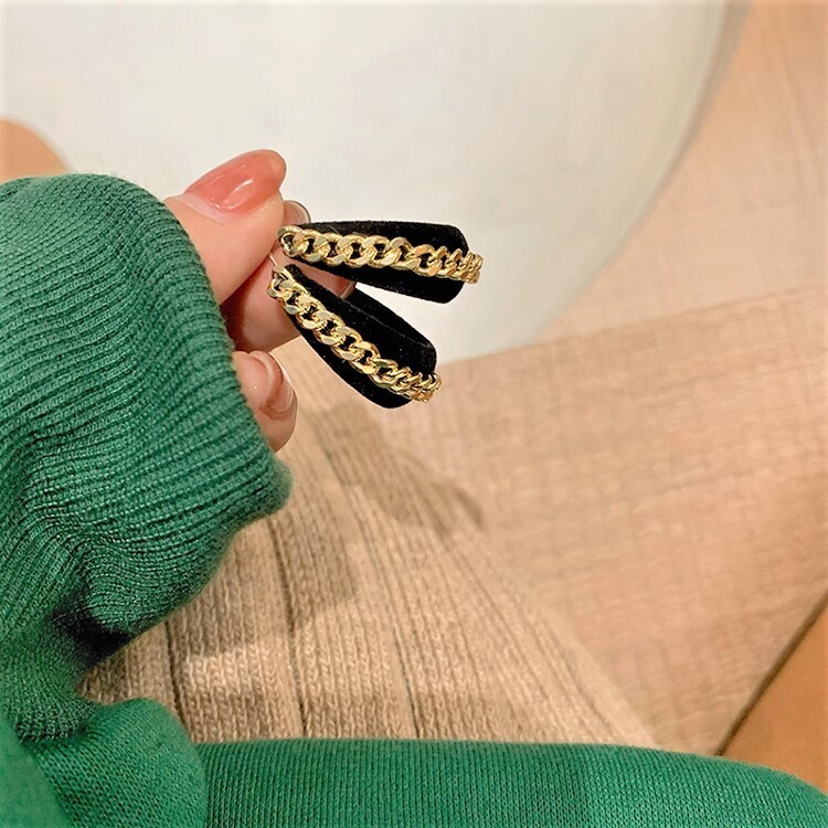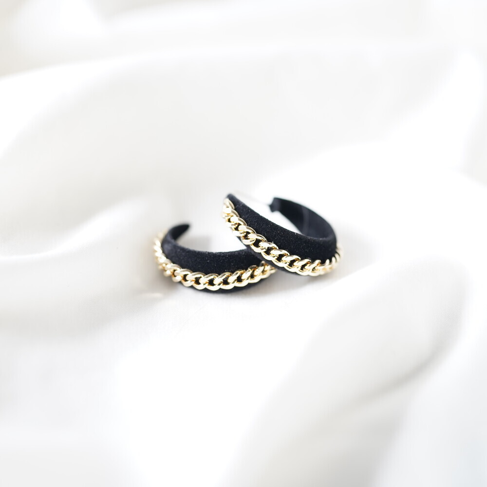 A bold and elegant design featuring a soft velvet base adorned with gold-tone chain detailing. The hoop-style earring combines a luxurious texture with a touch of edge, making it perfect for day or night.