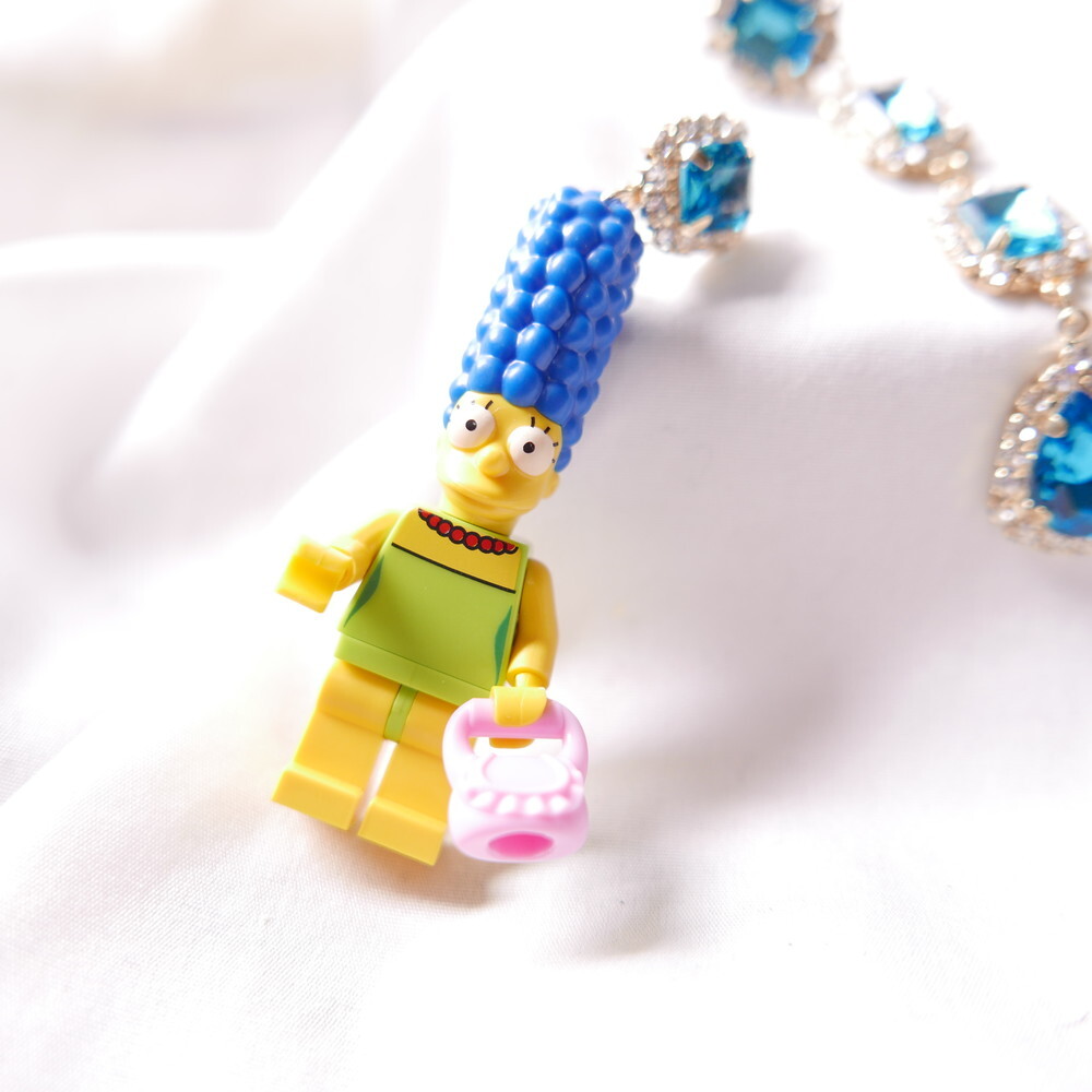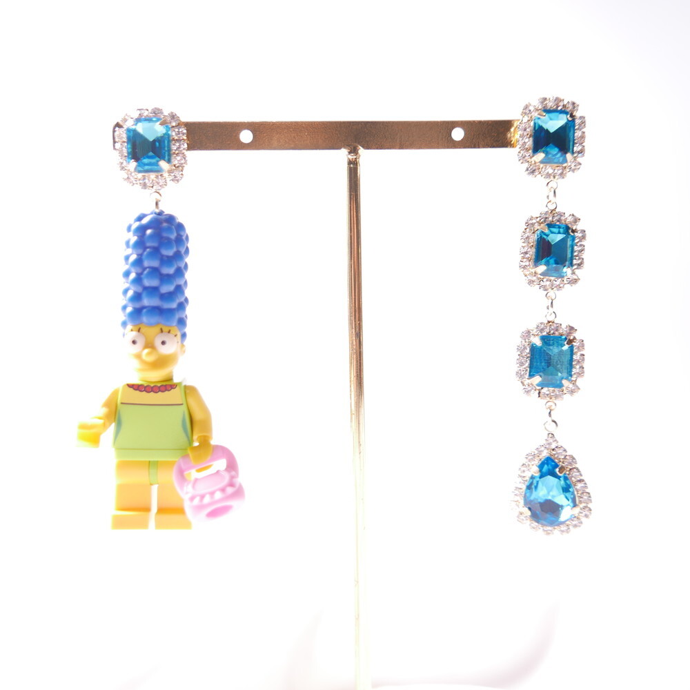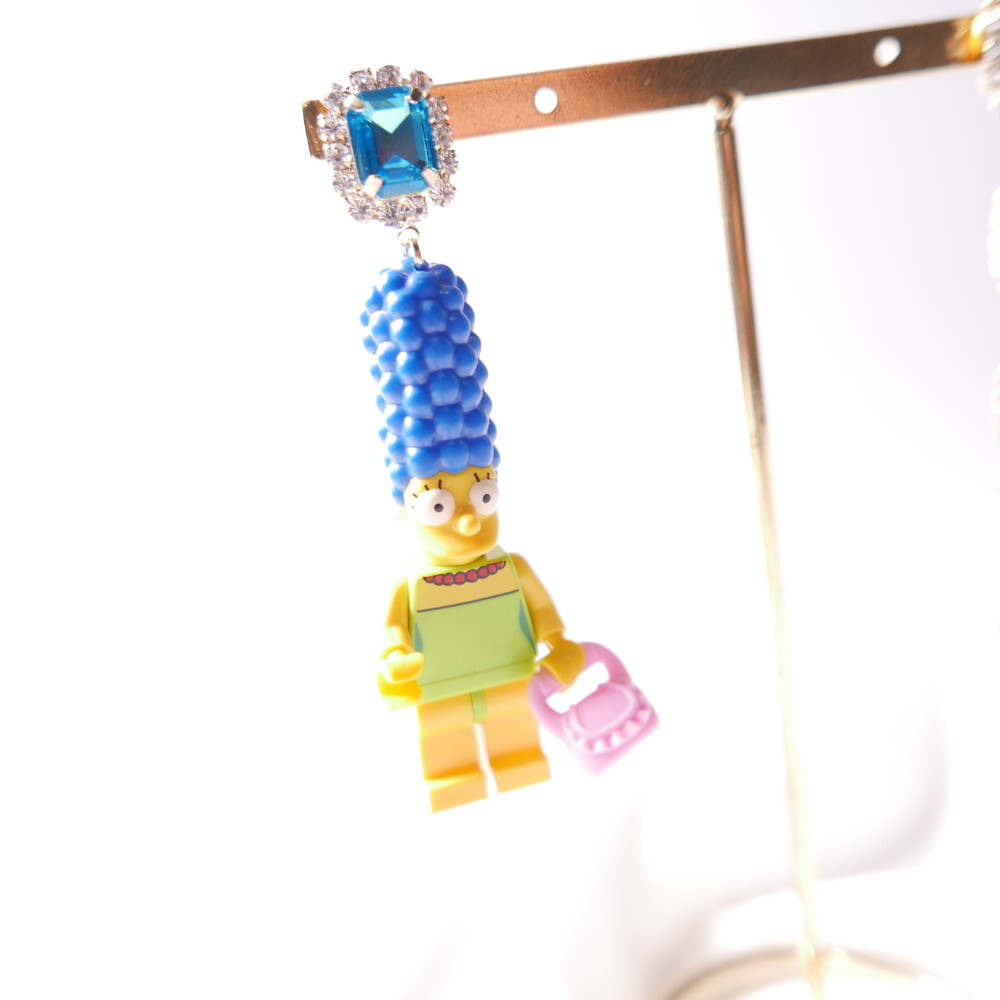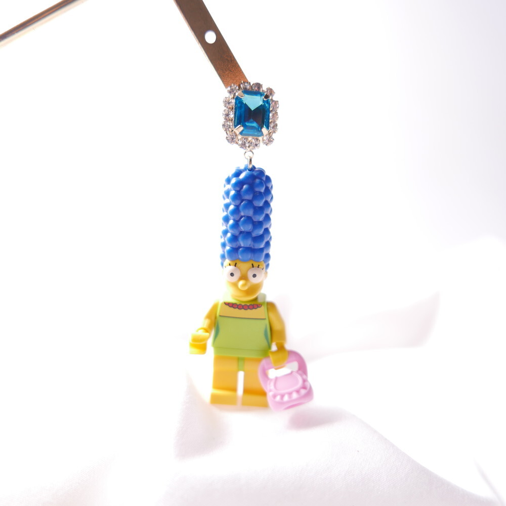 A playful tribute to everyone's favorite blue-haired mom, these asymmetrical earrings star Marge Simpson holding her signature pink handbag.