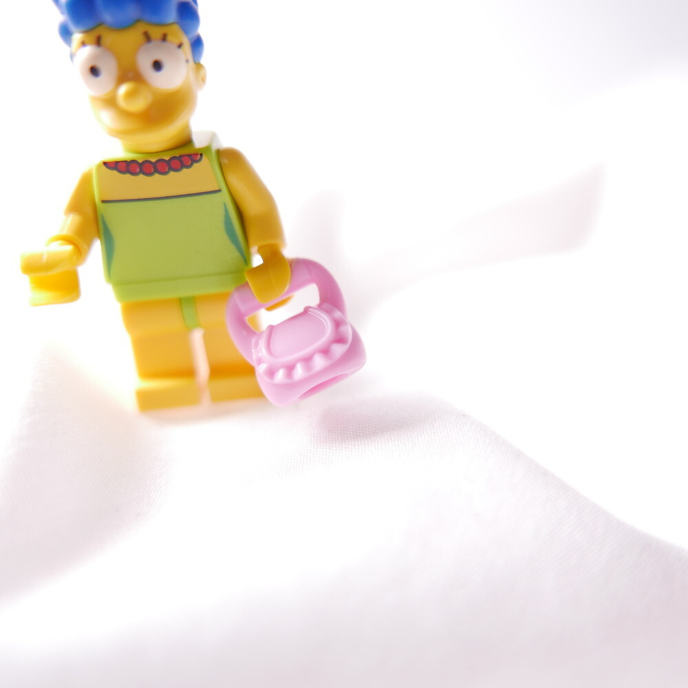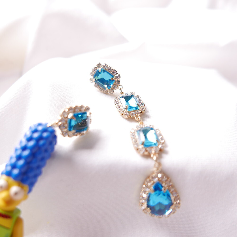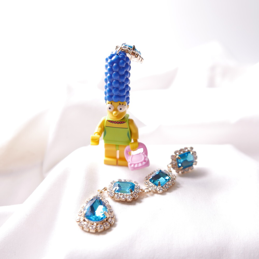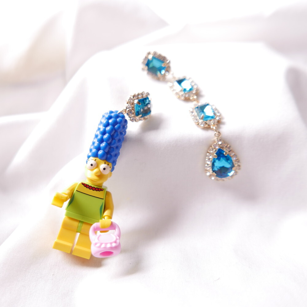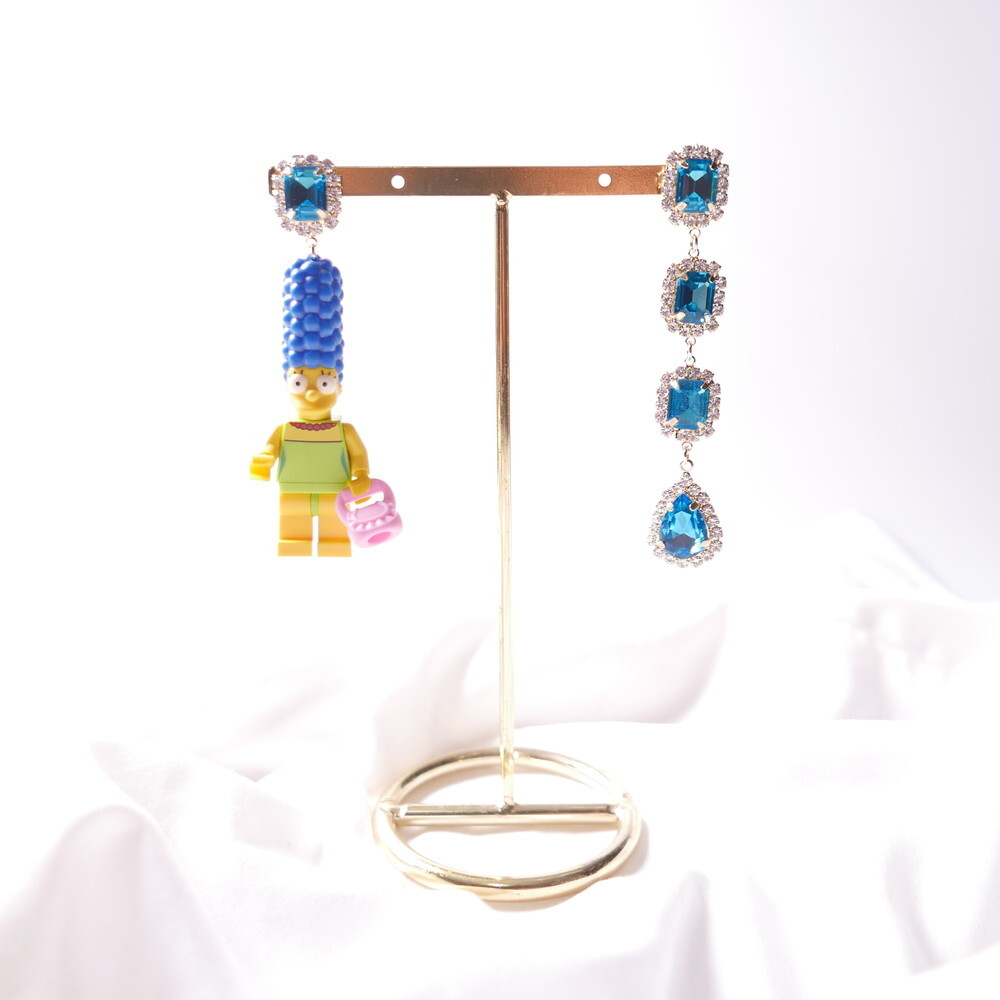 A playful tribute to everyone's favorite blue-haired mom, these asymmetrical earrings star Marge Simpson holding her signature pink handbag.
