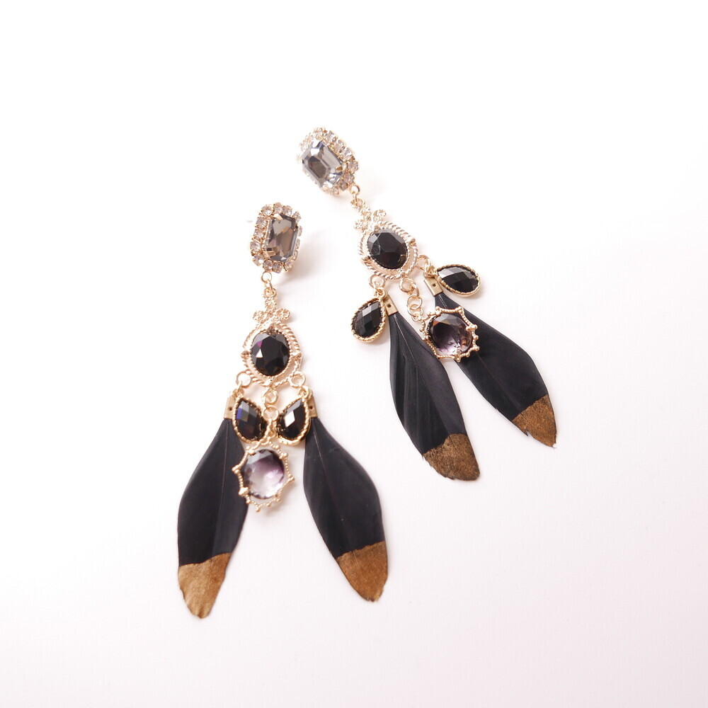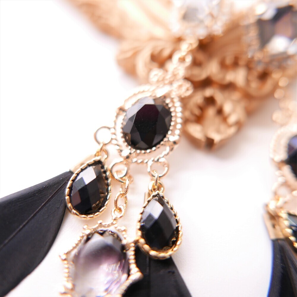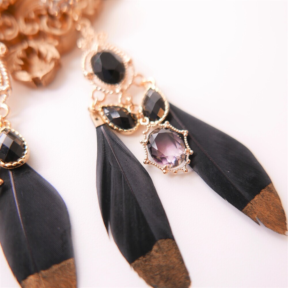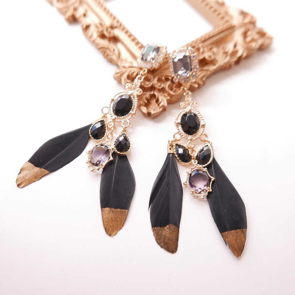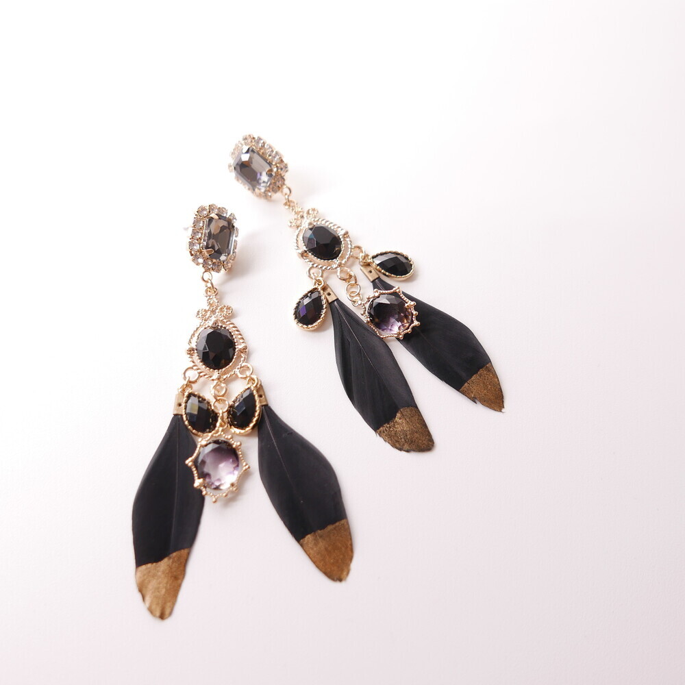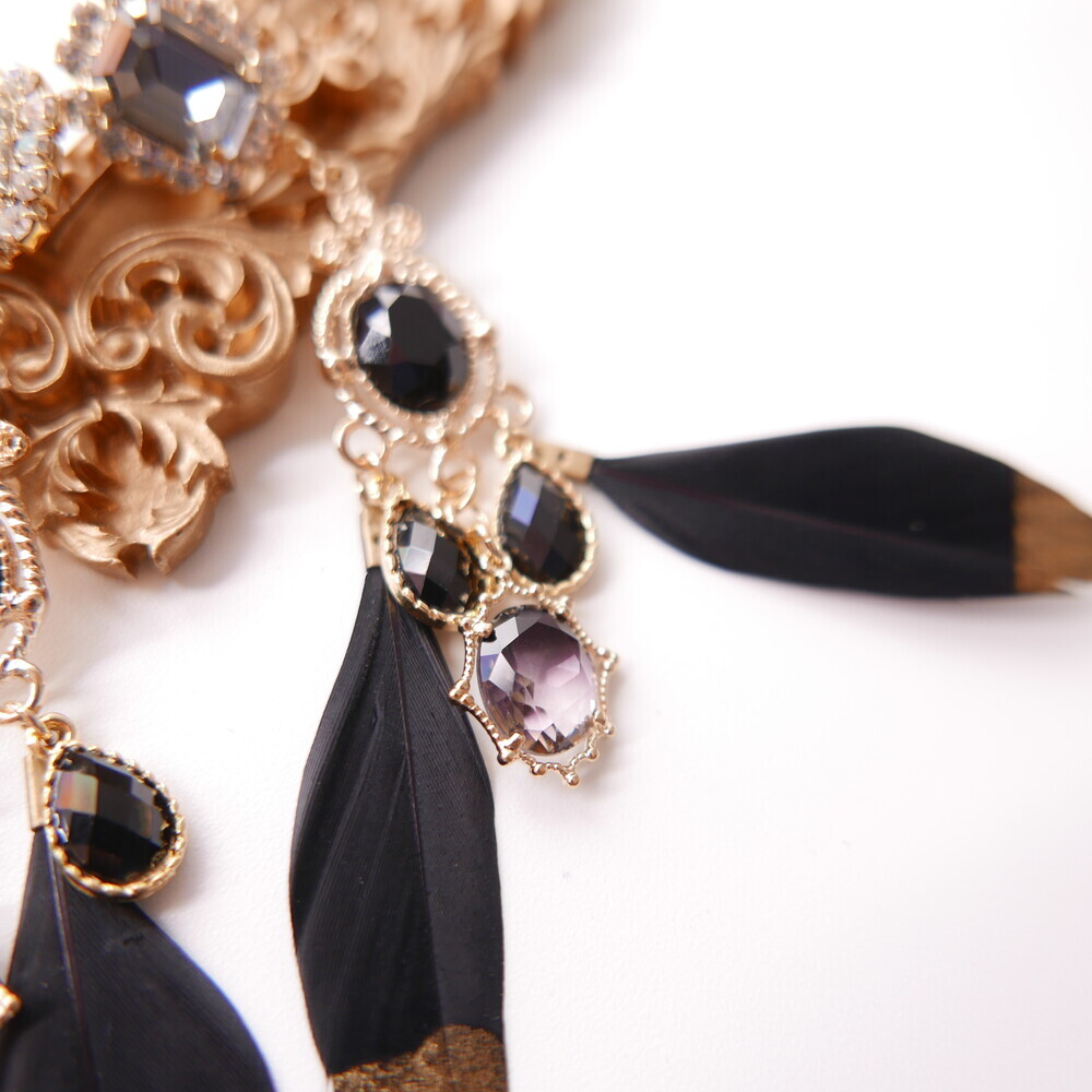 Elegant and bold, the Black Swan earrings are crafted with luxurious black feathers tipped in gold, paired with deep-toned gemstones and intricate gold accents. The unique color harmony of black and gold brings a refined, dramatic presence to your look. Made with titanium posts and available in both earring and clip-on options.