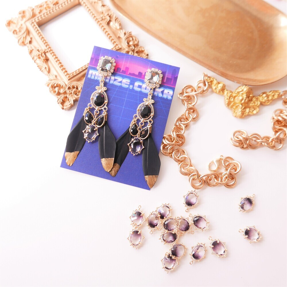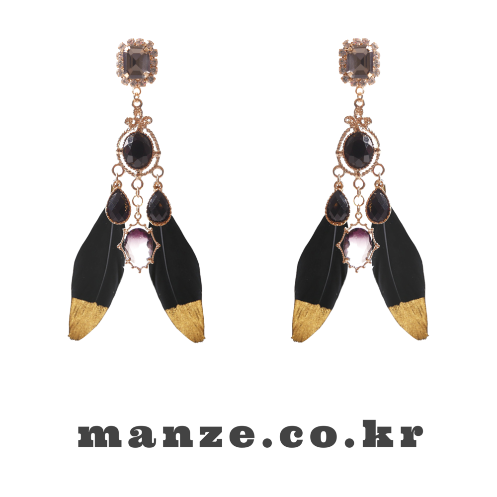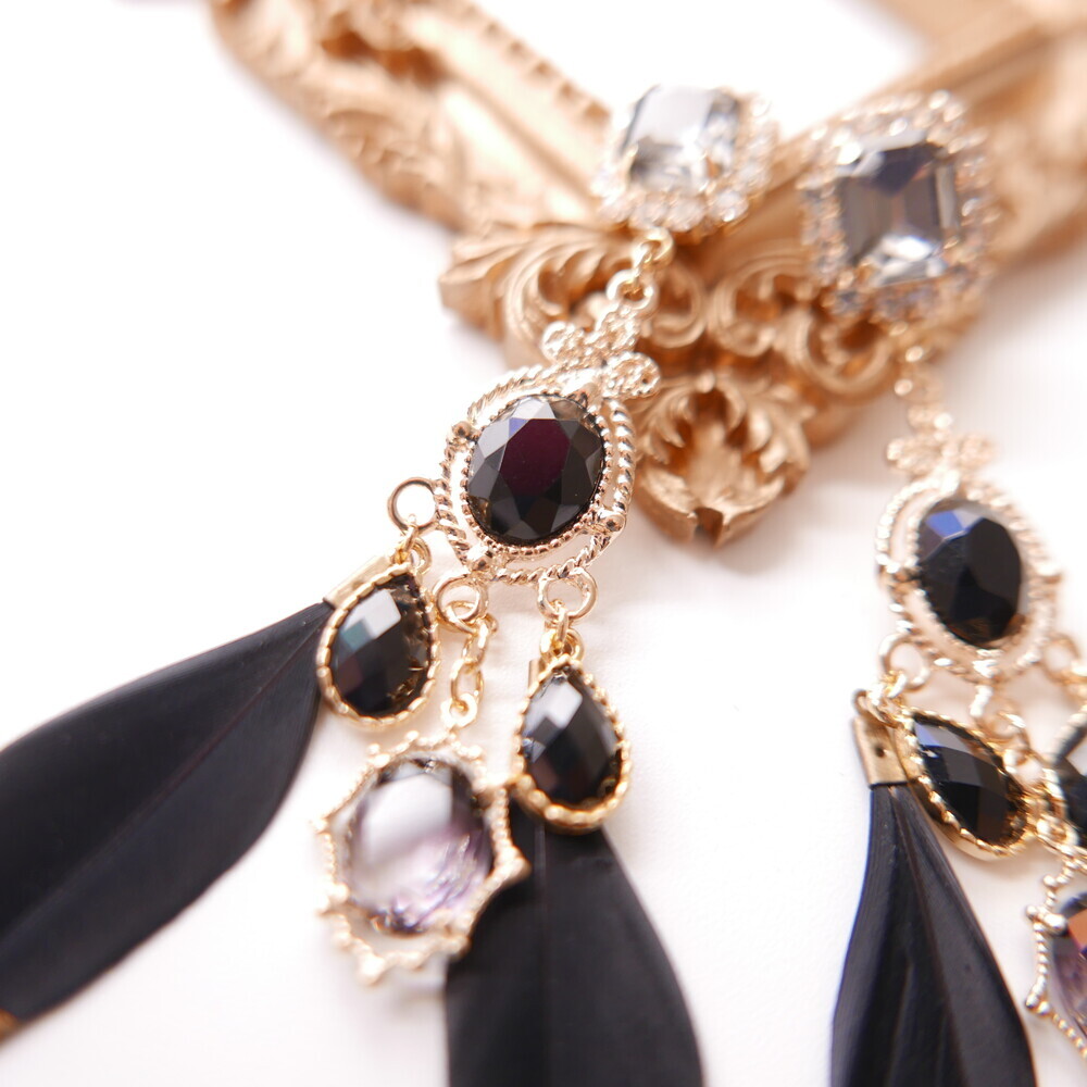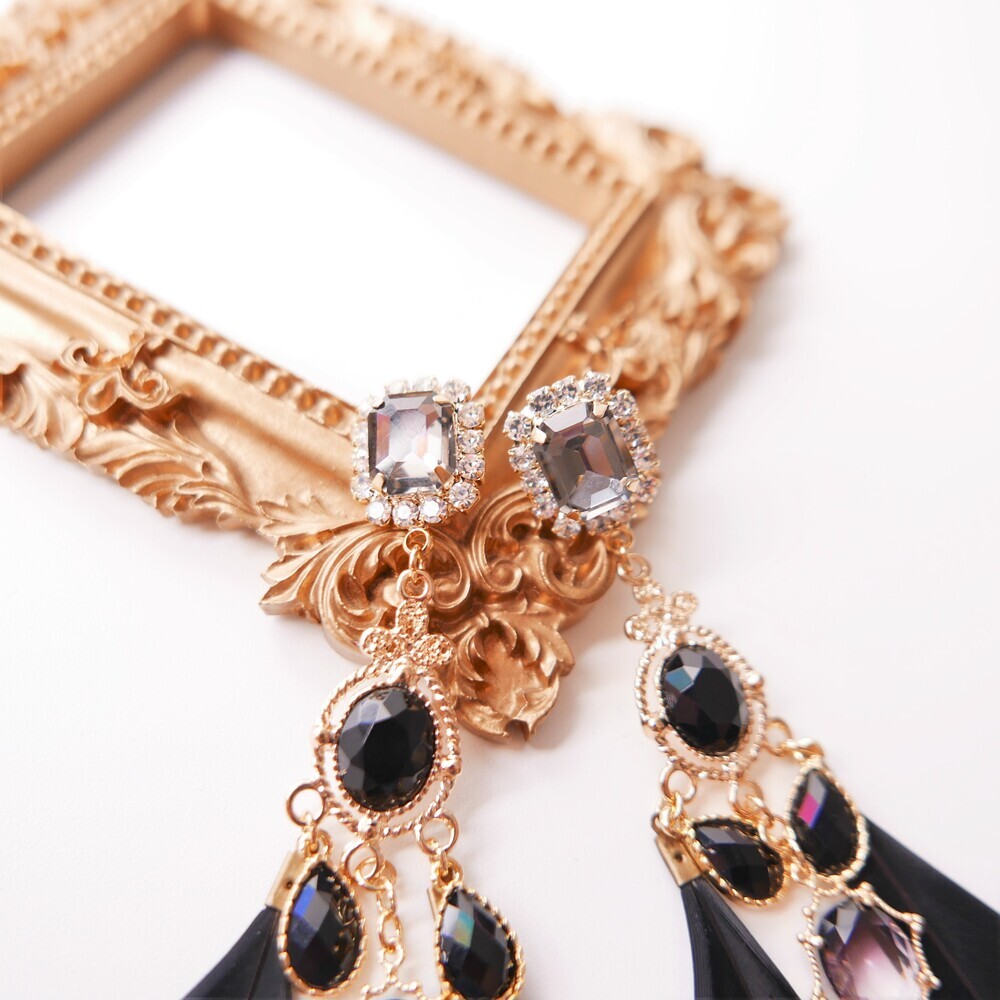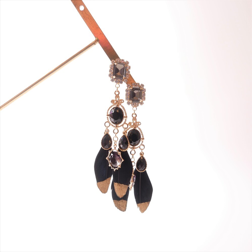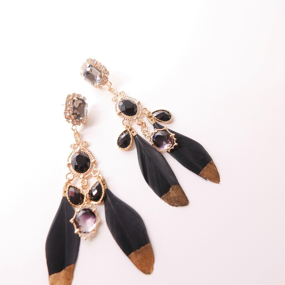 Elegant and bold, the Black Swan earrings are crafted with luxurious black feathers tipped in gold, paired with deep-toned gemstones and intricate gold accents. The unique color harmony of black and gold brings a refined, dramatic presence to your look. Made with titanium posts and available in both earring and clip-on options.