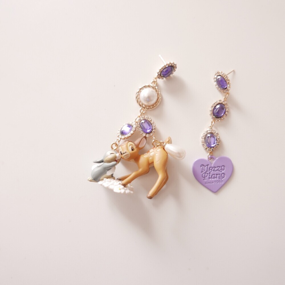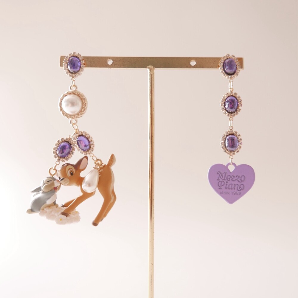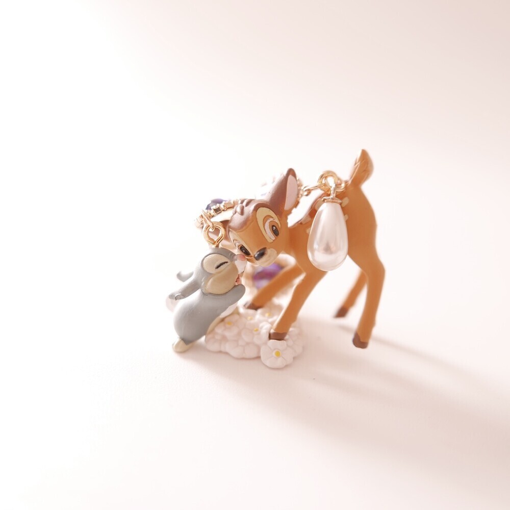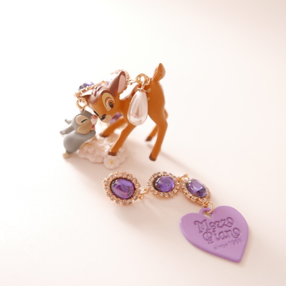 palette to a classic Disney scene. On one side, a lovingly detailed vintage Bambi and Thumper figure playfully nuzzle above a tiny patch of flowers. The other side features a pastel lavender heart charm with glittering purple gemstone accents.
