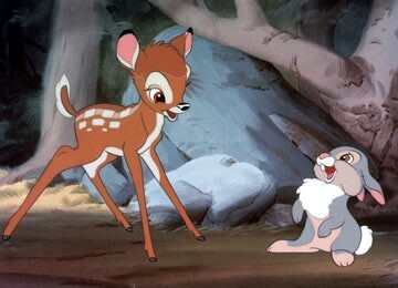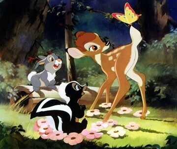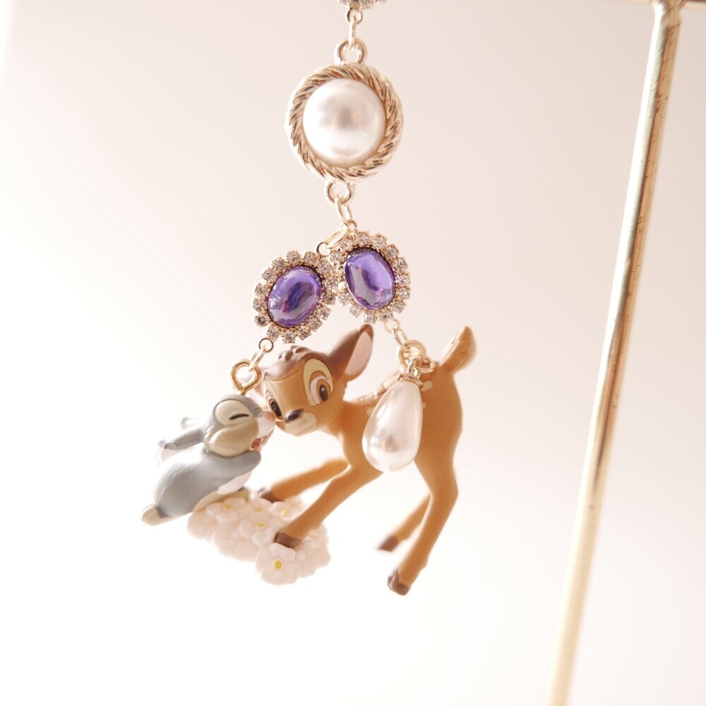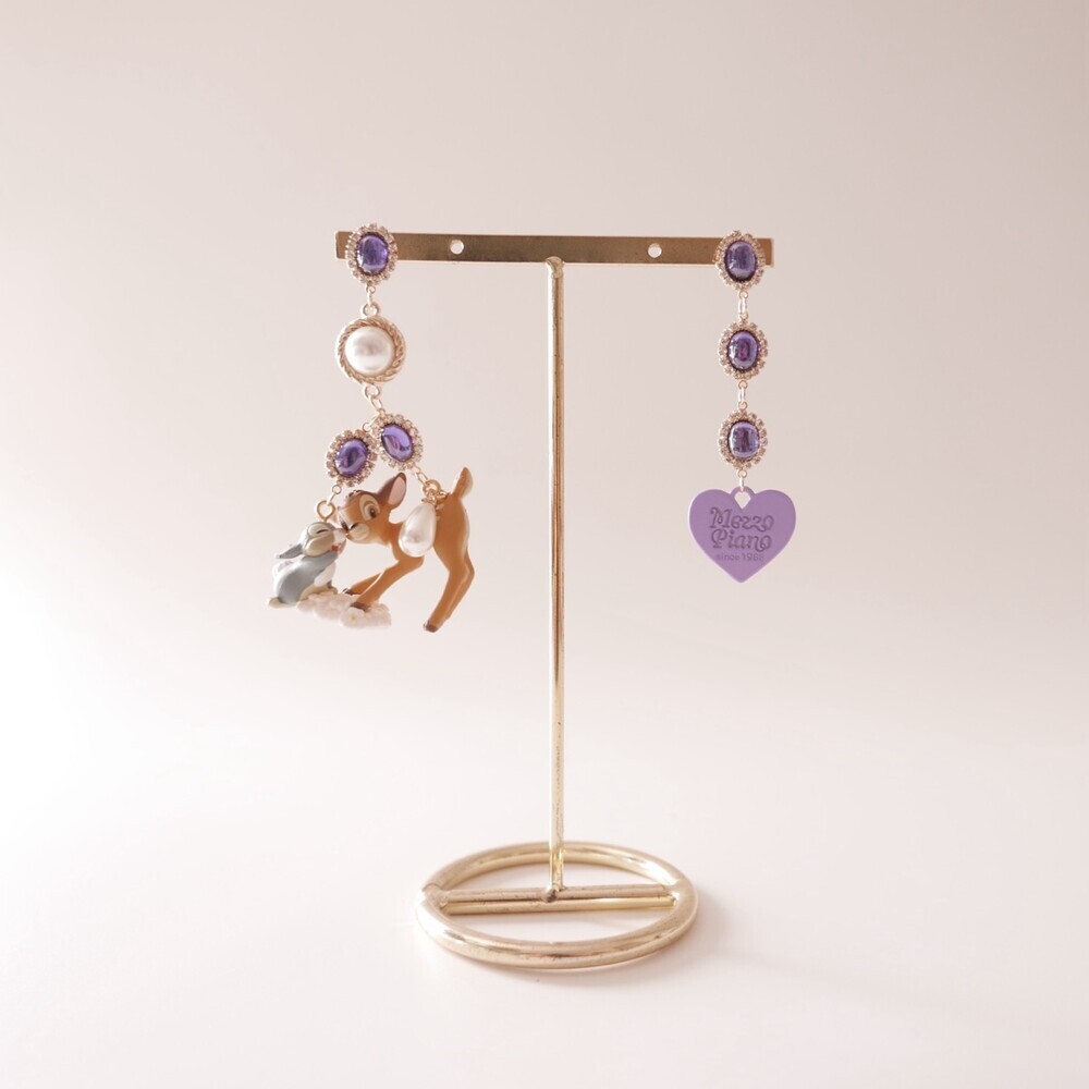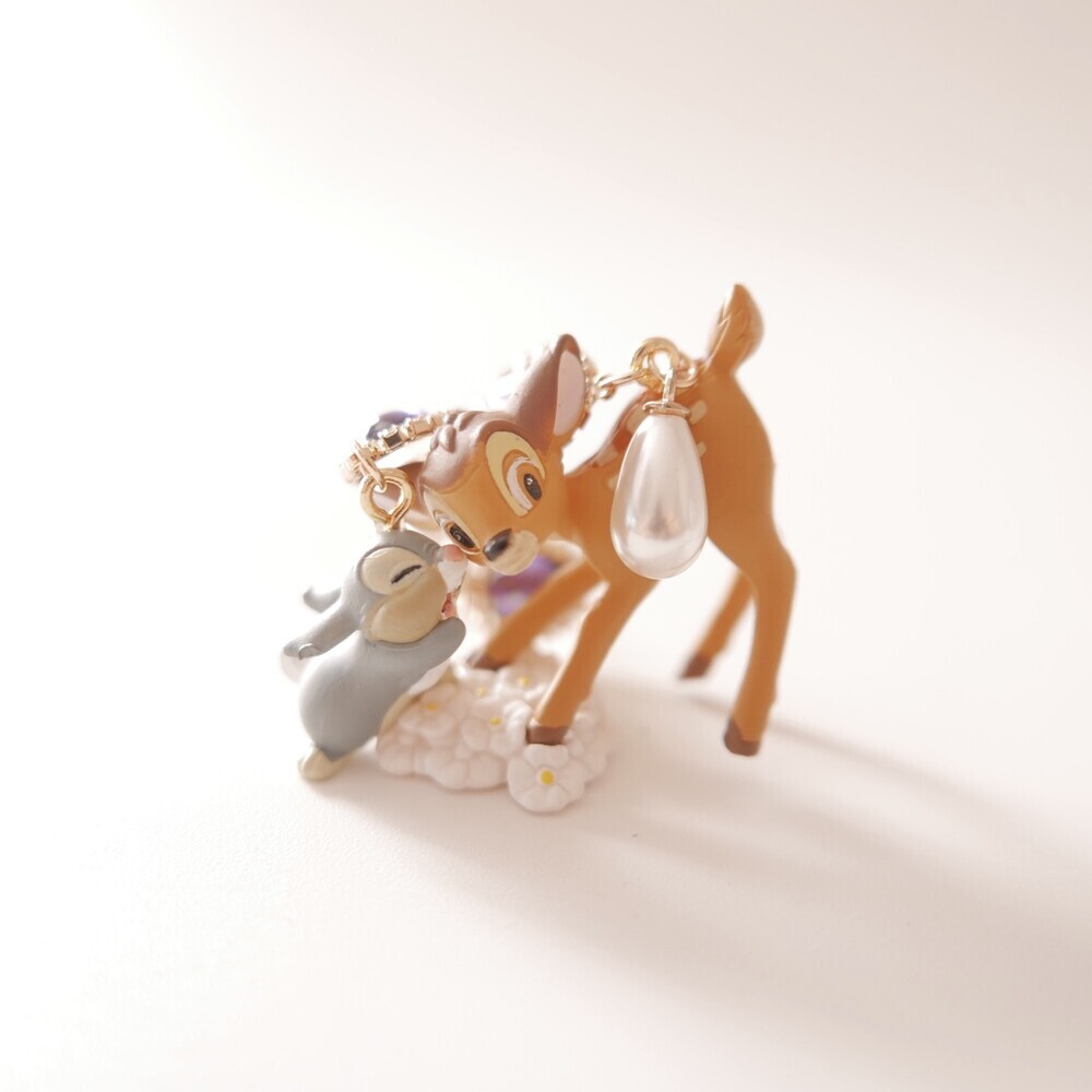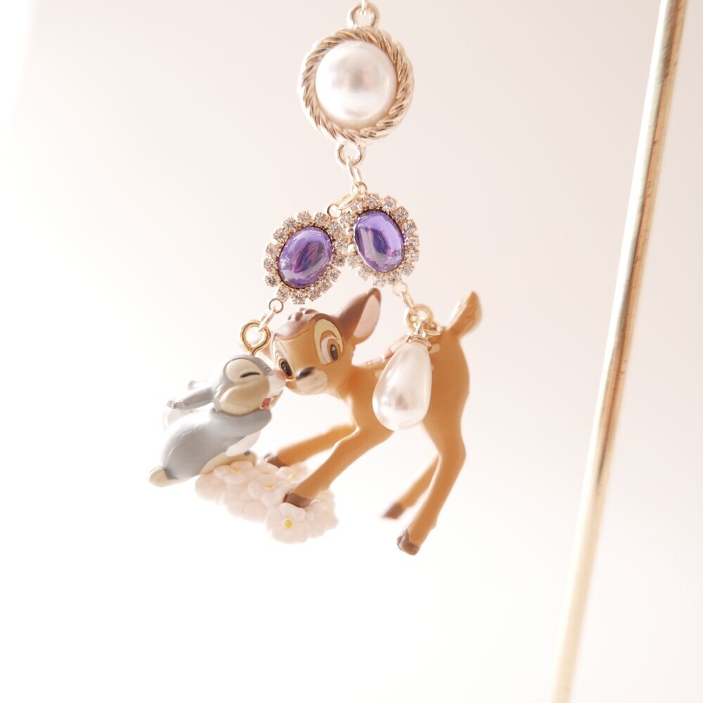 palette to a classic Disney scene. On one side, a lovingly detailed vintage Bambi and Thumper figure playfully nuzzle above a tiny patch of flowers. The other side features a pastel lavender heart charm with glittering purple gemstone accents.
