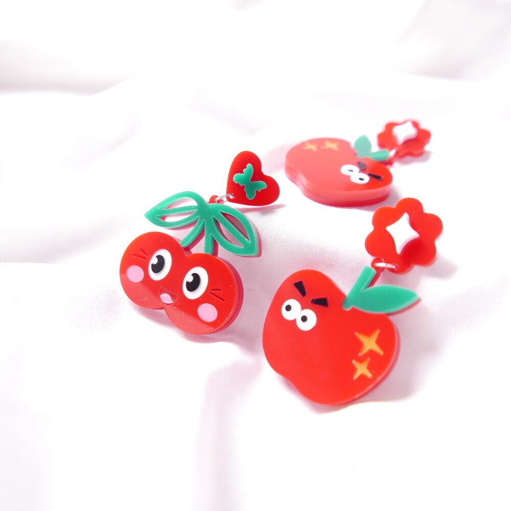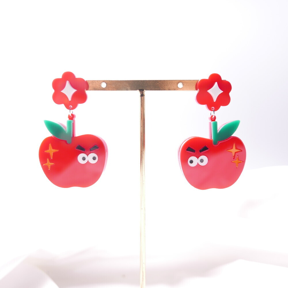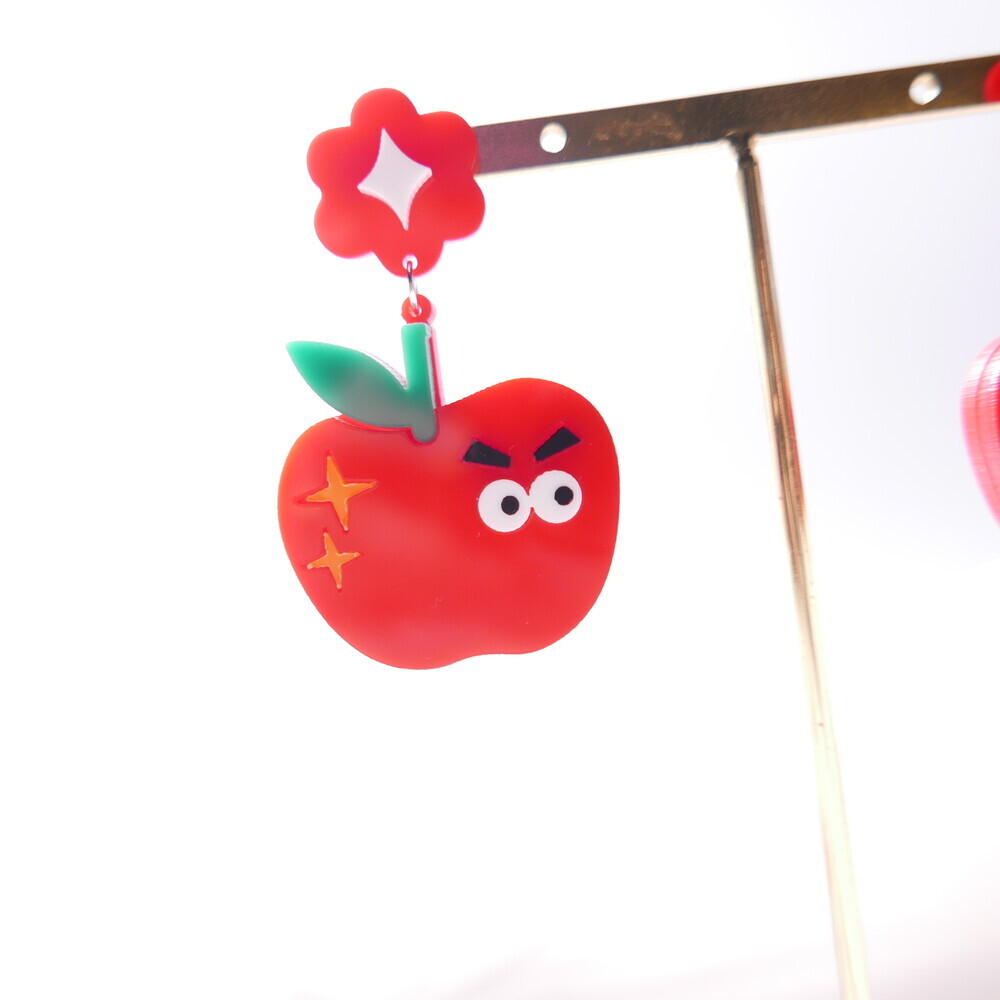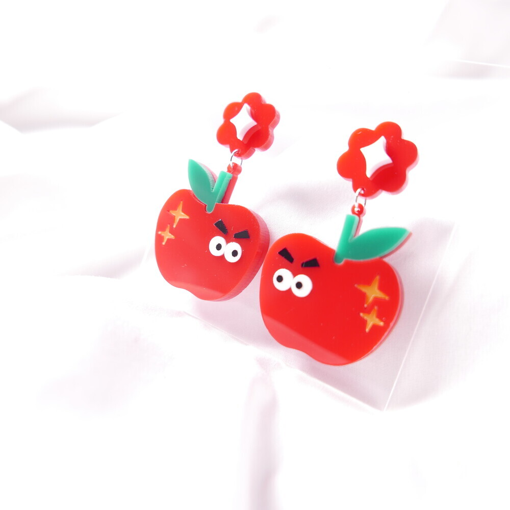 A charmingly playful pair of earrings shaped like surprised apples! Featuring puzzle-like acrylic detailing with expressive eyebrows, glimmer accents, and vibrant colors.