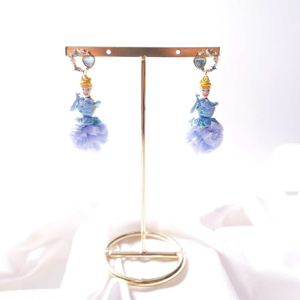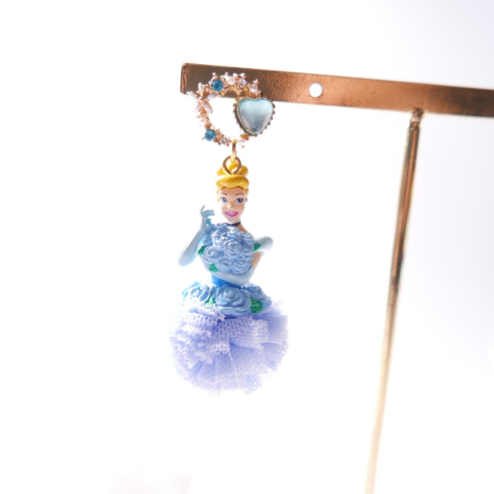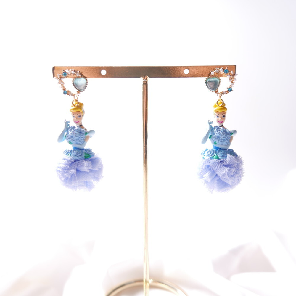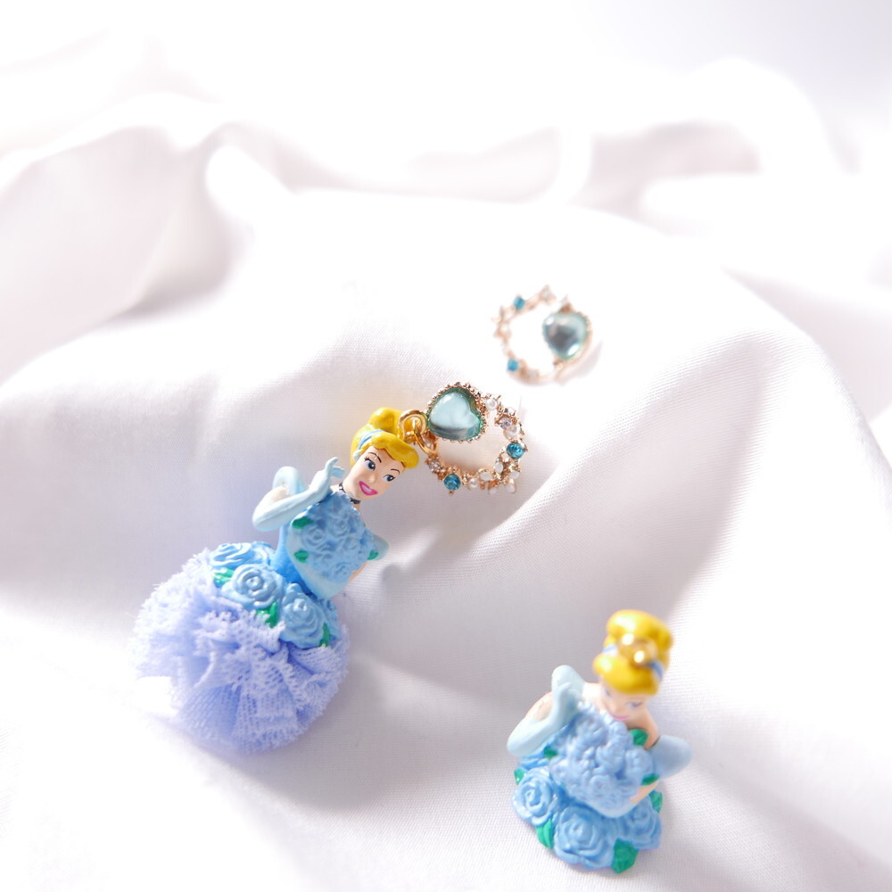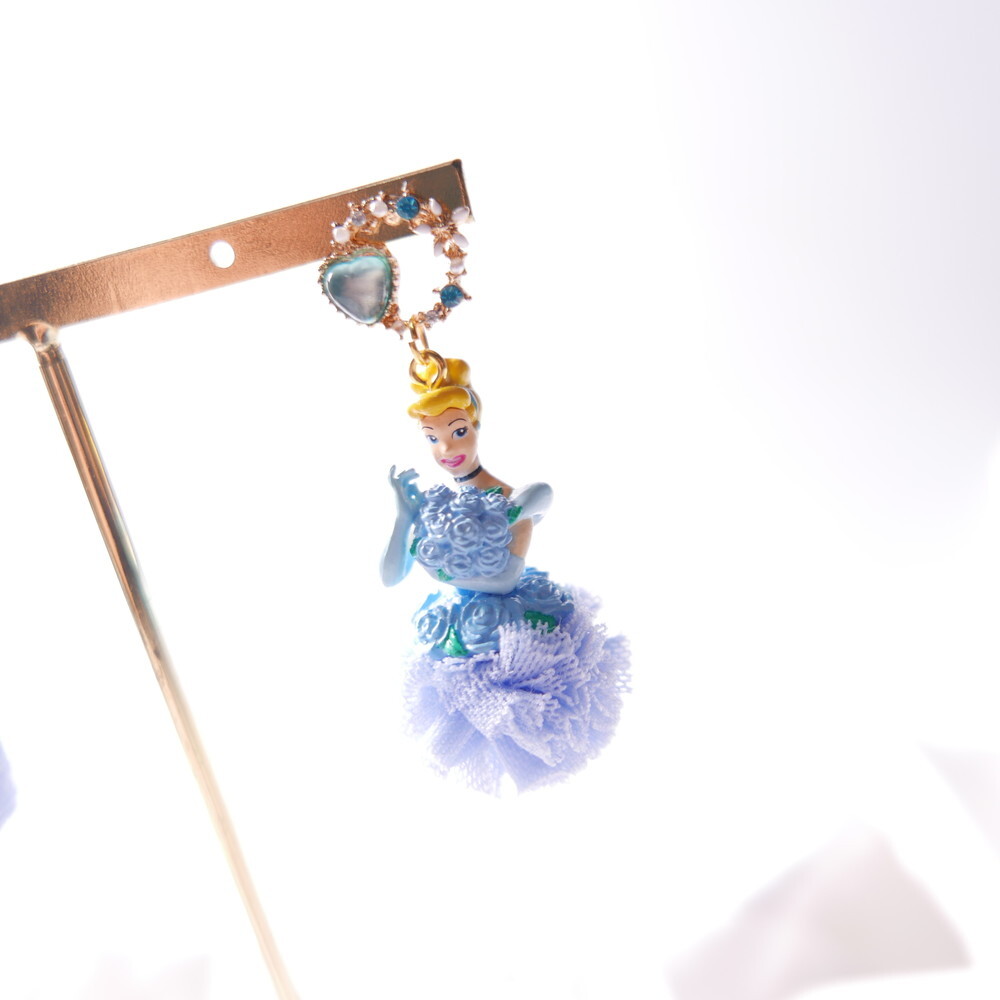 A whimsical take on the classic Cinderella look! These earrings feature Cinderella in a delicately detailed rose bouquet dress, with the skirt made of voluminous lavender lace. Finished with soft blue heart-shaped studs and sparkly accents, this piece brings a sweet touch of royalty to your everyday styling.