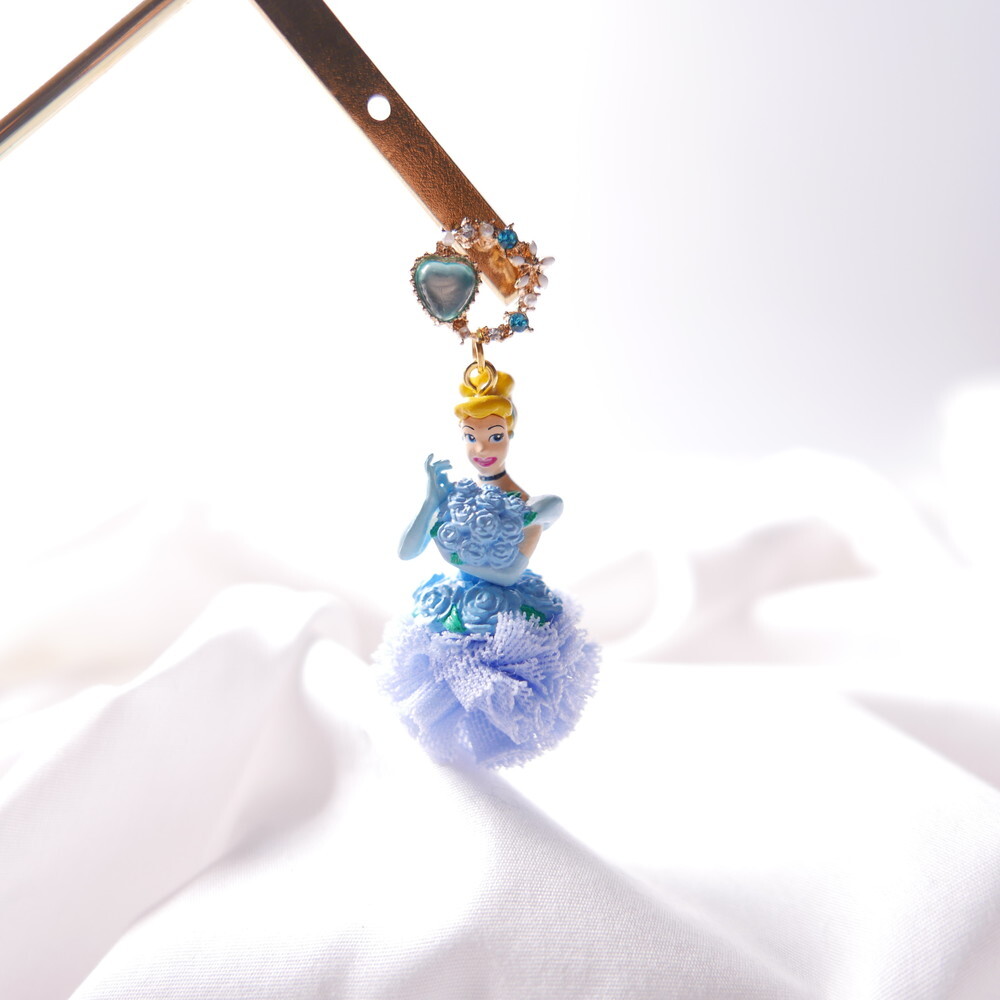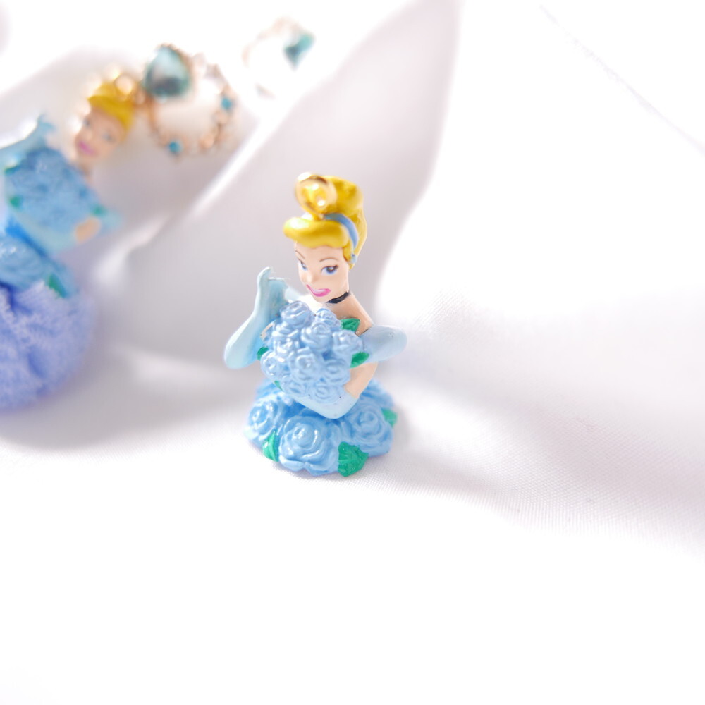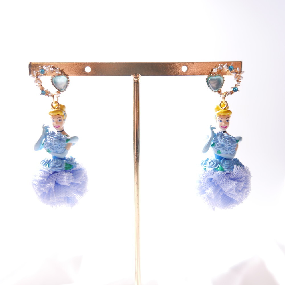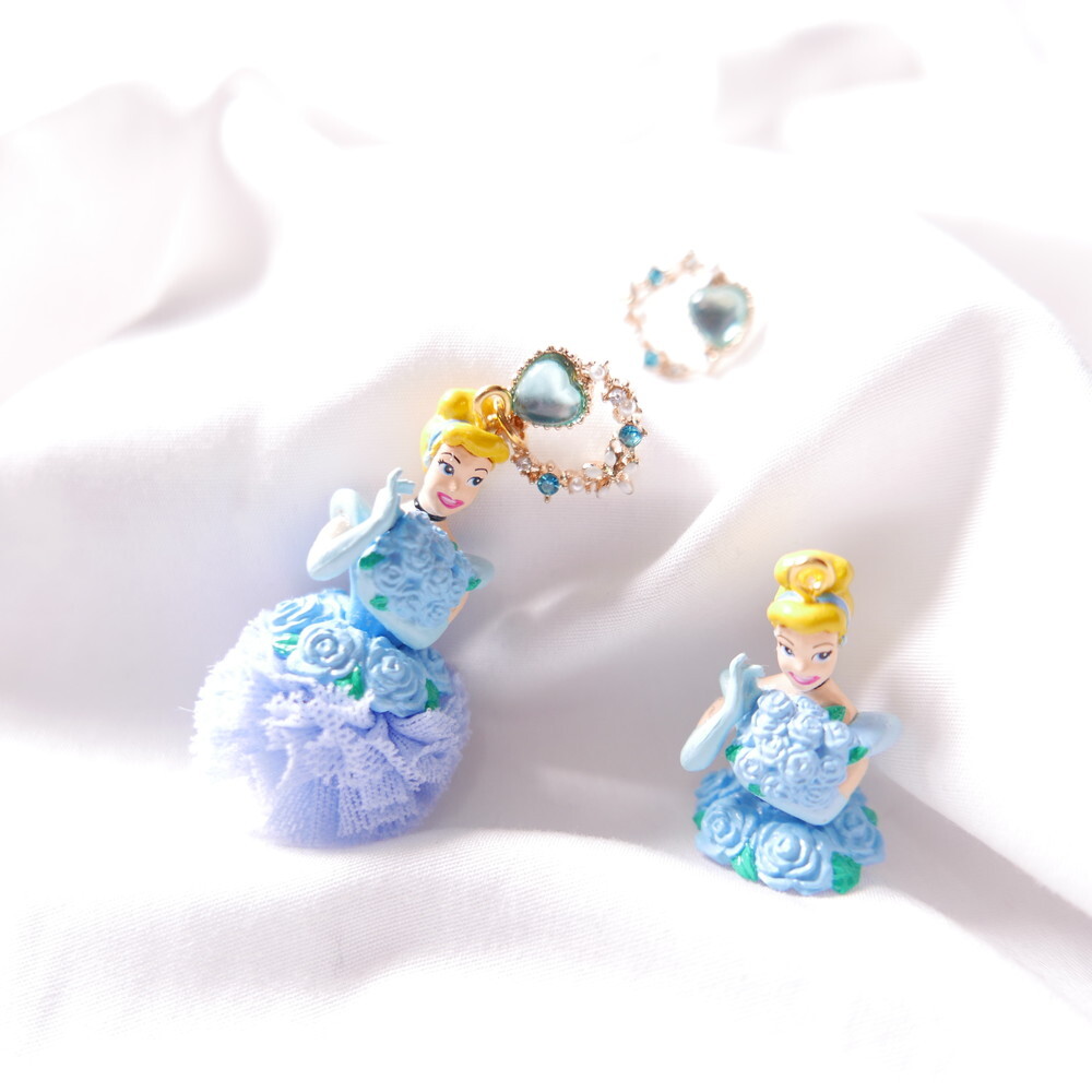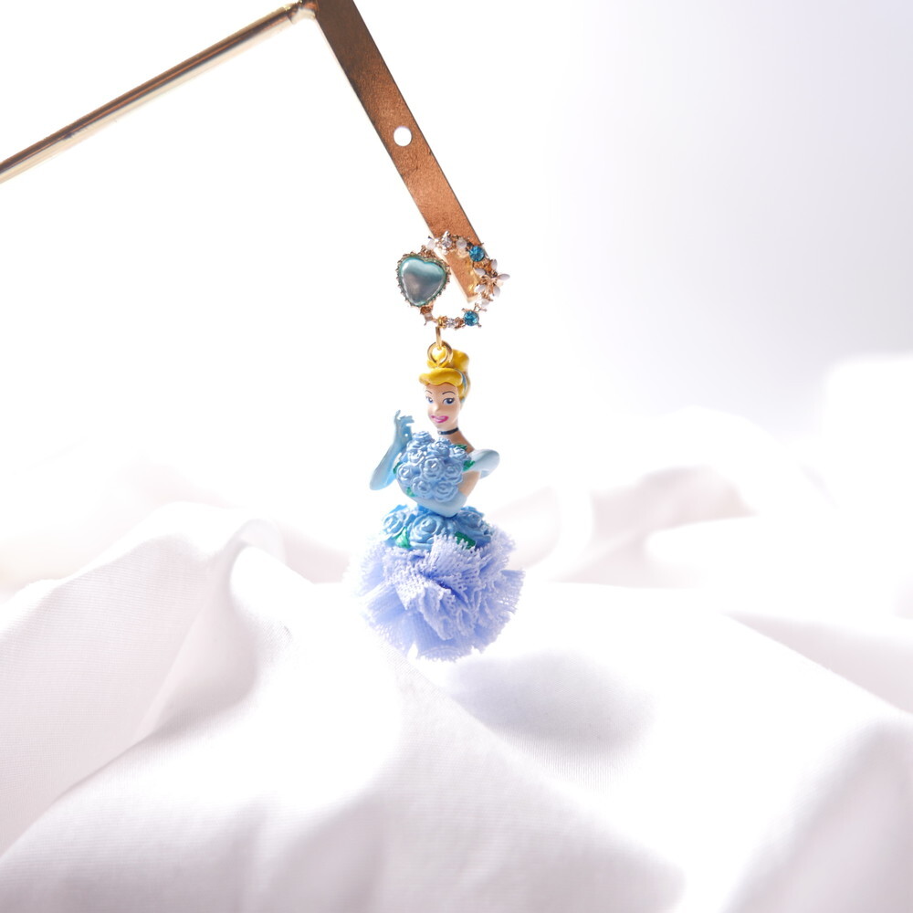 A whimsical take on the classic Cinderella look! These earrings feature Cinderella in a delicately detailed rose bouquet dress, with the skirt made of voluminous lavender lace. Finished with soft blue heart-shaped studs and sparkly accents, this piece brings a sweet touch of royalty to your everyday styling.