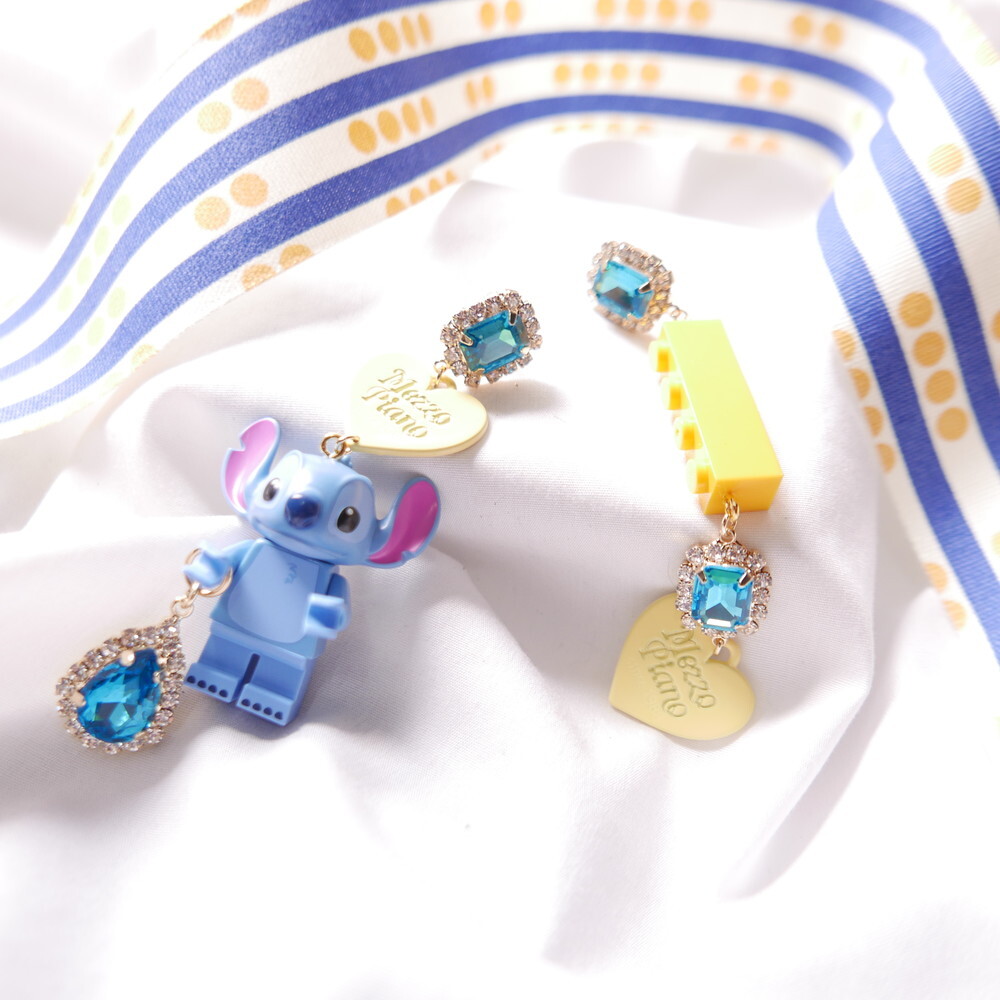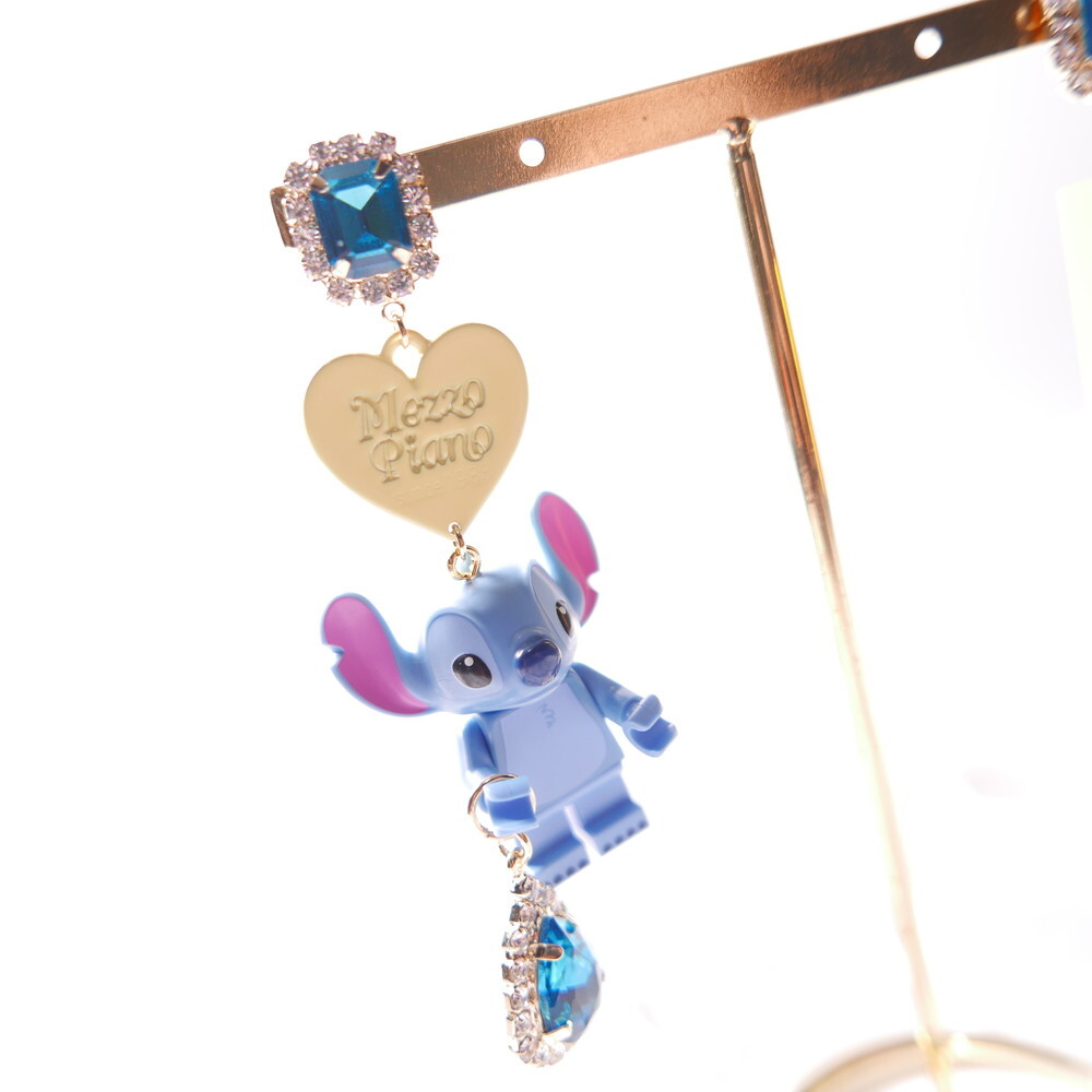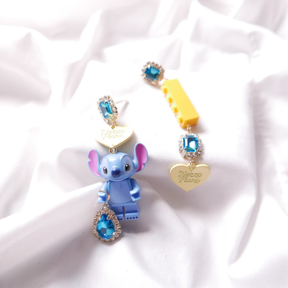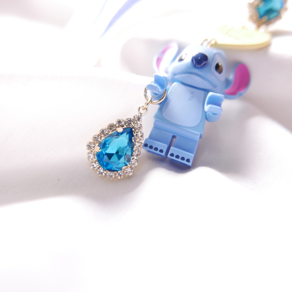 On one side, Stitch holds a large teardrop-shaped crystal; on the other, a bold yellow brick dangles beneath a sparkling jewel.