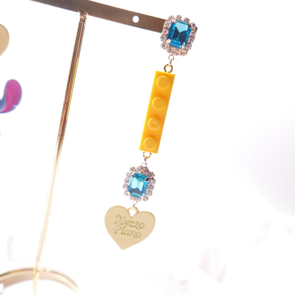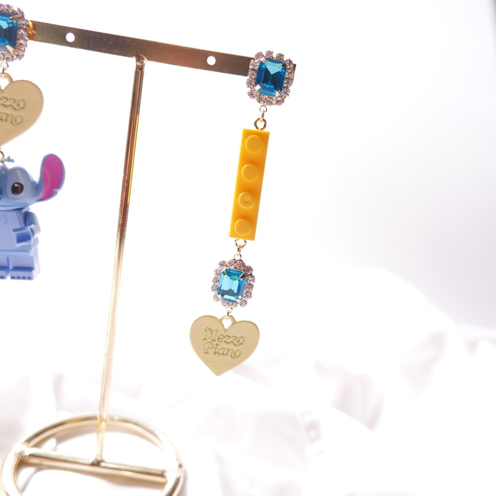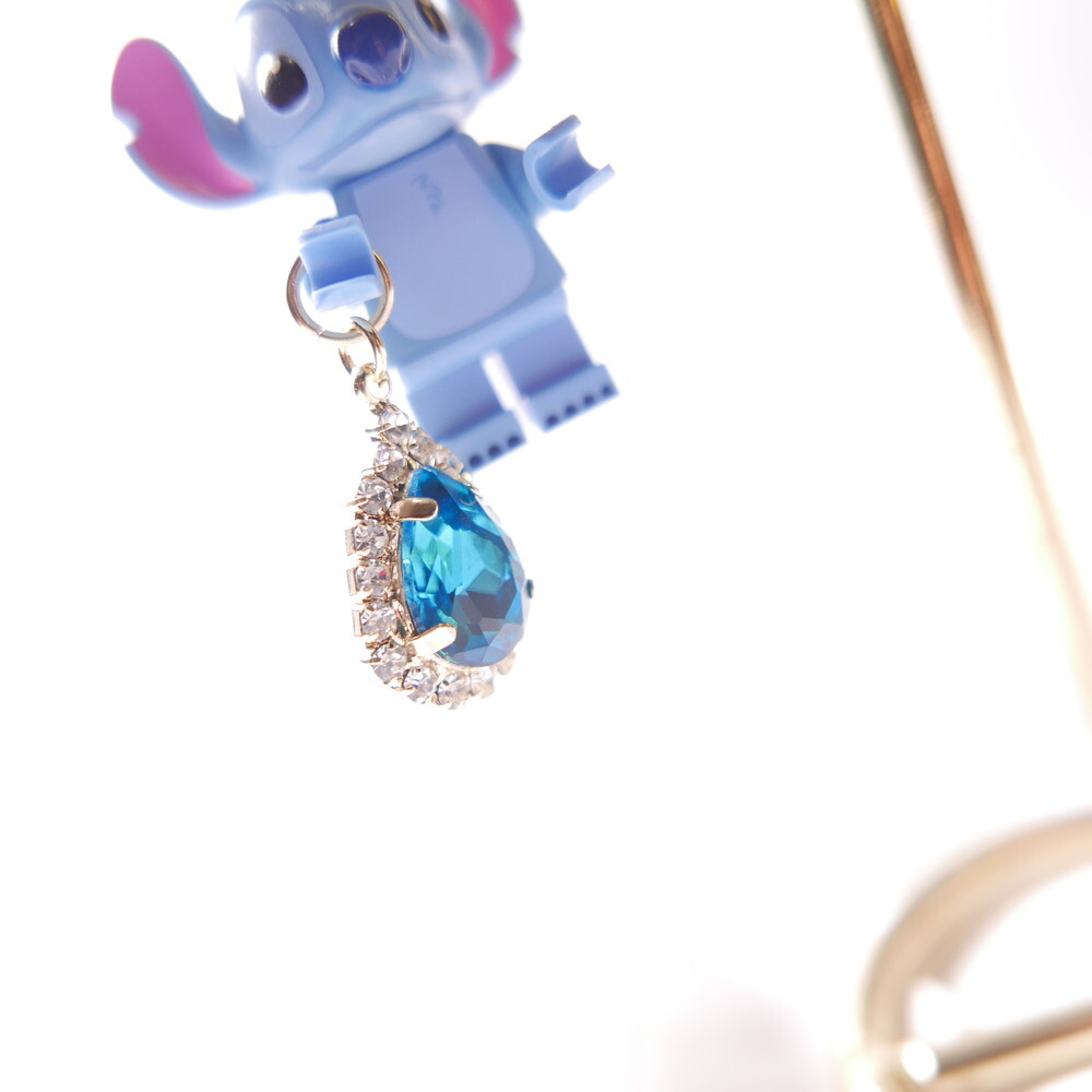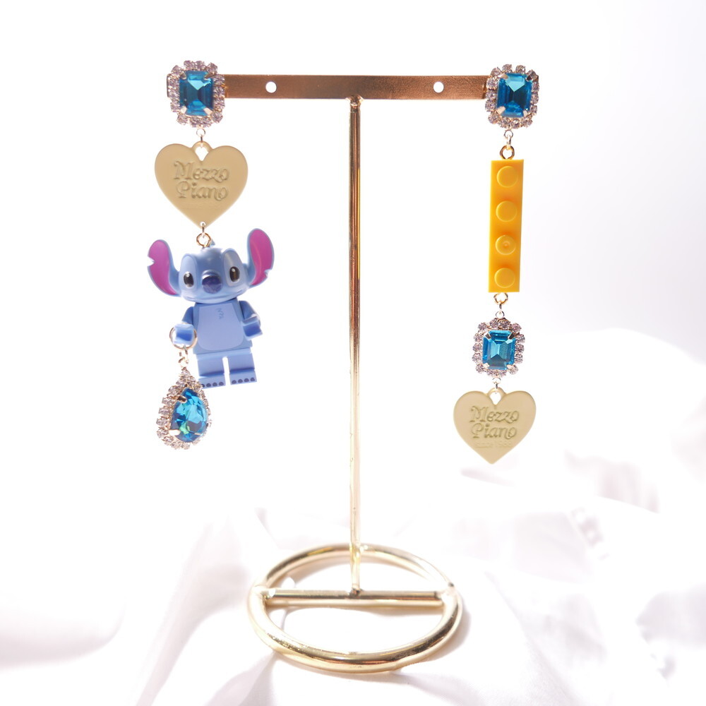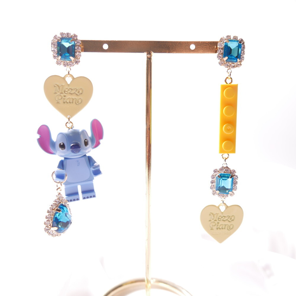 On one side, Stitch holds a large teardrop-shaped crystal; on the other, a bold yellow brick dangles beneath a sparkling jewel.