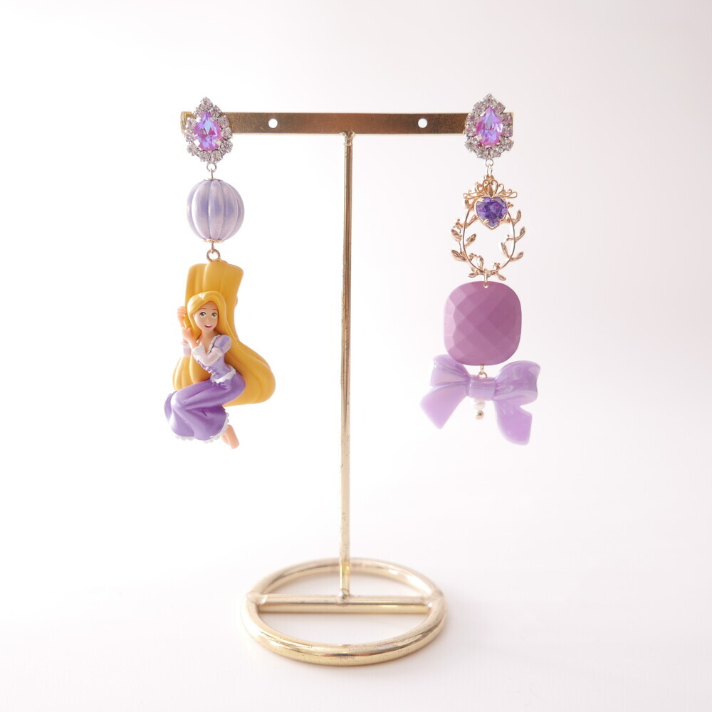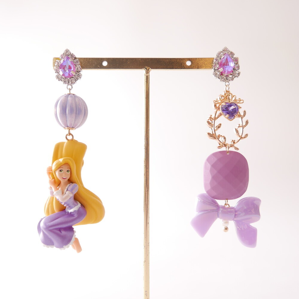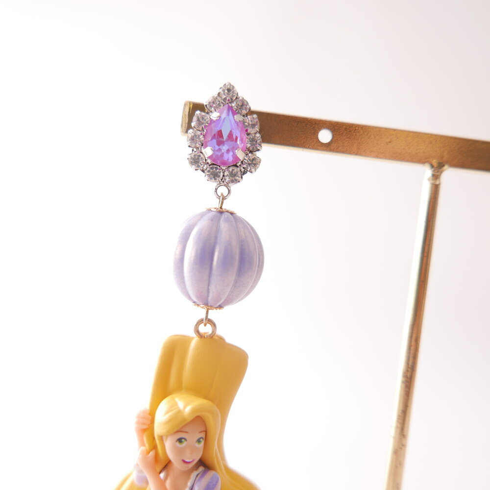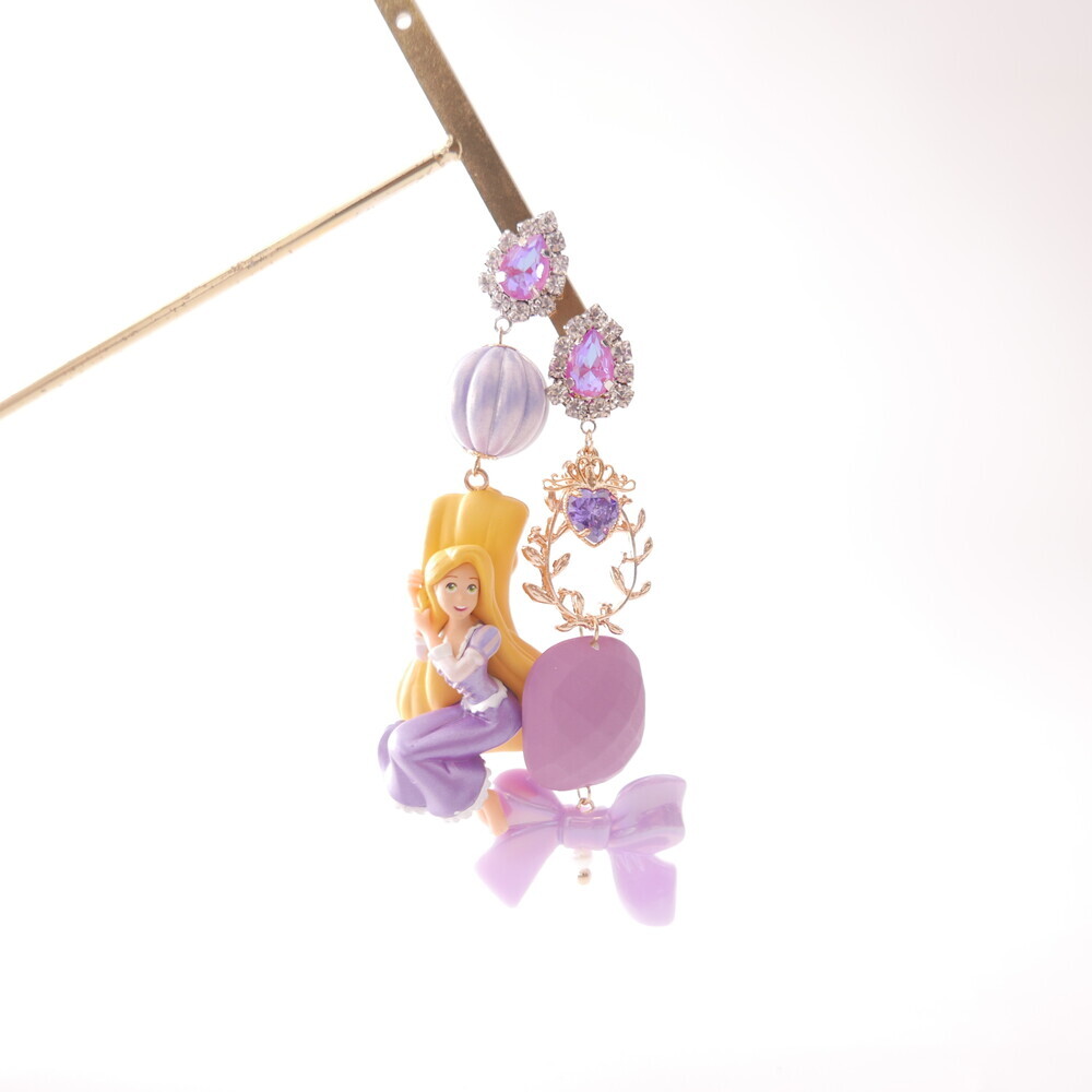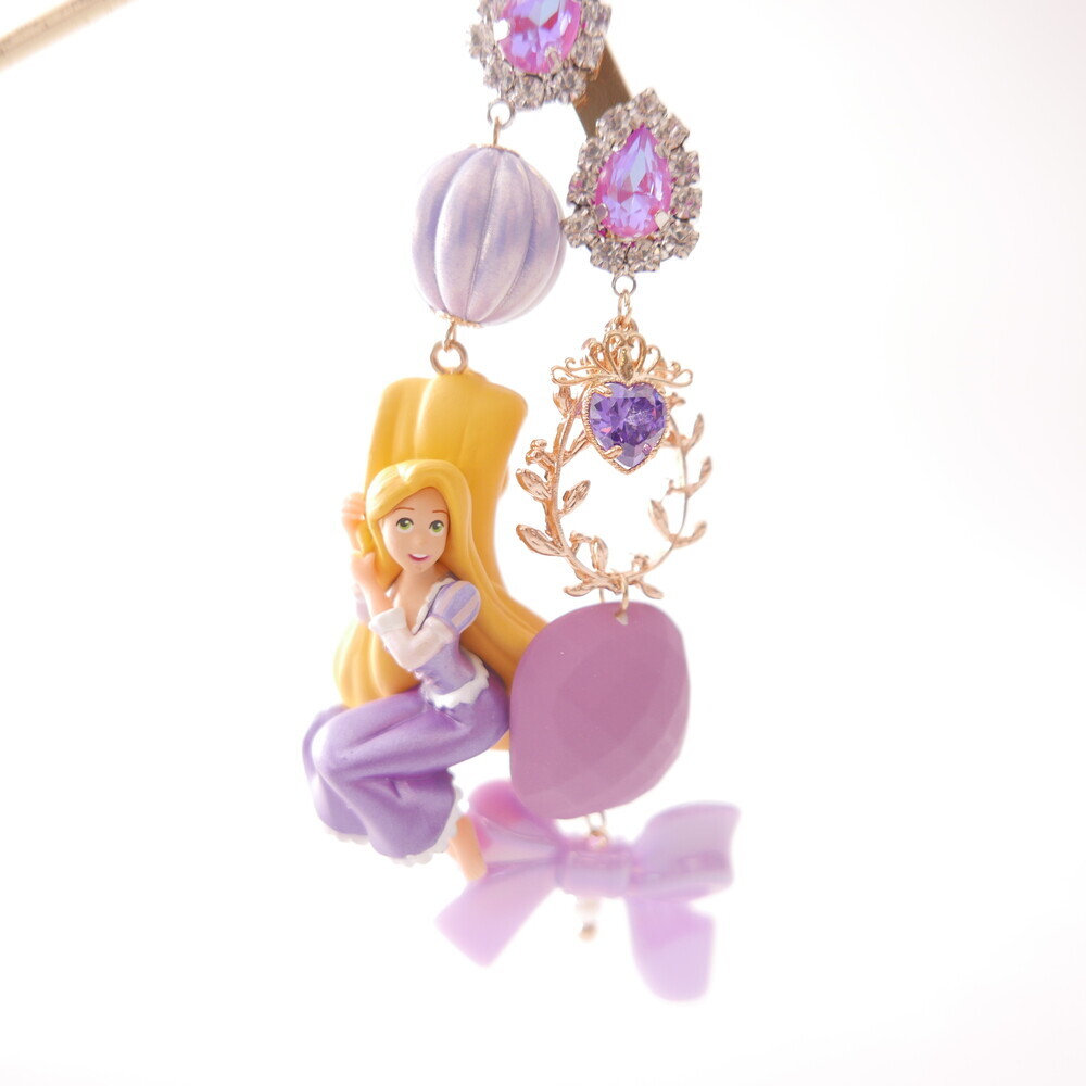 Inspired by the fearless fairy tale heroine, these Rapunzel earrings feature a detailed vintage Rapunzel figure in a flowing lavender dress and signature golden hair. One side displays the iconic character herself, while the other pairs a violet jewel, bow, and laurel-style embellishment for a storybook finish. Crafted using a rare unopened Disney vintage figure.