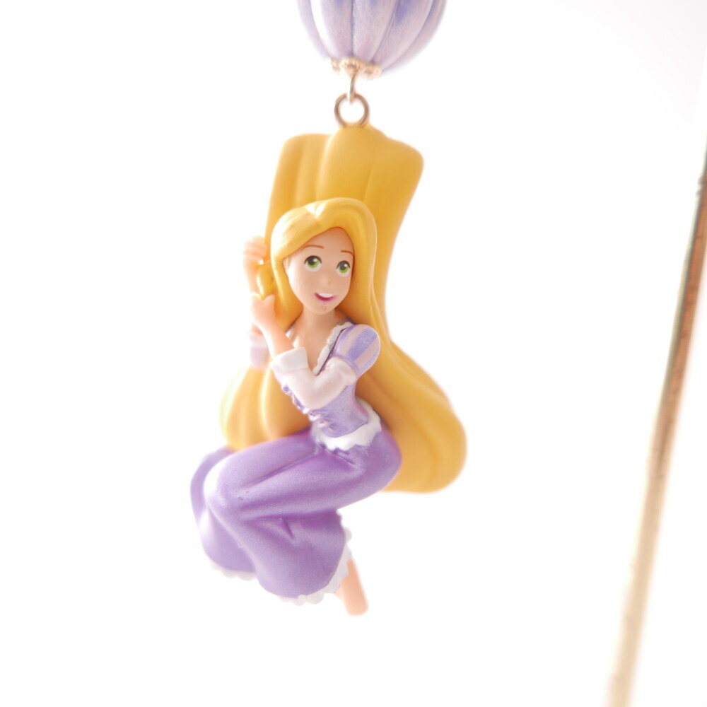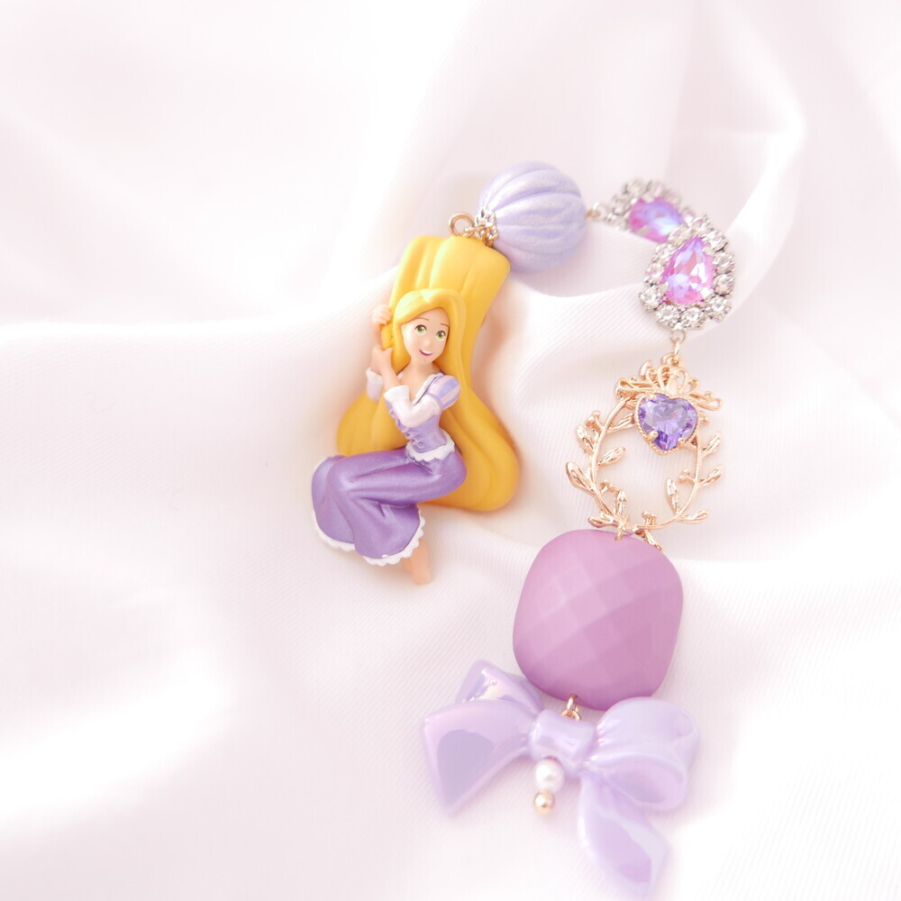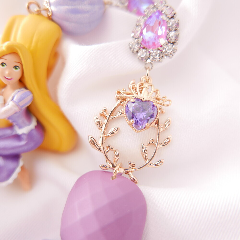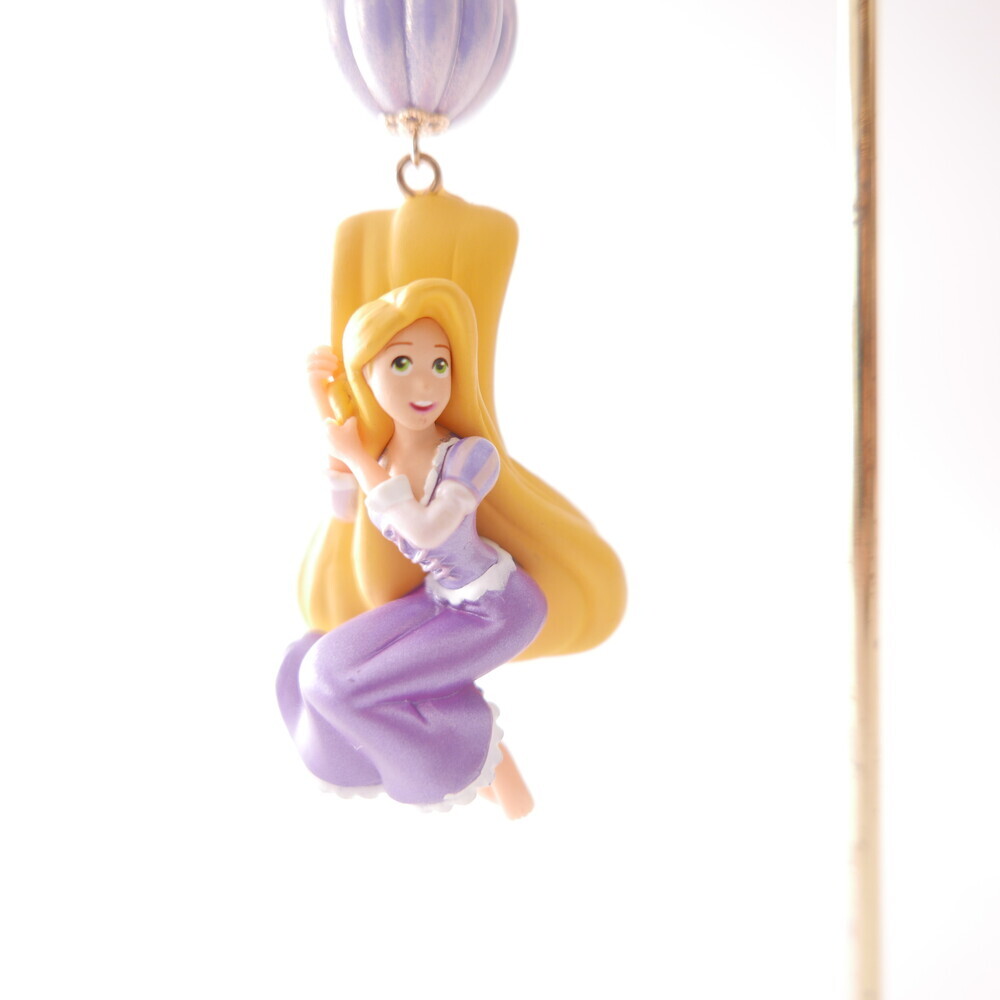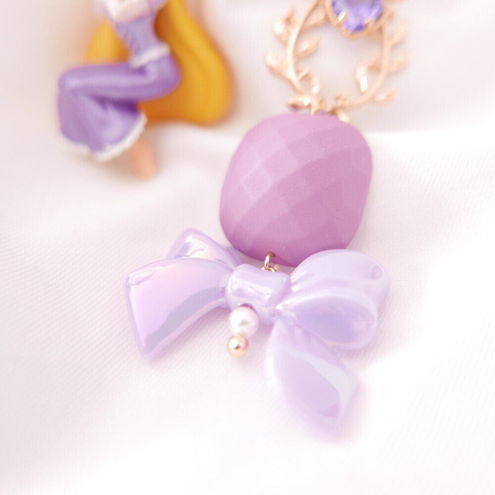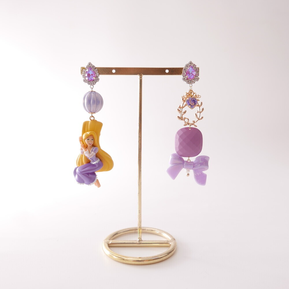 Inspired by the fearless fairy tale heroine, these Rapunzel earrings feature a detailed vintage Rapunzel figure in a flowing lavender dress and signature golden hair. One side displays the iconic character herself, while the other pairs a violet jewel, bow, and laurel-style embellishment for a storybook finish. Crafted using a rare unopened Disney vintage figure.