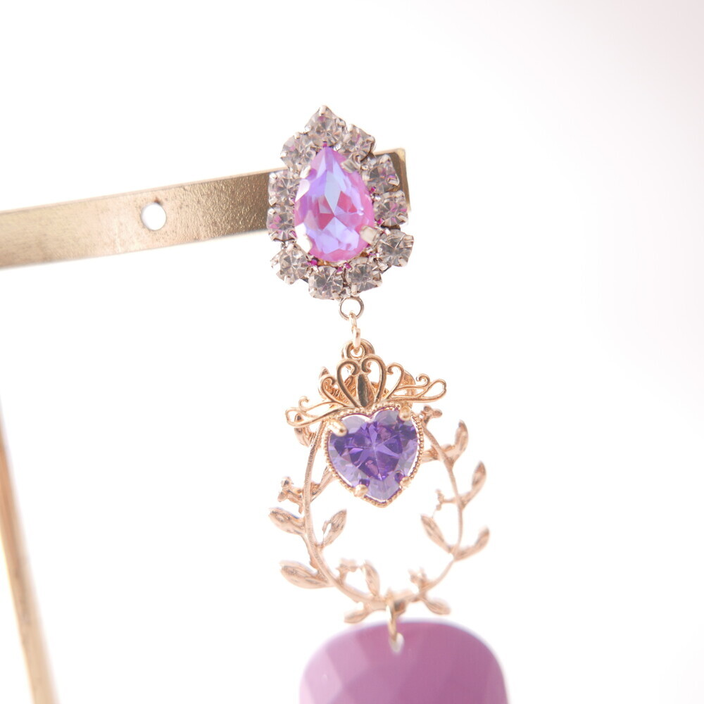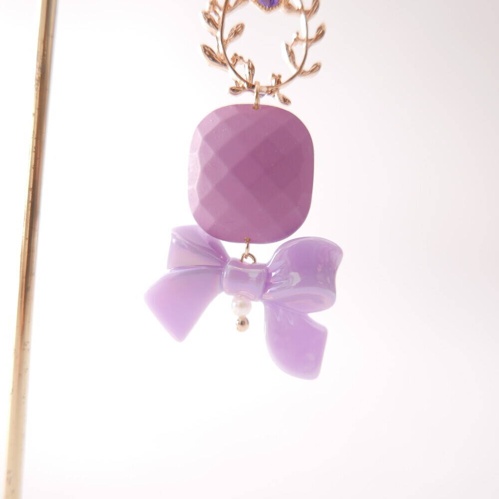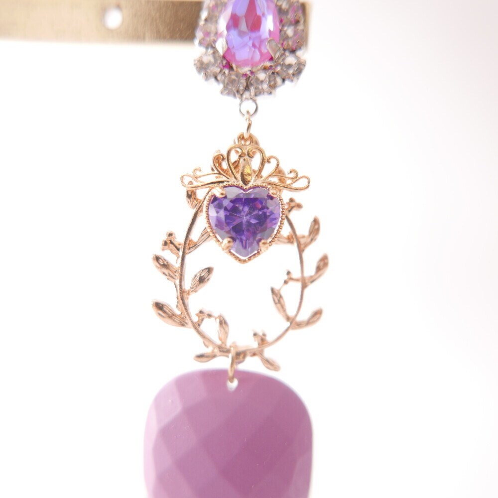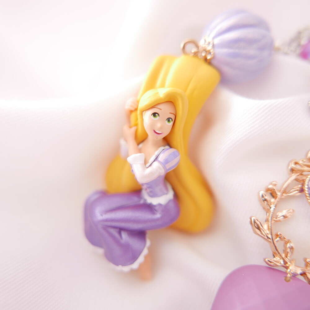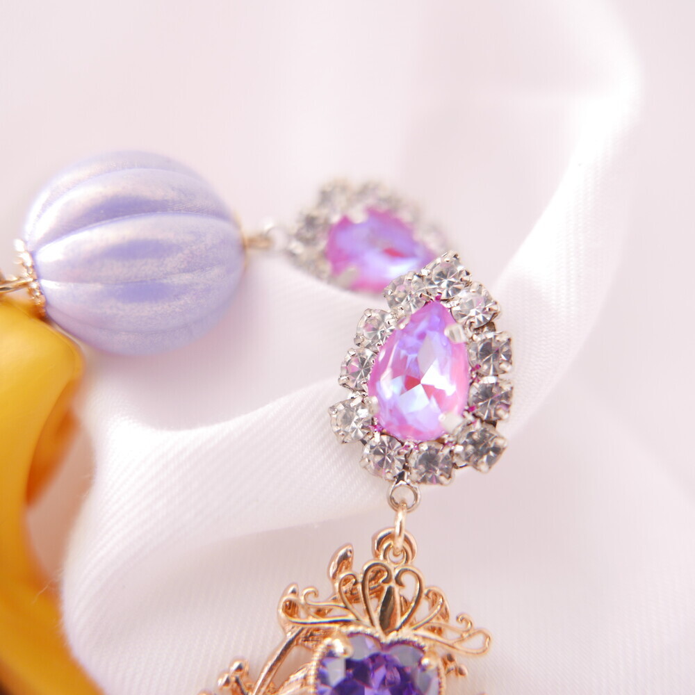 Inspired by the fearless fairy tale heroine, these Rapunzel earrings feature a detailed vintage Rapunzel figure in a flowing lavender dress and signature golden hair. One side displays the iconic character herself, while the other pairs a violet jewel, bow, and laurel-style embellishment for a storybook finish. Crafted using a rare unopened Disney vintage figure.