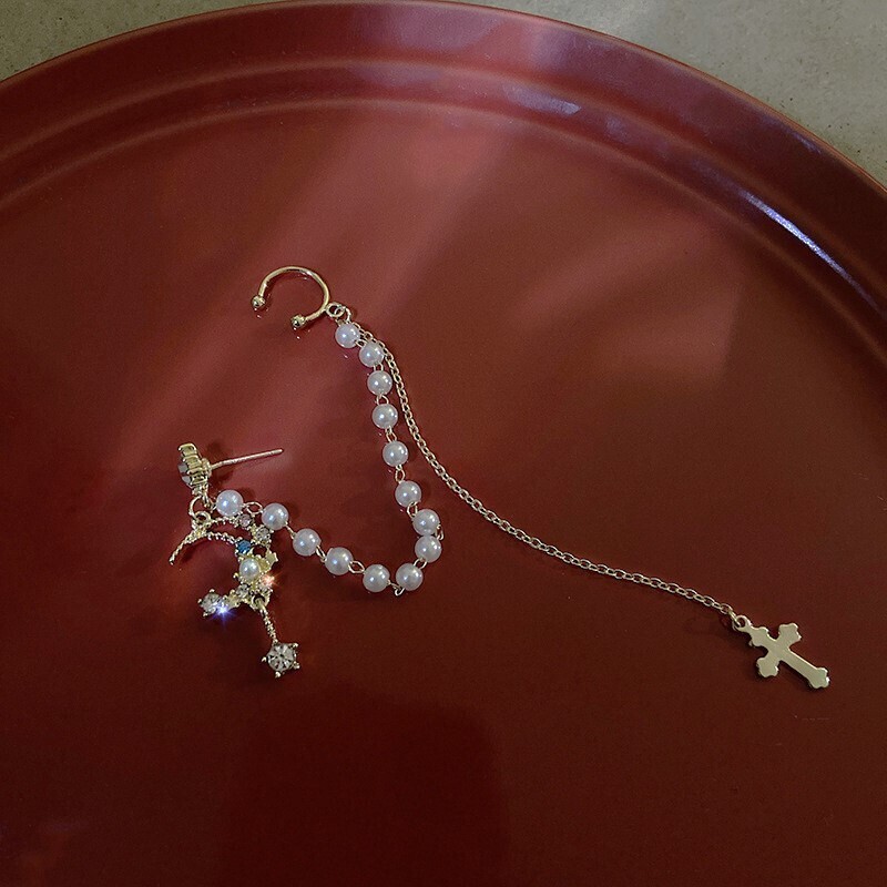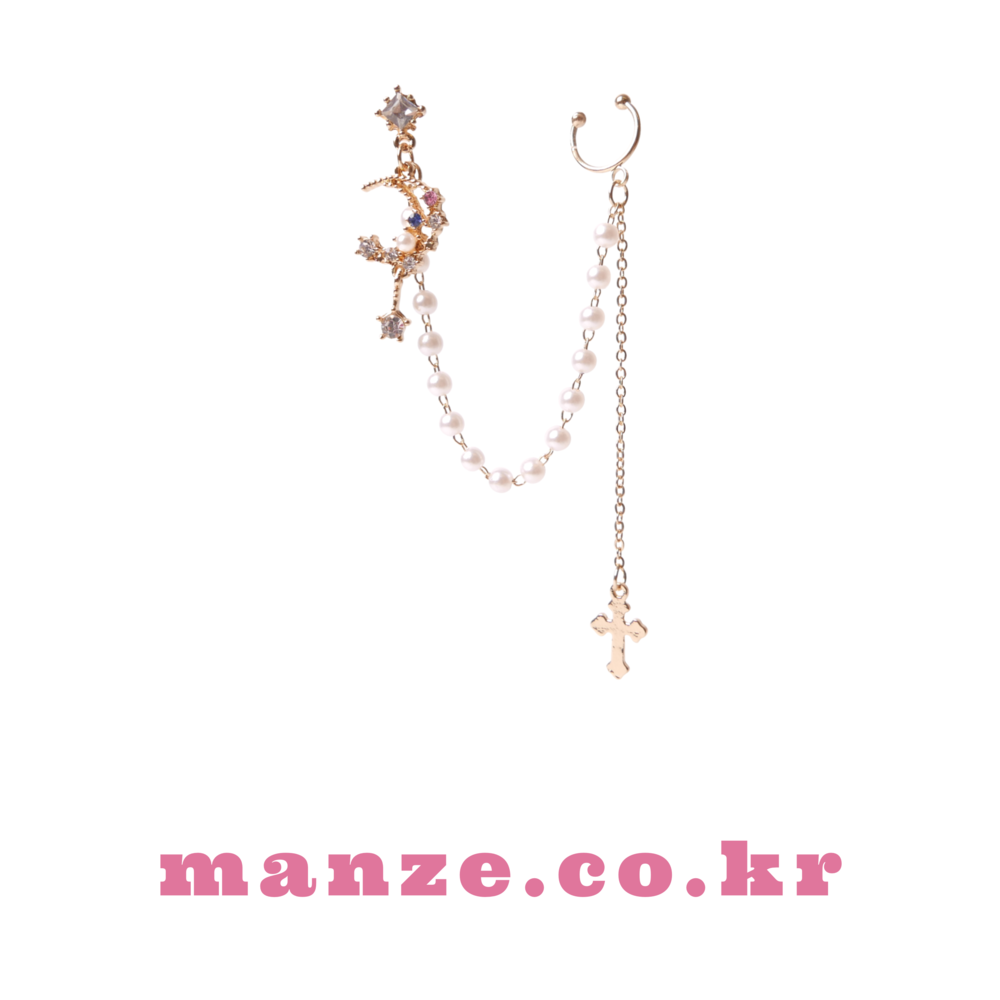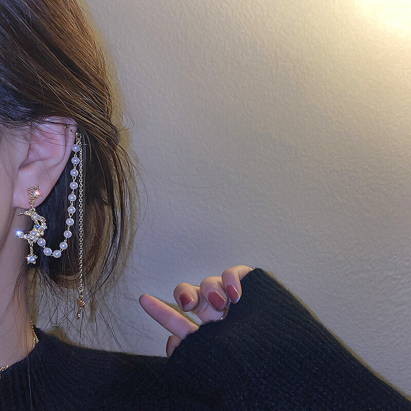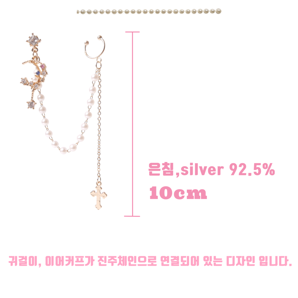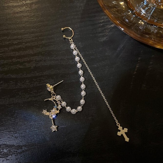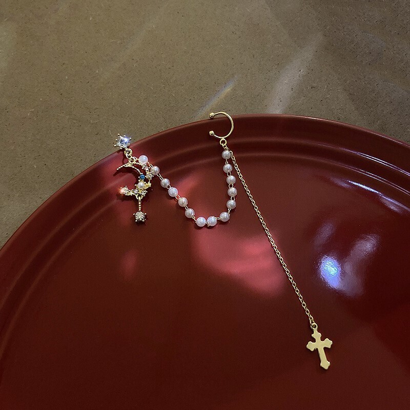 A single earring featuring a moon and stars motif adorned with sparkling gems. The design connects the stud to an ear cuff via a pearl-beaded chain and gold drop chain with a tiny cross charm. This elegant asymmetrical piece is crafted with 92.5% silver post and is available as an earring or clip-on.