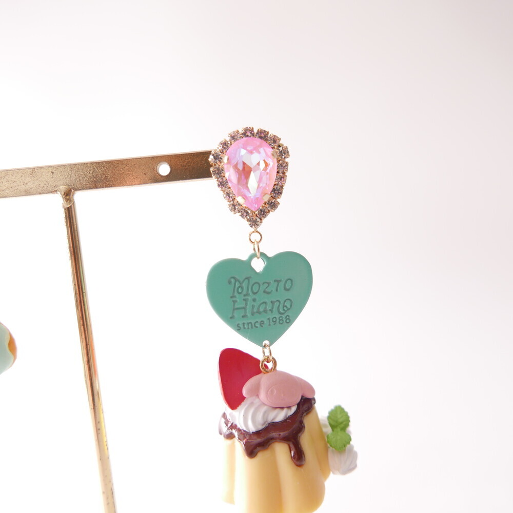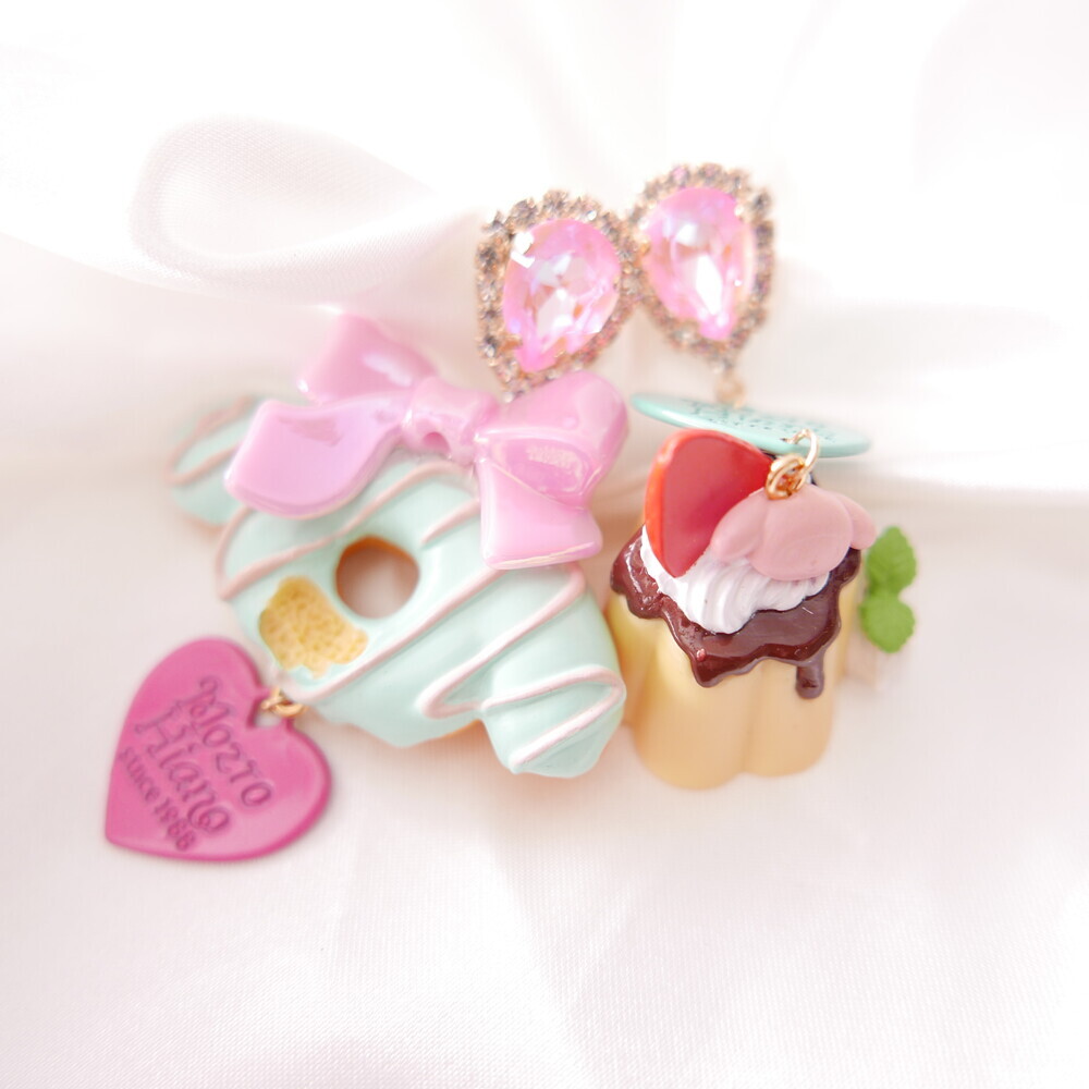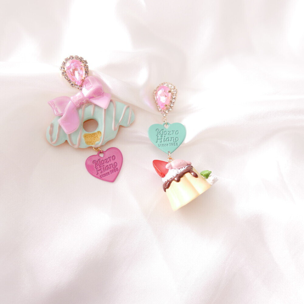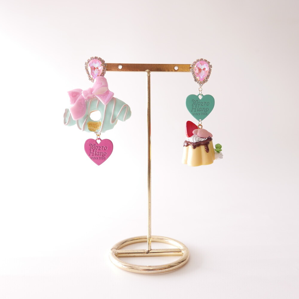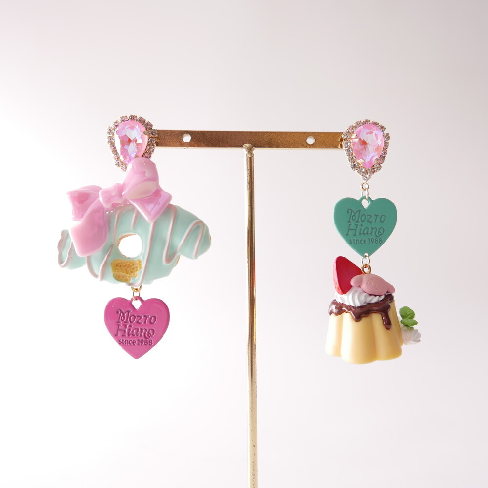 Add a sweet twist to your outfit with these dessert-inspired earrings featuring a pastel green melon donut and a custard pudding topped with whipped cream and a strawberry. Accented with colorful heart charms and glittery pink studs, these earrings are perfect for those who love unique food jewelry and playful fashion.