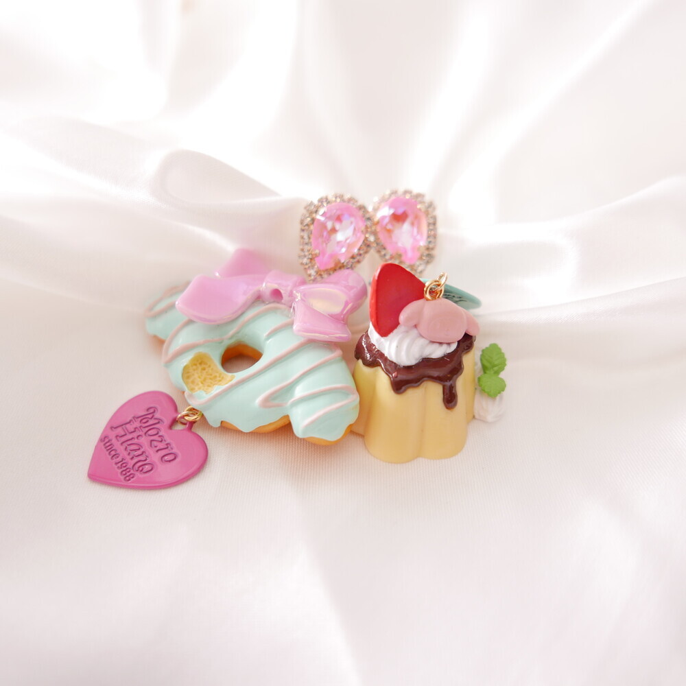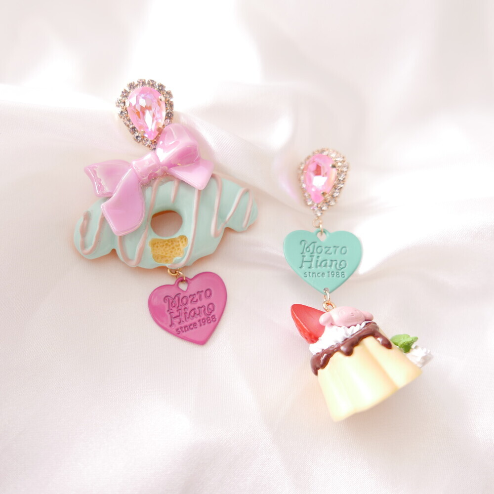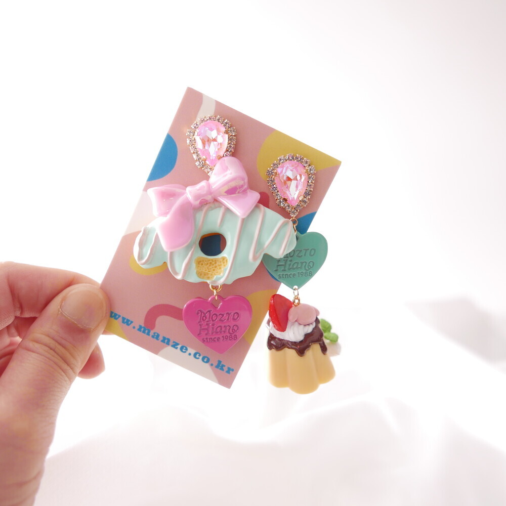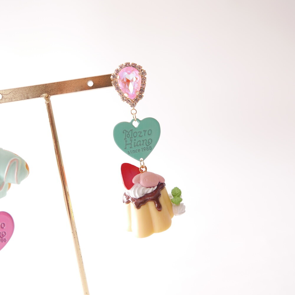 Add a sweet twist to your outfit with these dessert-inspired earrings featuring a pastel green melon donut and a custard pudding topped with whipped cream and a strawberry. Accented with colorful heart charms and glittery pink studs, these earrings are perfect for those who love unique food jewelry and playful fashion.