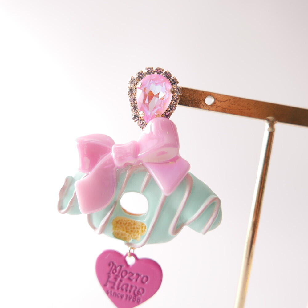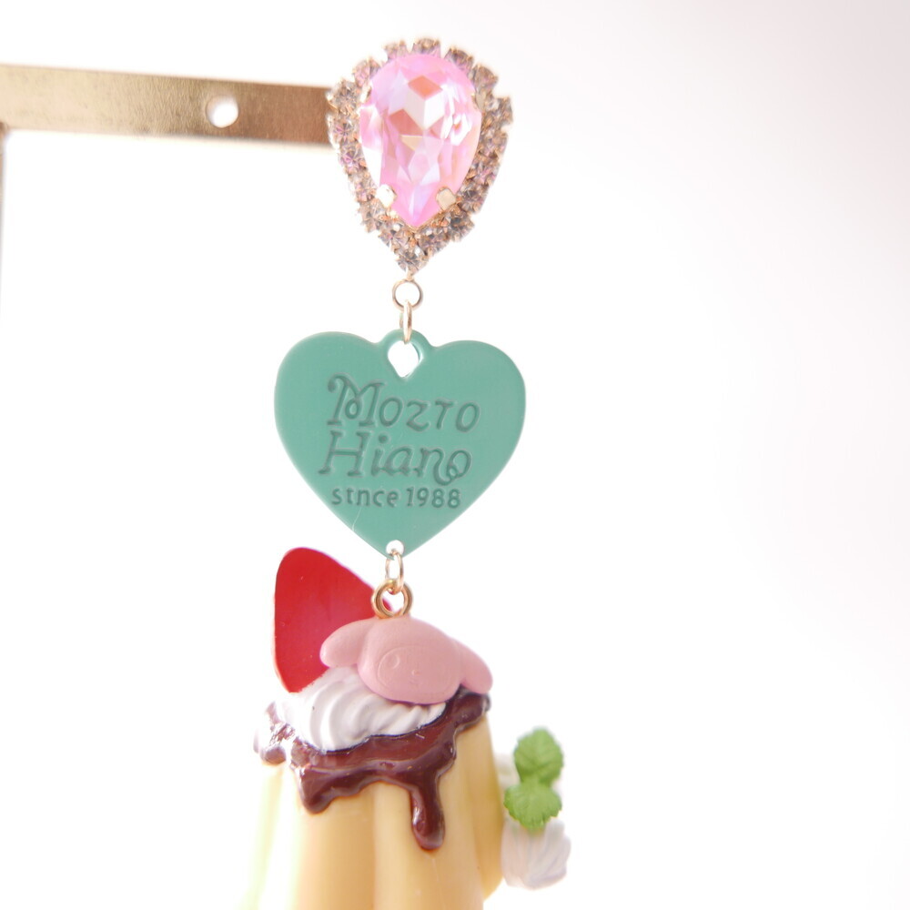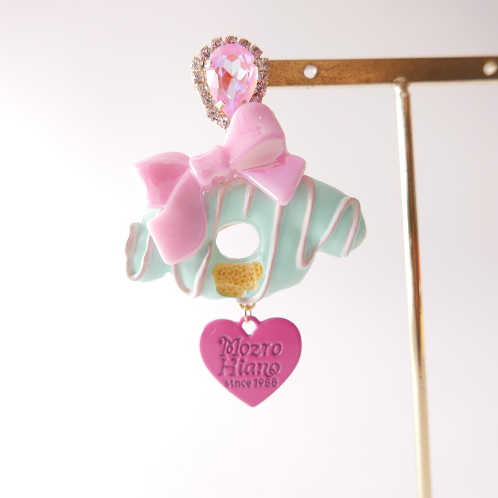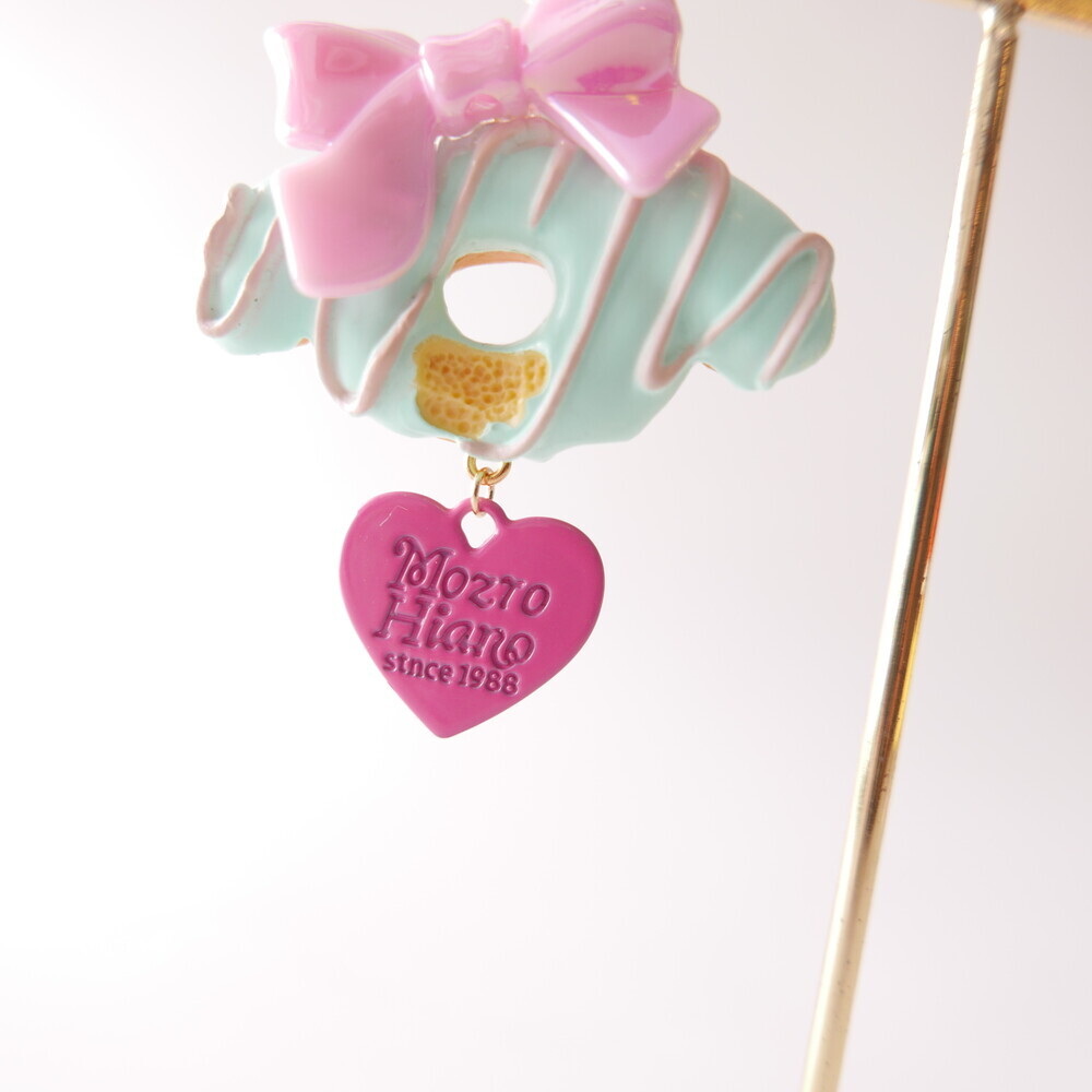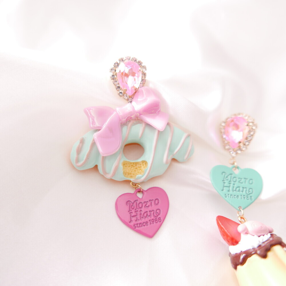 Add a sweet twist to your outfit with these dessert-inspired earrings featuring a pastel green melon donut and a custard pudding topped with whipped cream and a strawberry. Accented with colorful heart charms and glittery pink studs, these earrings are perfect for those who love unique food jewelry and playful fashion.