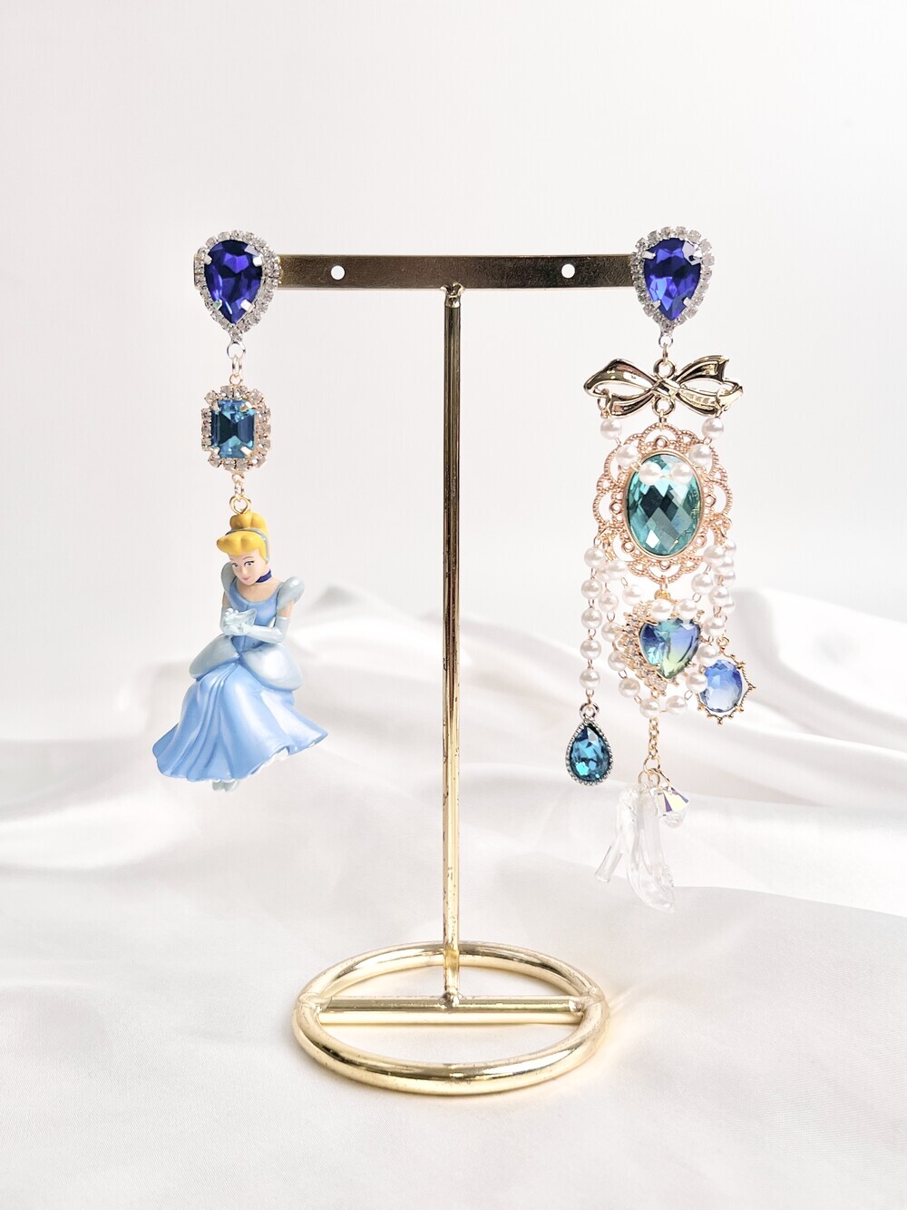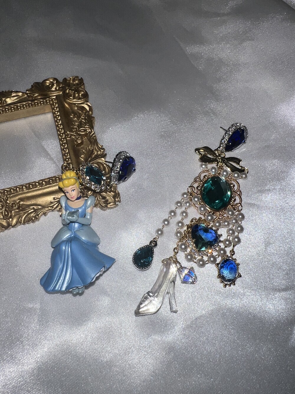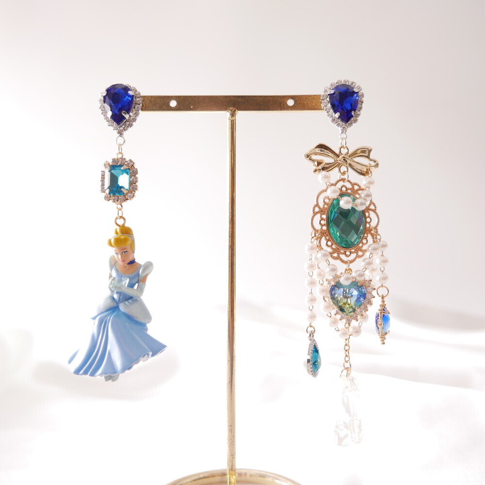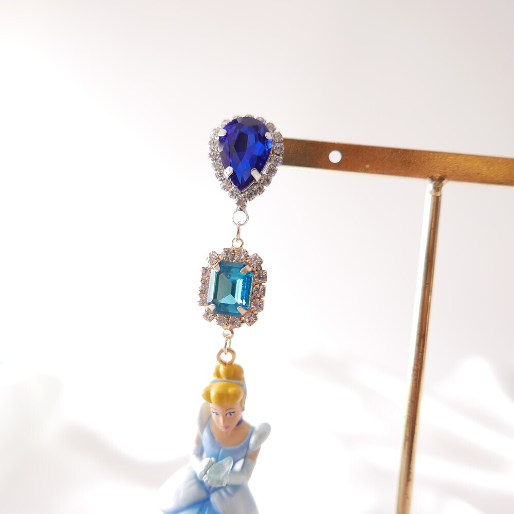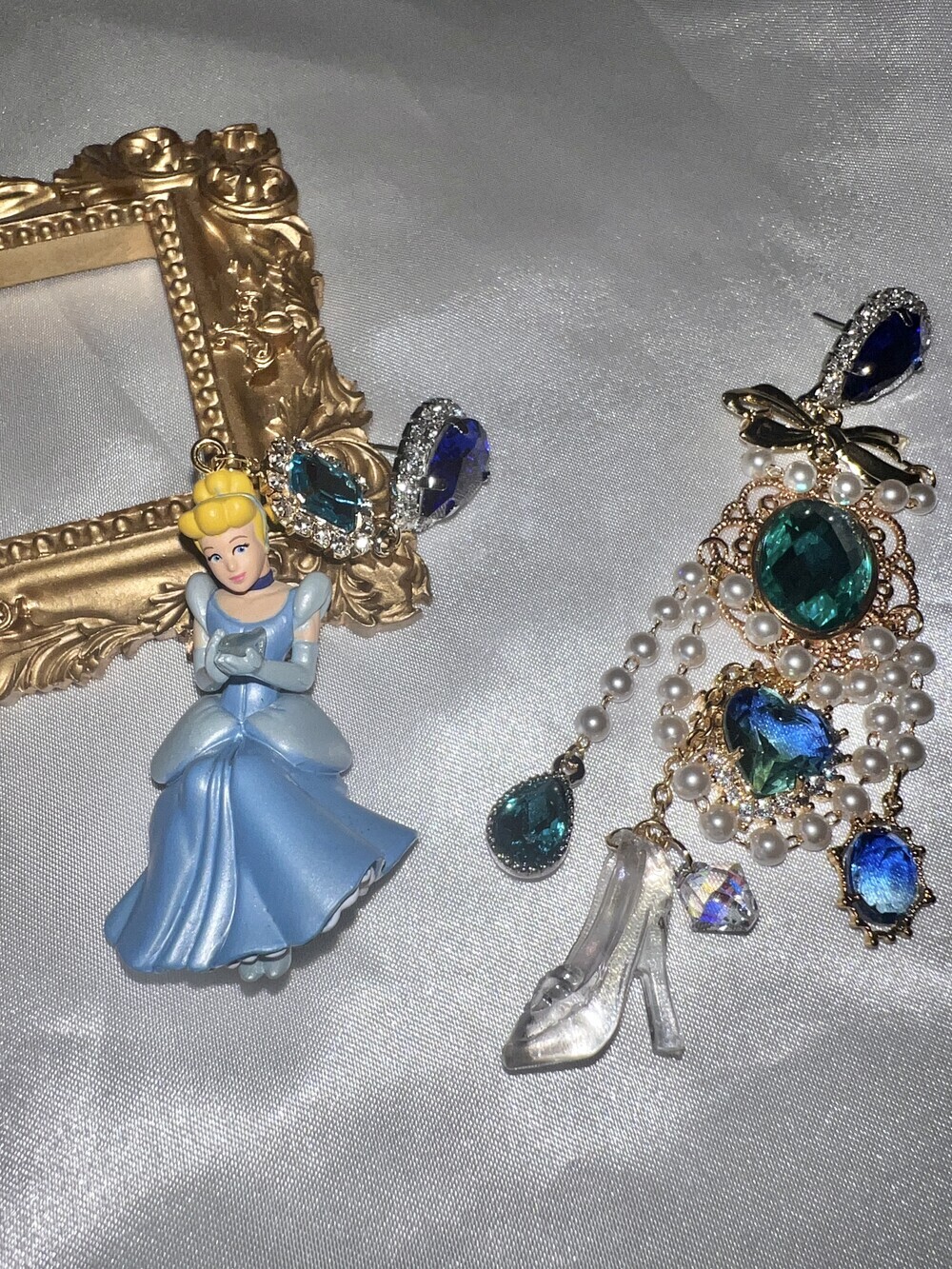 A dazzling pair that tells the tale of Cinderella just before midnight. This unique design features a detailed vintage toy of Cinderella holding her iconic glass slipper, surrounded by sparkling blue gemstones and pearl chains. Every detail is delicately painted from her gown to the tiniest glass shoe. Crafted from a rare, unopened collectible figure, these earrings are full of charm and elegance.