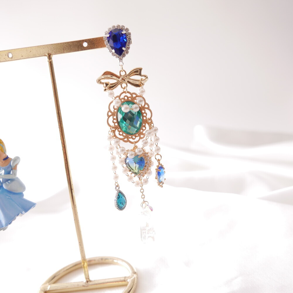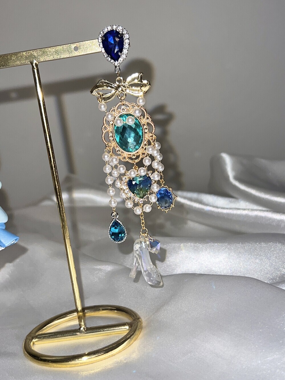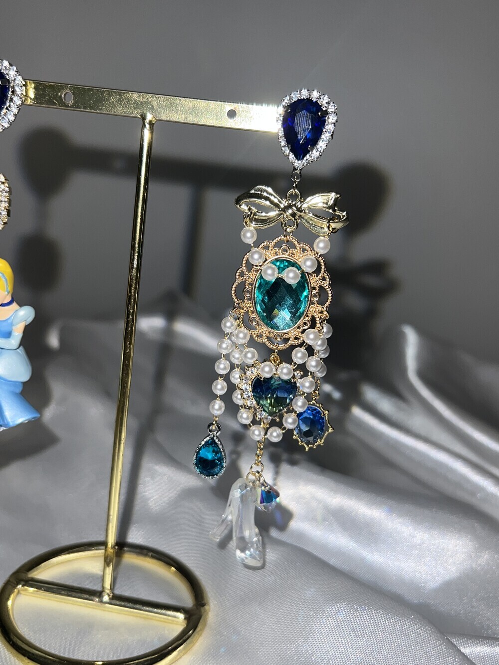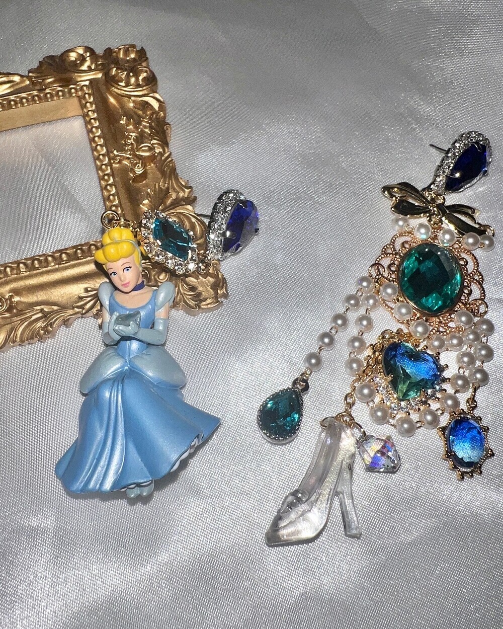 A dazzling pair that tells the tale of Cinderella just before midnight. This unique design features a detailed vintage toy of Cinderella holding her iconic glass slipper, surrounded by sparkling blue gemstones and pearl chains. Every detail is delicately painted from her gown to the tiniest glass shoe. Crafted from a rare, unopened collectible figure, these earrings are full of charm and elegance.