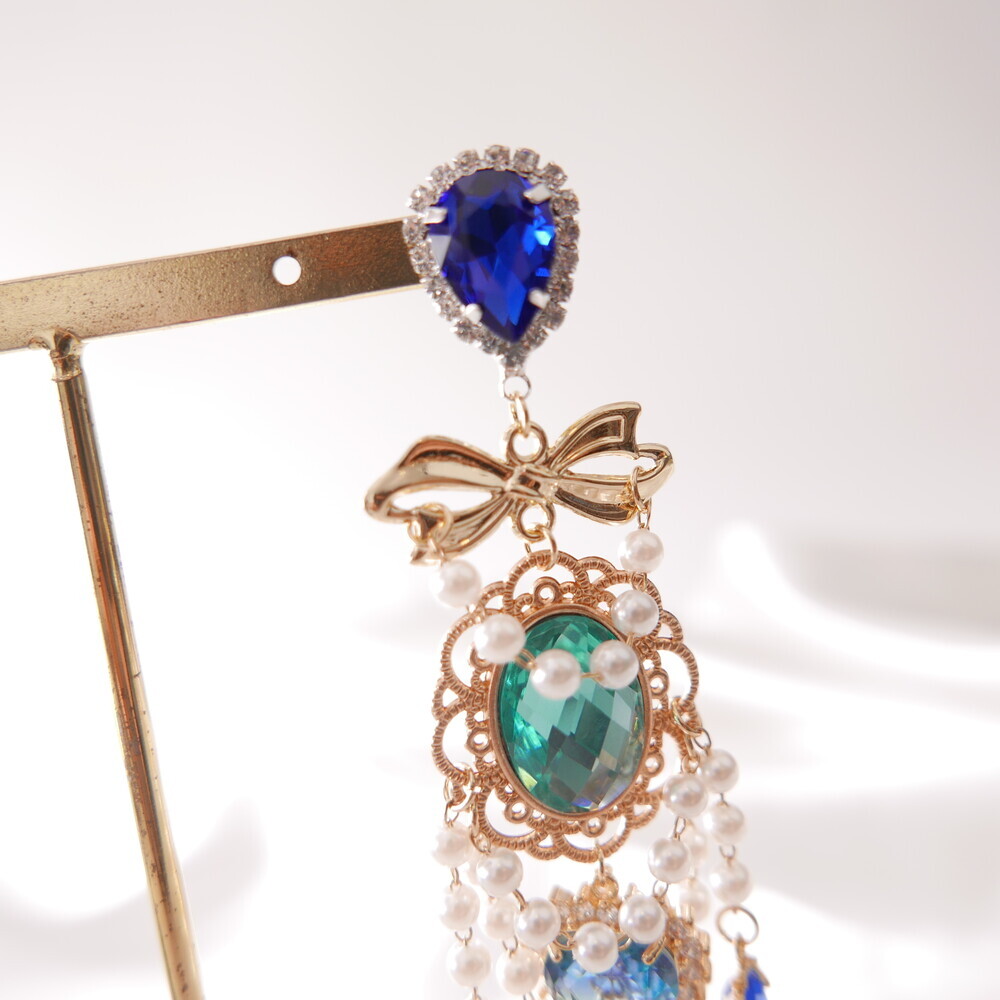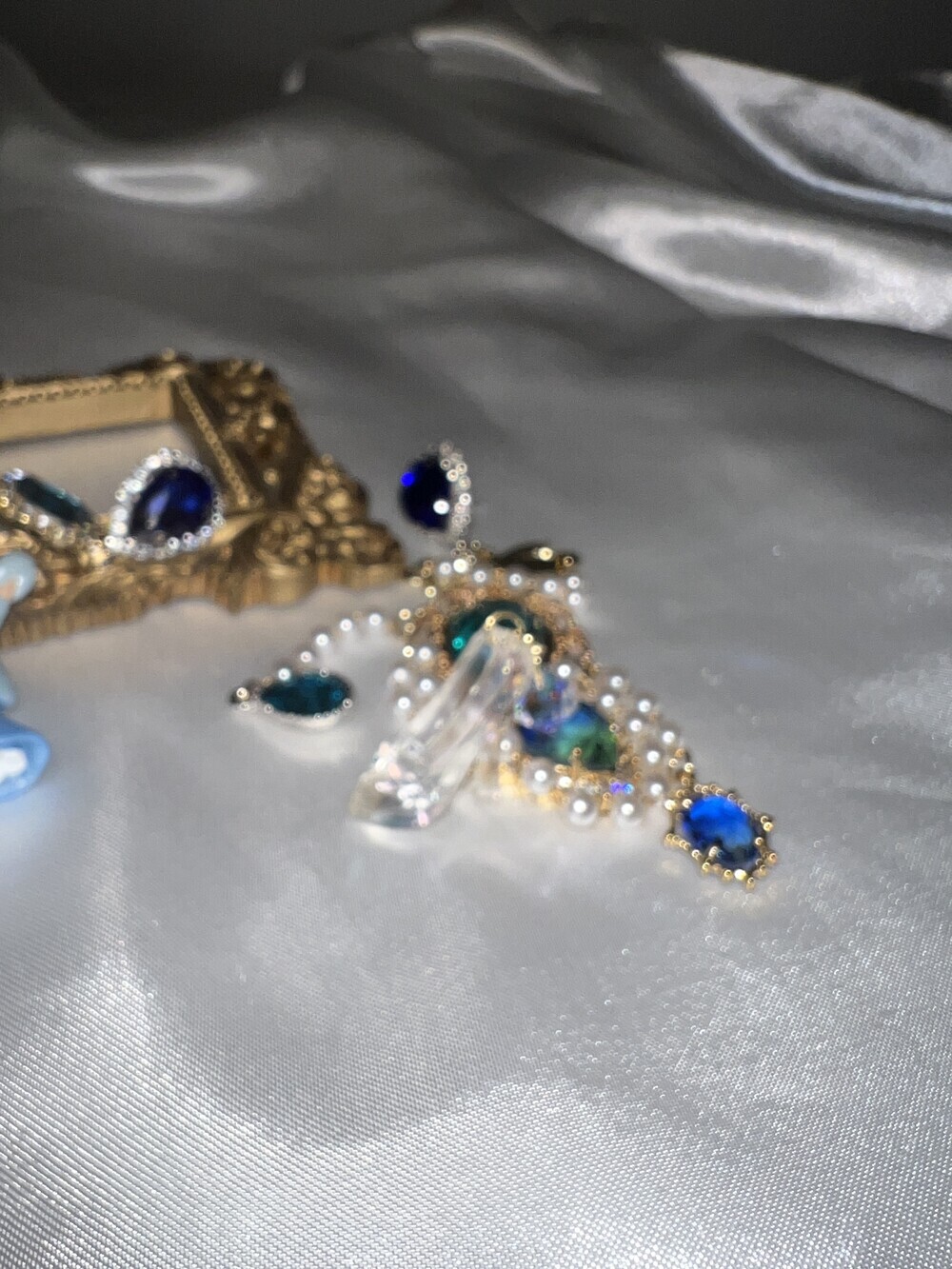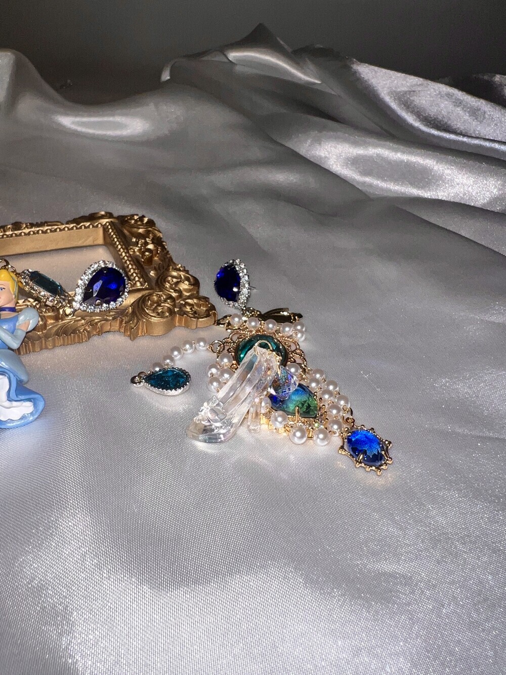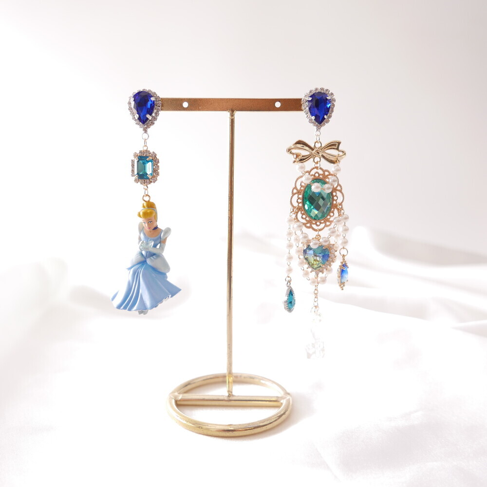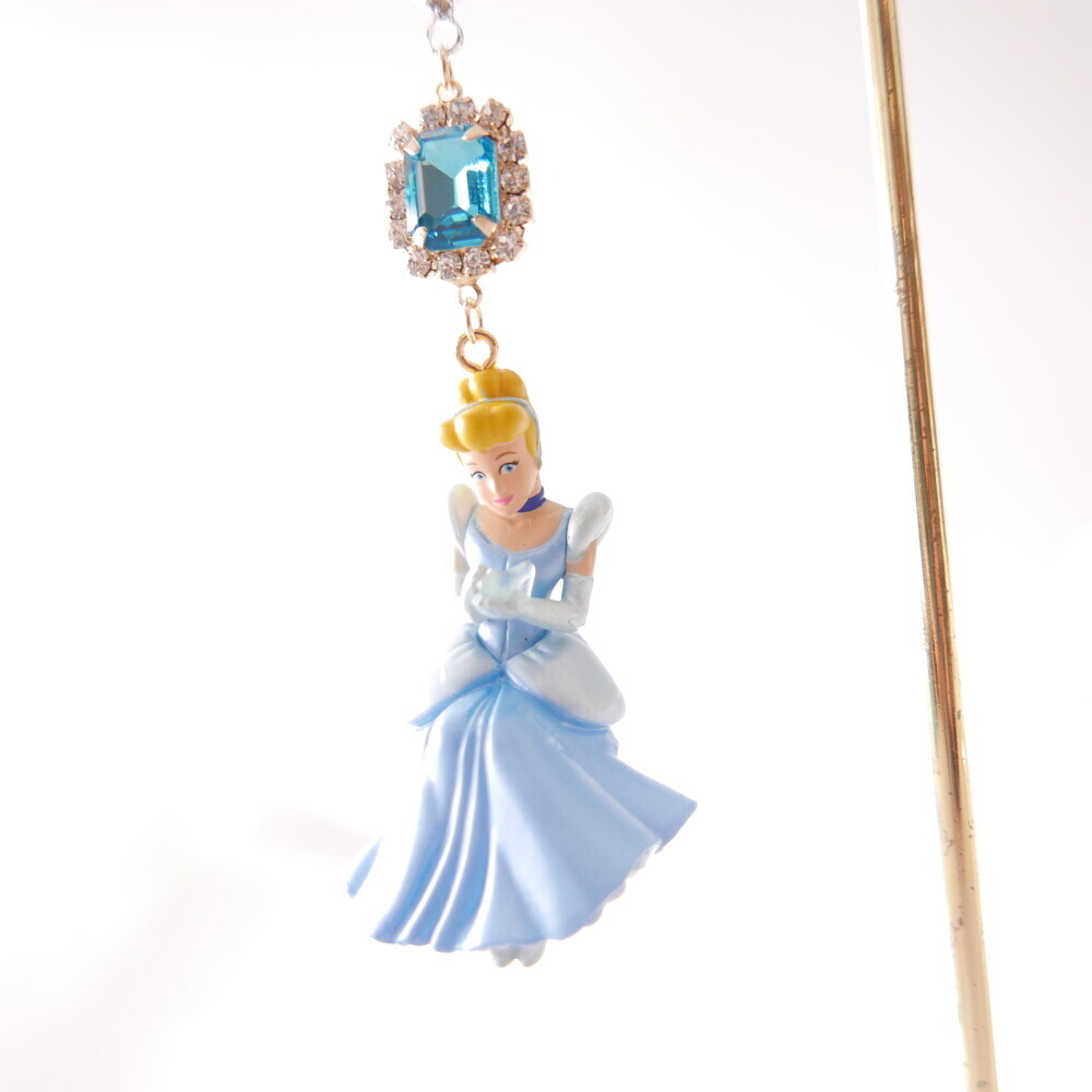 A dazzling pair that tells the tale of Cinderella just before midnight. This unique design features a detailed vintage toy of Cinderella holding her iconic glass slipper, surrounded by sparkling blue gemstones and pearl chains. Every detail is delicately painted from her gown to the tiniest glass shoe. Crafted from a rare, unopened collectible figure, these earrings are full of charm and elegance.