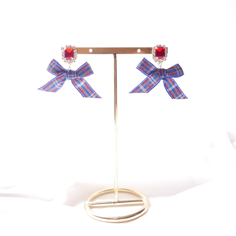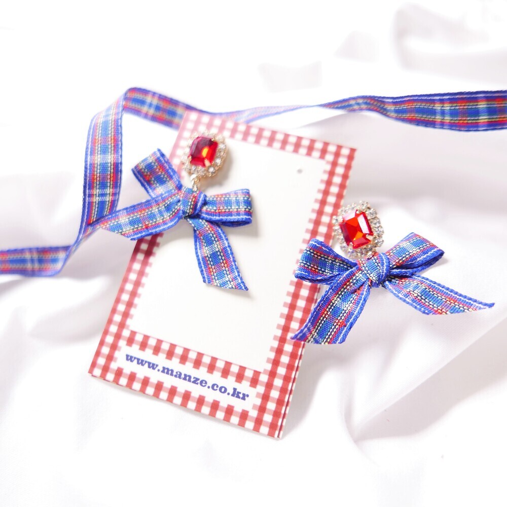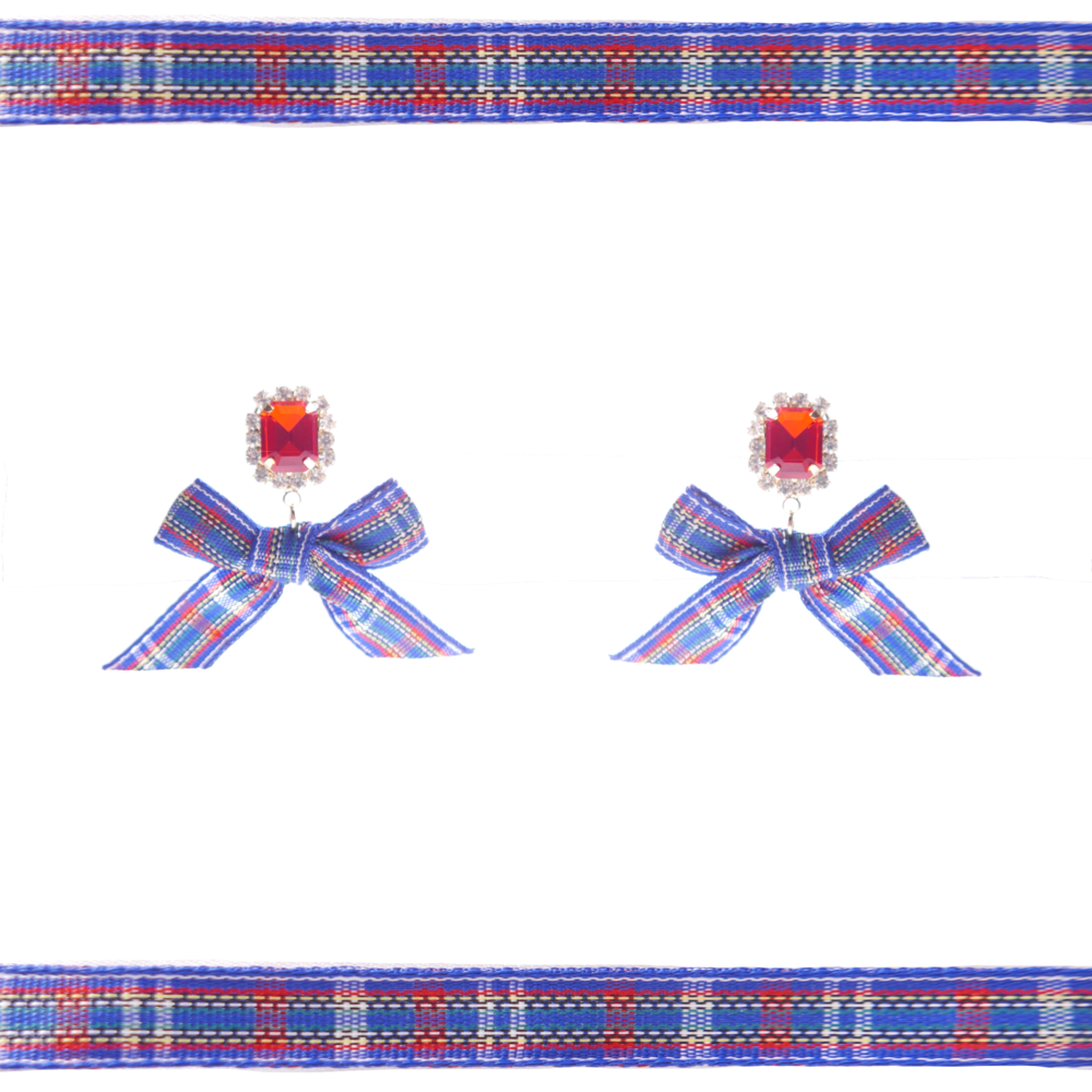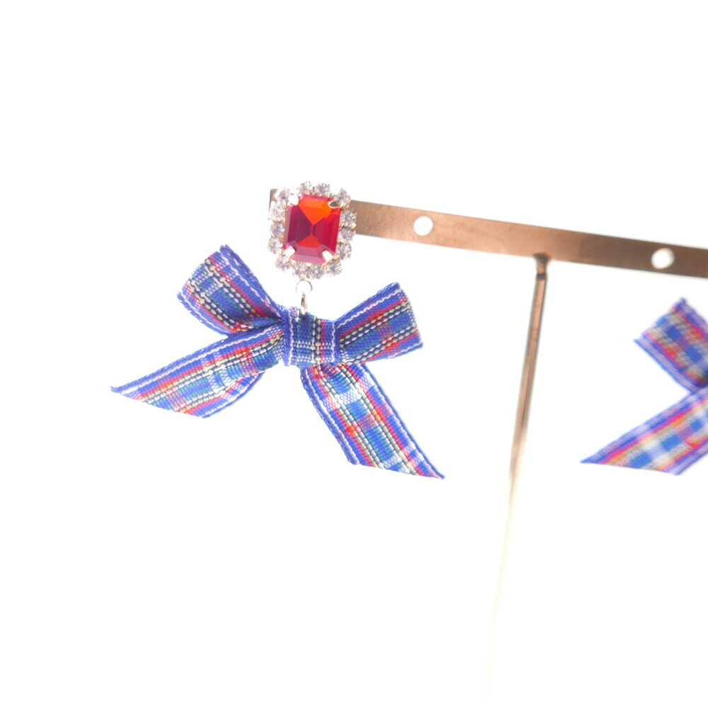 Add a pop of playful charm to your outfit with these kitschy blue ribbon earrings. Featuring a vibrant red gem top and a miniature blue plaid bow, these earrings combine a classic touch with cheerful energy. The narrow 1cm ribbon is finely stitched and detailed, making them a subtle yet standout accessory.