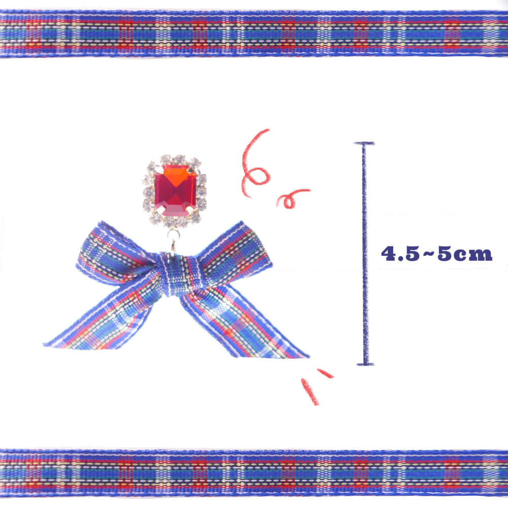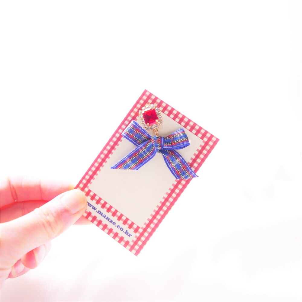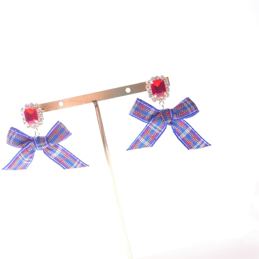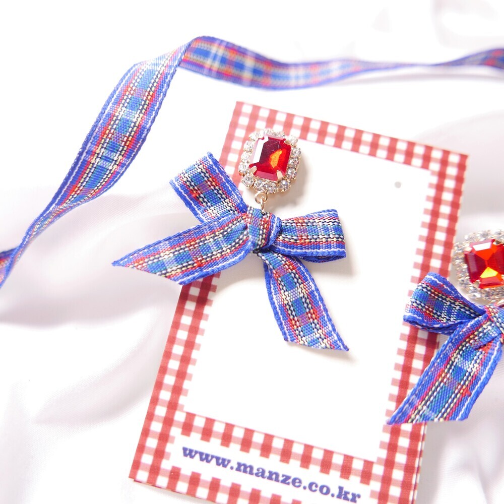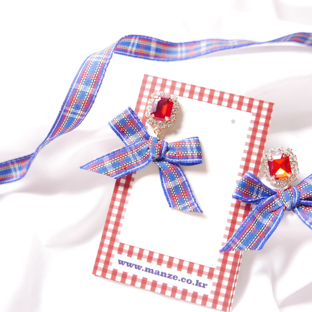Add a pop of playful charm to your outfit with these kitschy blue ribbon earrings. Featuring a vibrant red gem top and a miniature blue plaid bow, these earrings combine a classic touch with cheerful energy. The narrow 1cm ribbon is finely stitched and detailed, making them a subtle yet standout accessory.