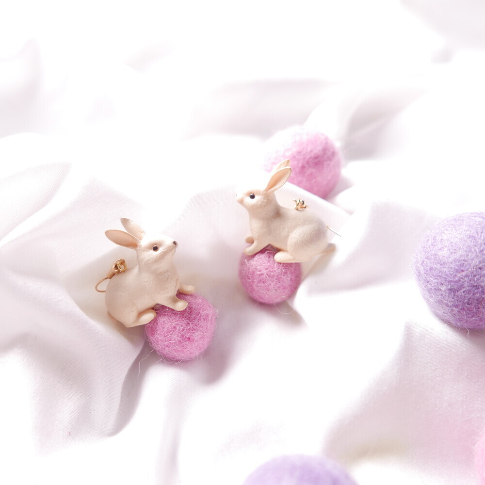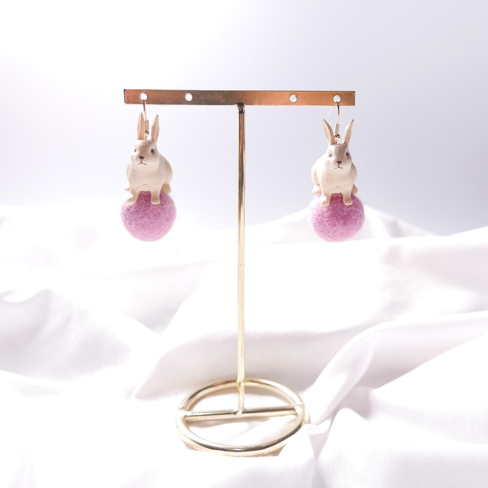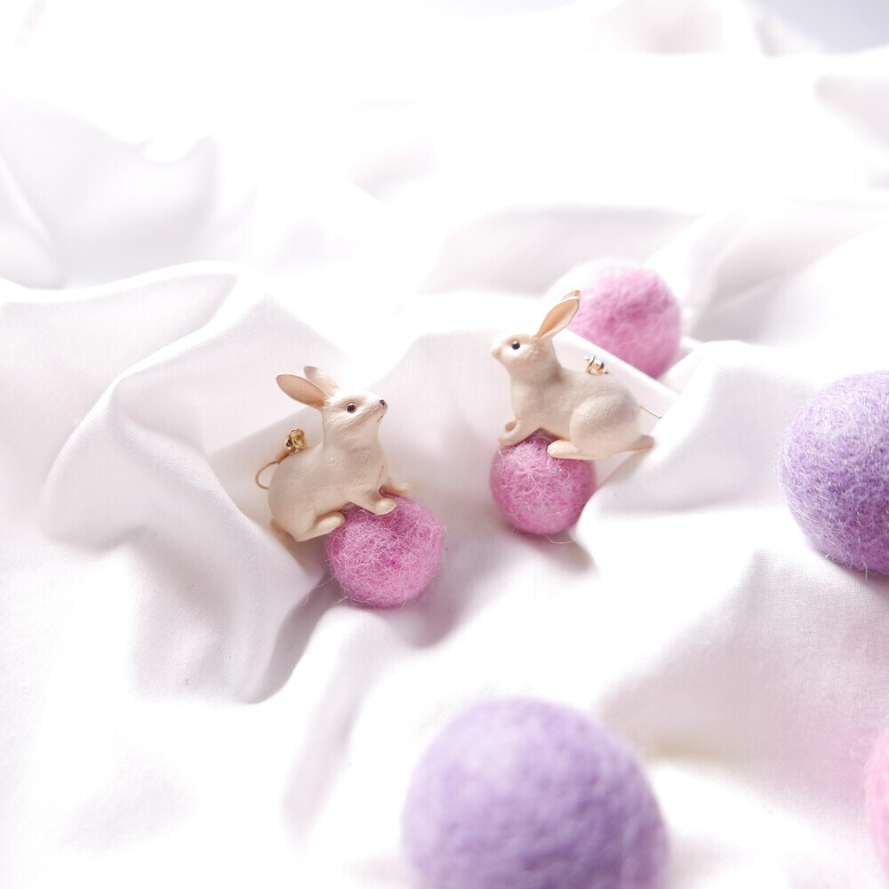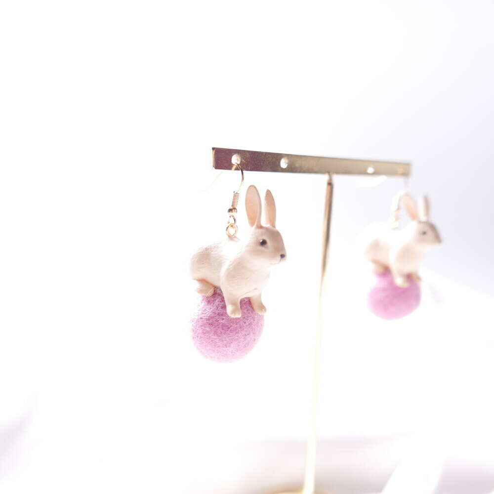 These adorable earrings feature a delicate white bunny perched atop a soft lavender wool pompom. Made from lightweight felt and finished with your choice of hypoallergenic posts, this design brings warmth and charm to any look.