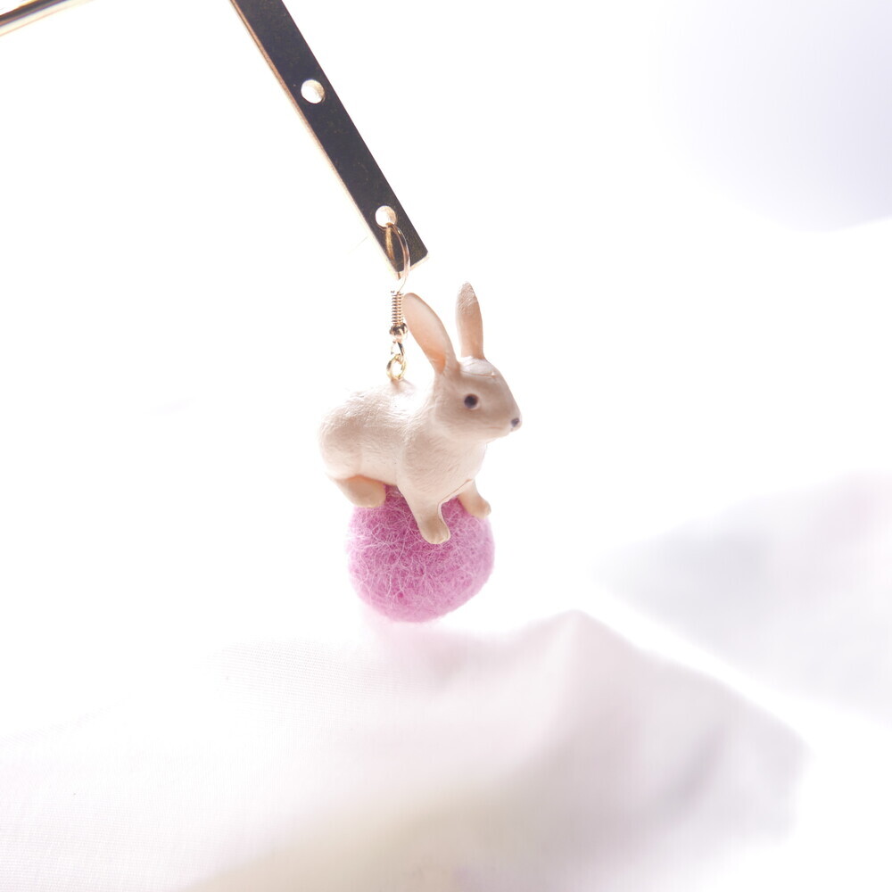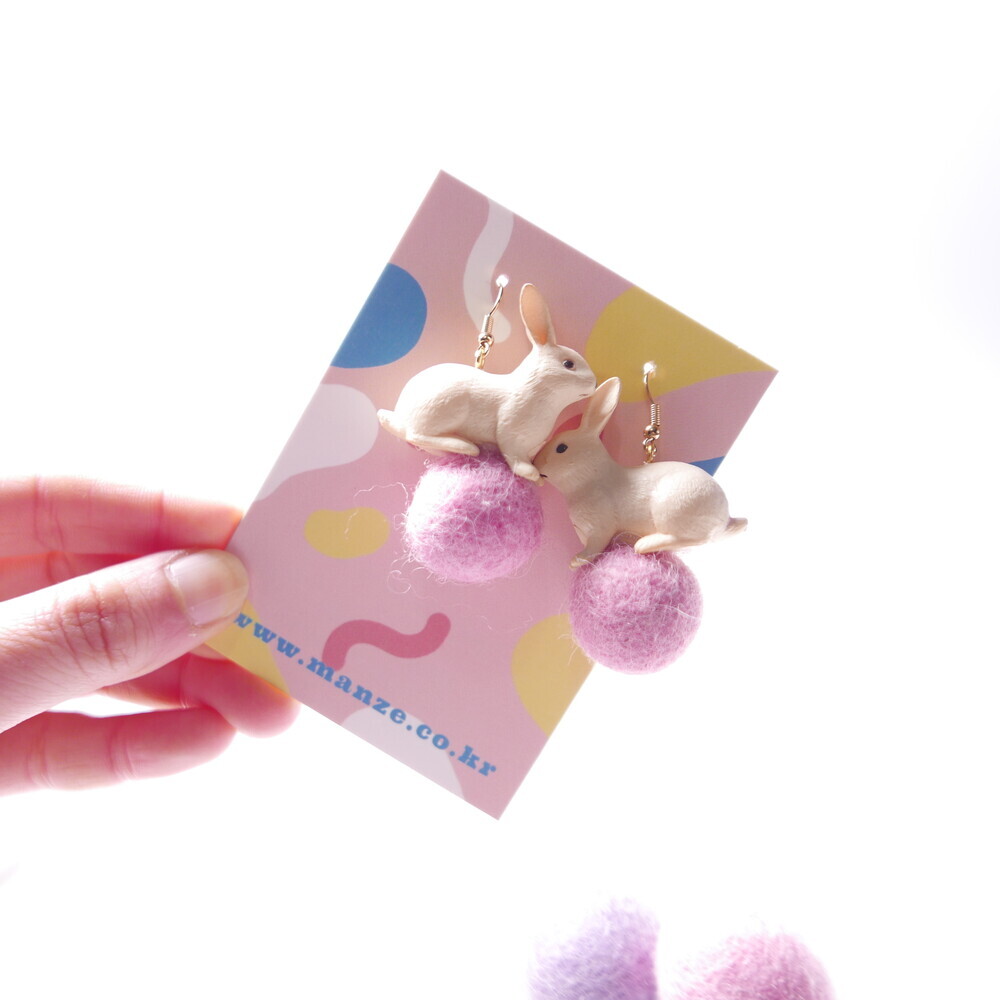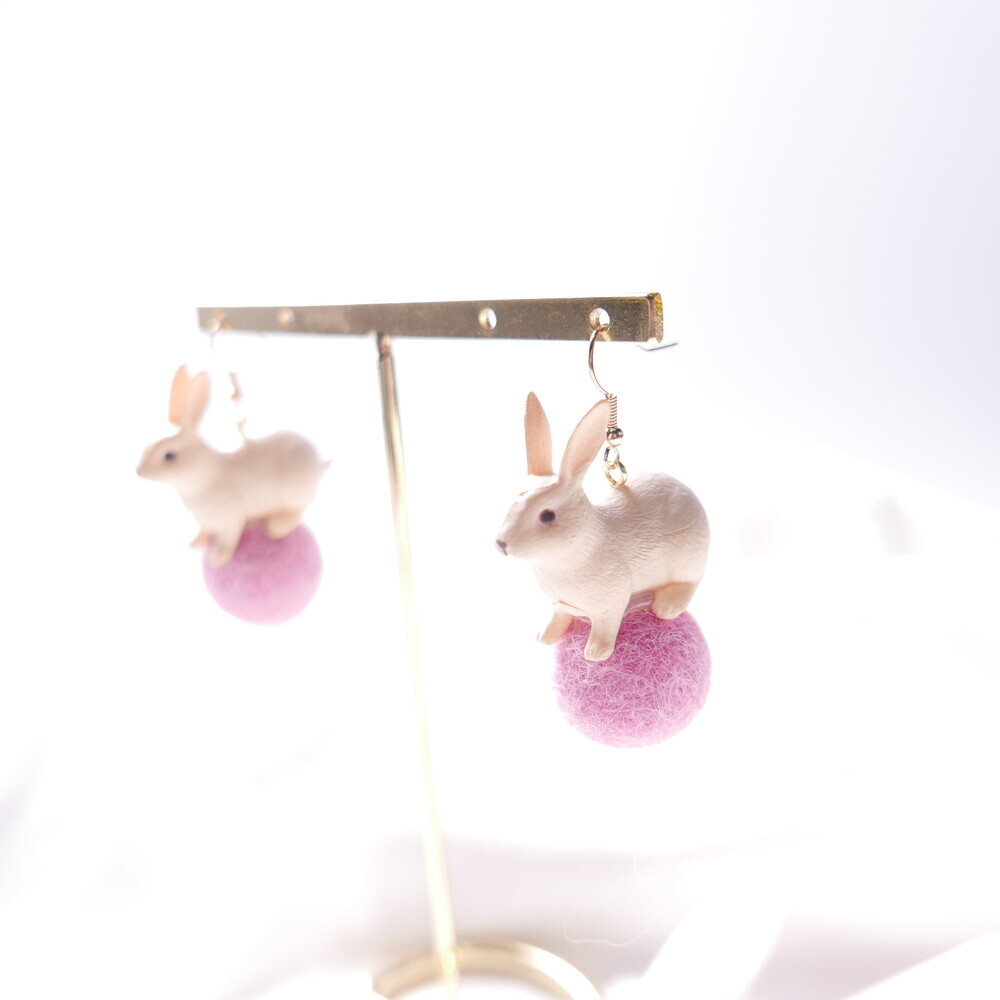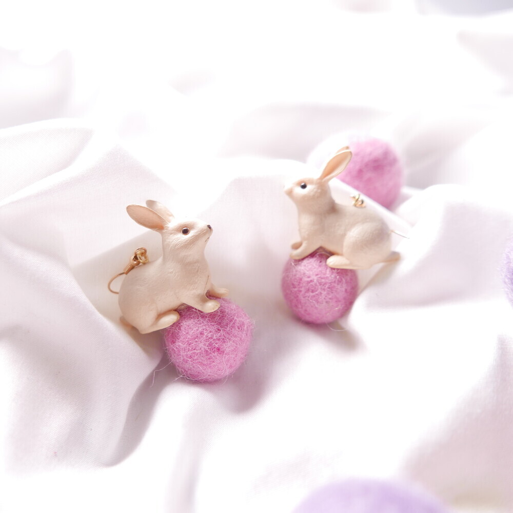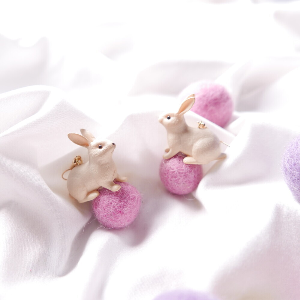 These adorable earrings feature a delicate white bunny perched atop a soft lavender wool pompom. Made from lightweight felt and finished with your choice of hypoallergenic posts, this design brings warmth and charm to any look.