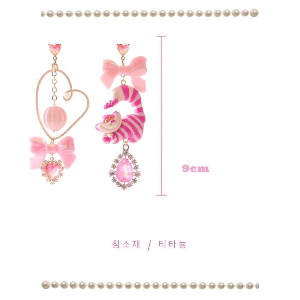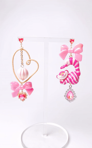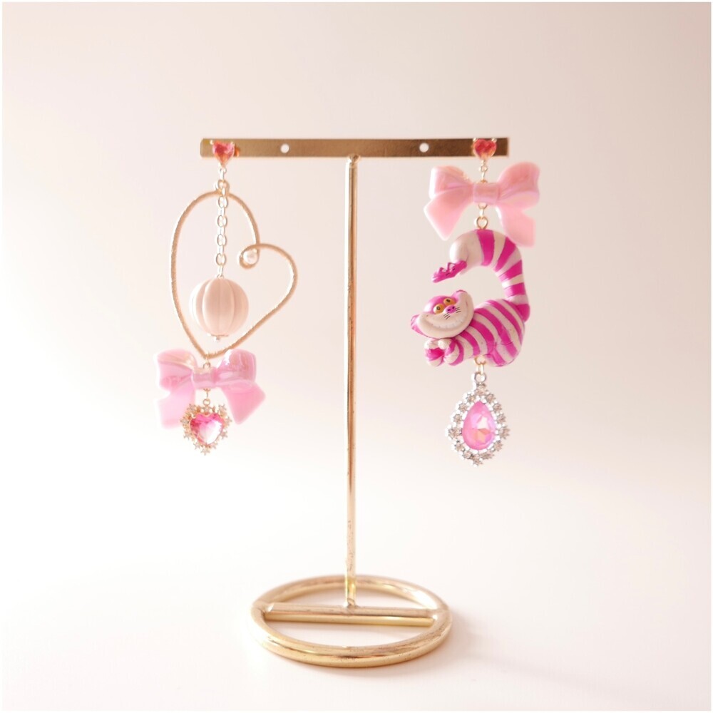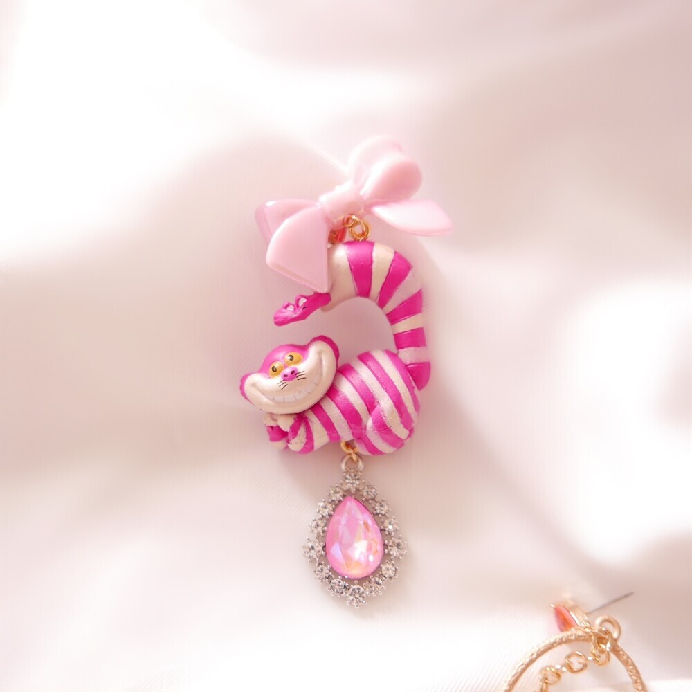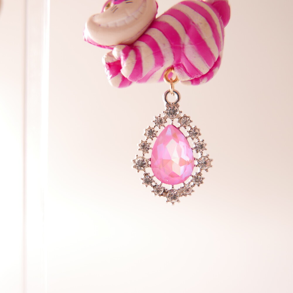 Step into a whimsical world with these Pink Cheshire Cat earrings, inspired by the beloved character from Alice in Wonderland. One earring features the iconic striped cat with a dazzling crystal teardrop, while the other balances with a pastel heart hoop and soft pink ribbon. A perfect accessory for dreamers who love fantasy and playful charm.