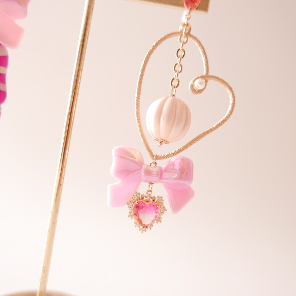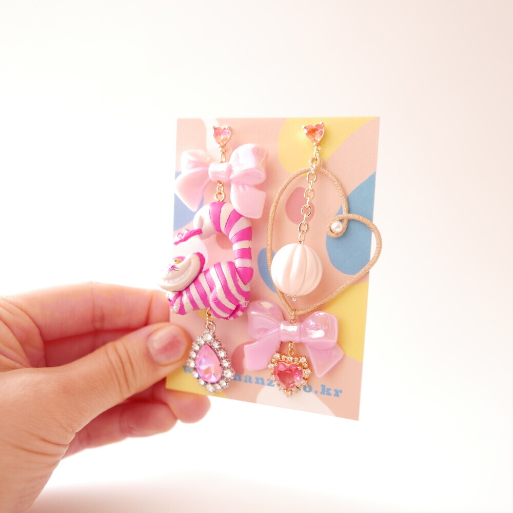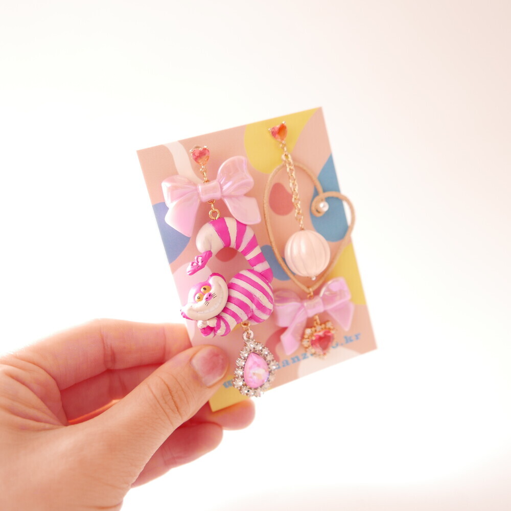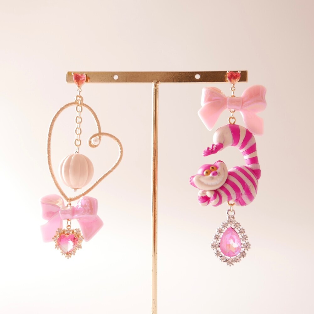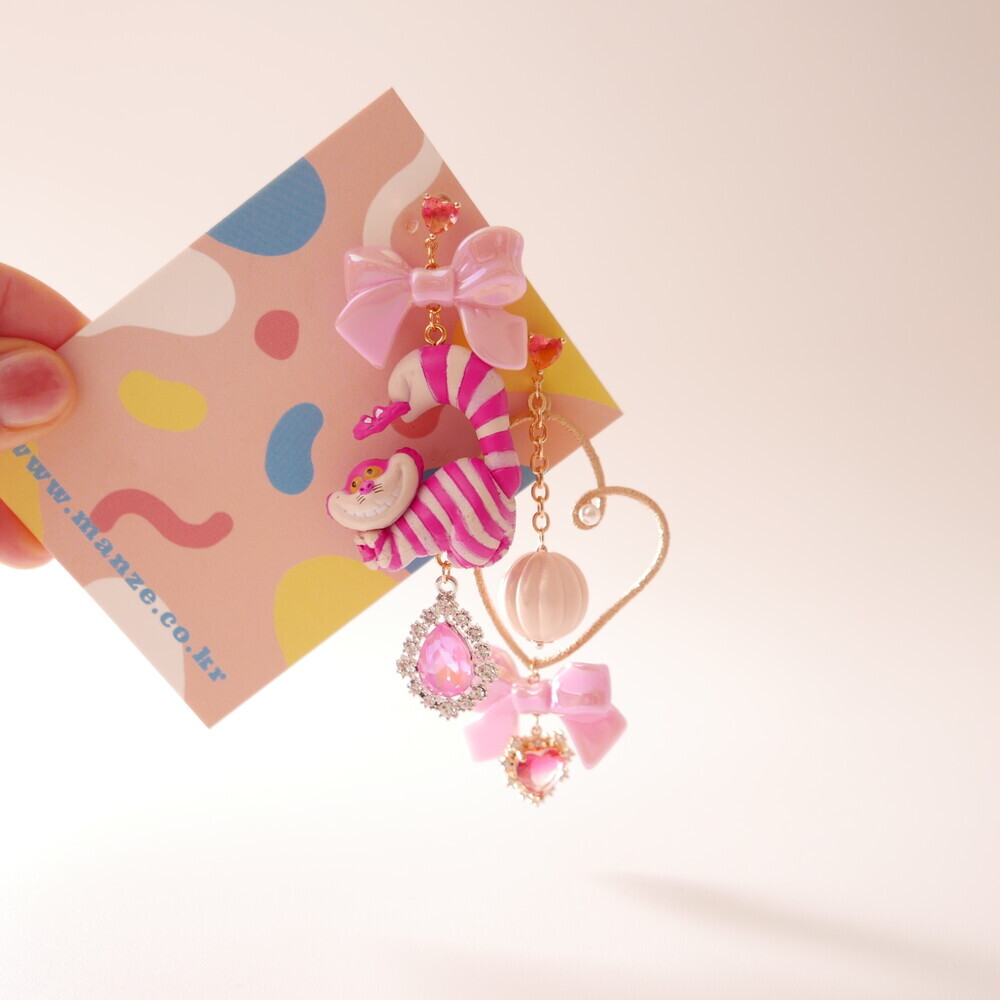 Step into a whimsical world with these Pink Cheshire Cat earrings, inspired by the beloved character from Alice in Wonderland. One earring features the iconic striped cat with a dazzling crystal teardrop, while the other balances with a pastel heart hoop and soft pink ribbon. A perfect accessory for dreamers who love fantasy and playful charm.
