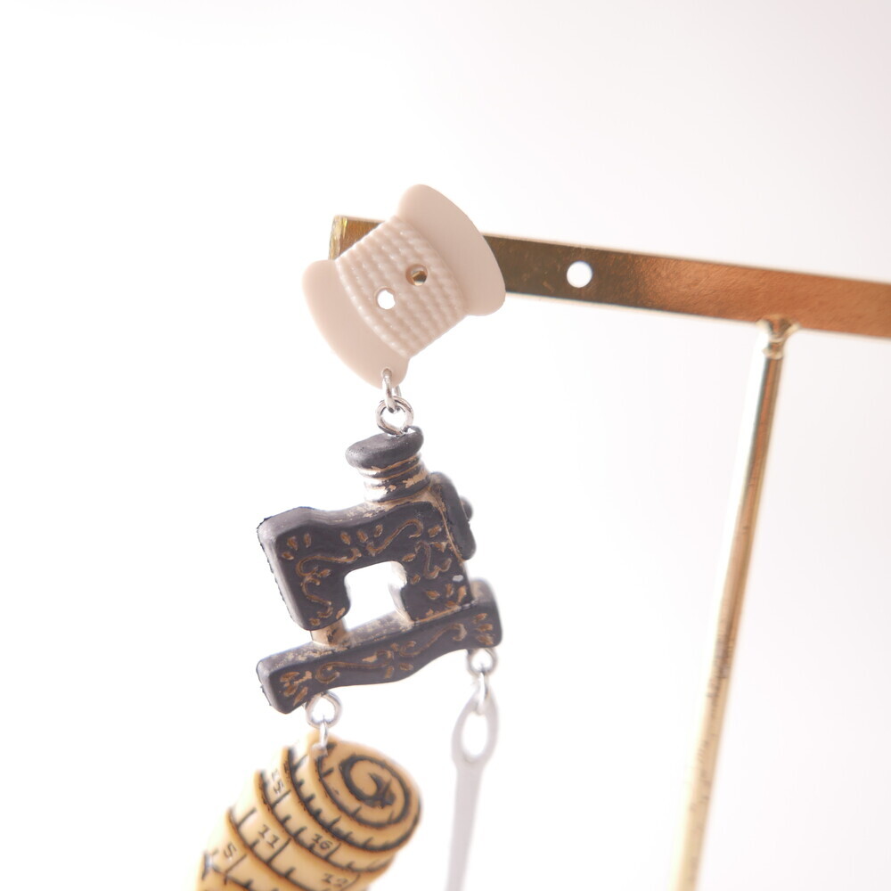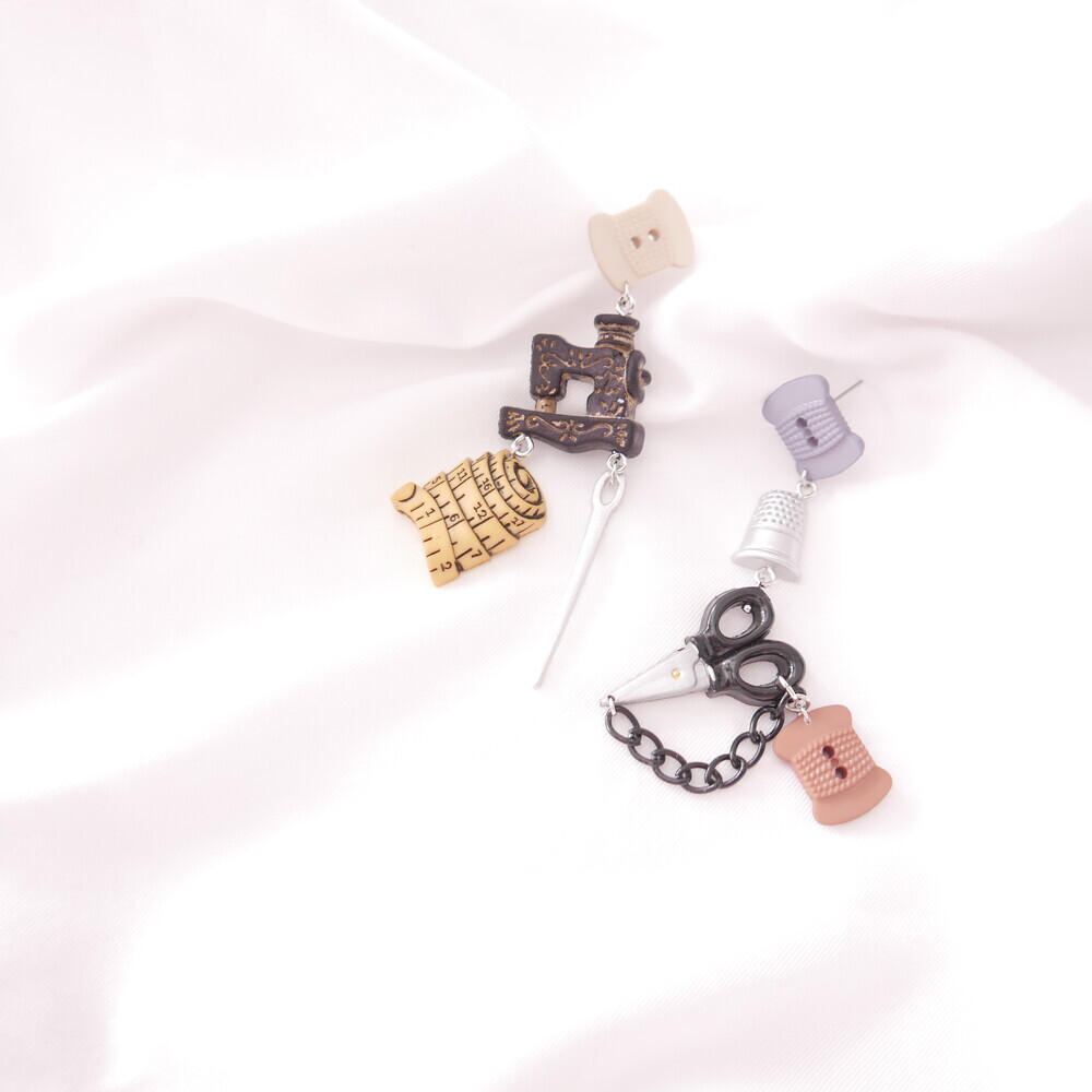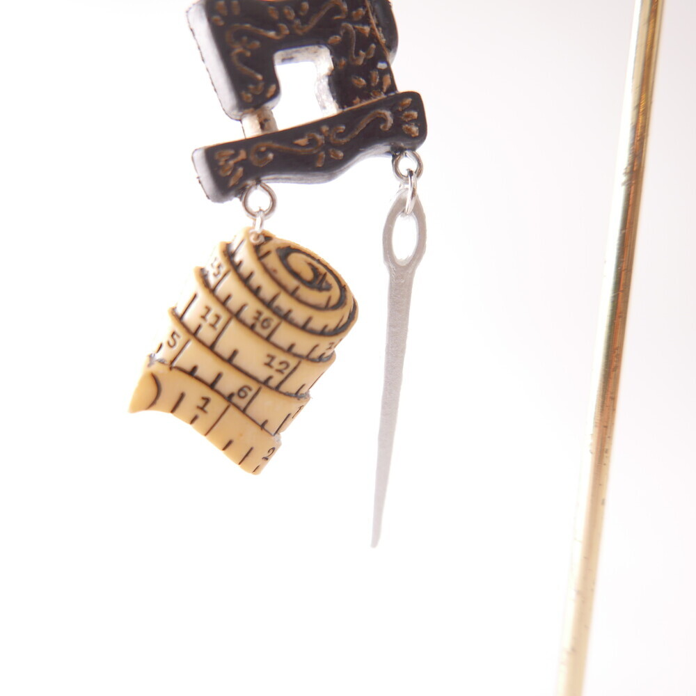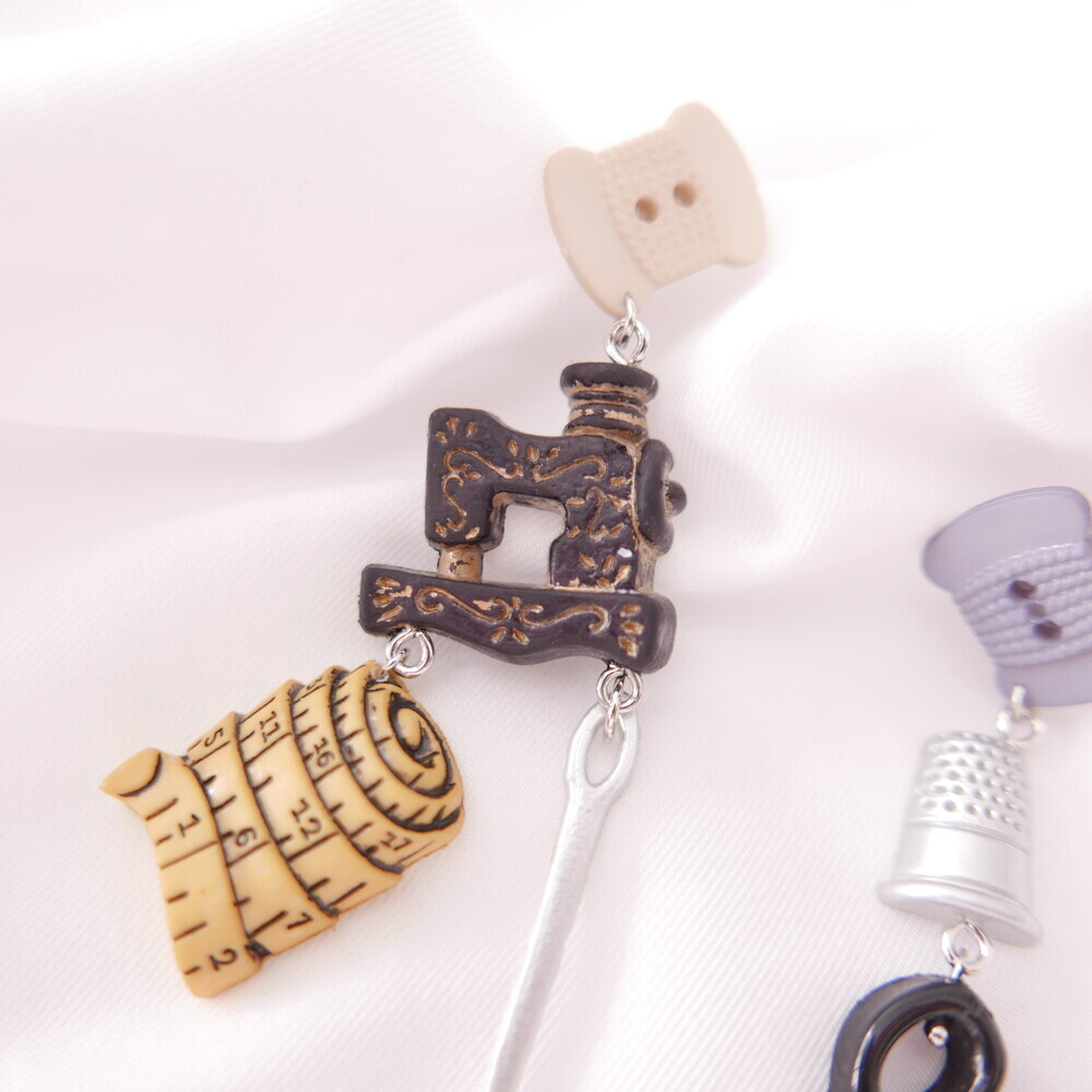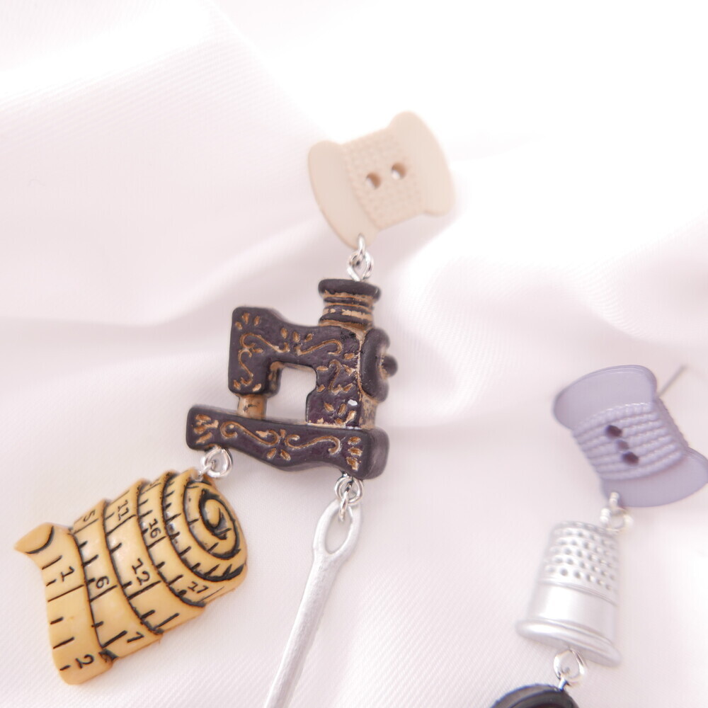Celebrate creativity with these atelier-themed earrings inspired by sewing rooms and handmade artistry. One earring features a vintage-style sewing machine, yellow measuring tape, and a silver needle. The other showcases a silver thimble, black scissors, and a thread bobbin. A charming tribute to craft lovers, tailors, and designers alike.