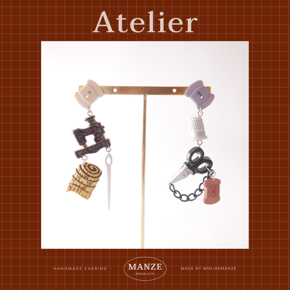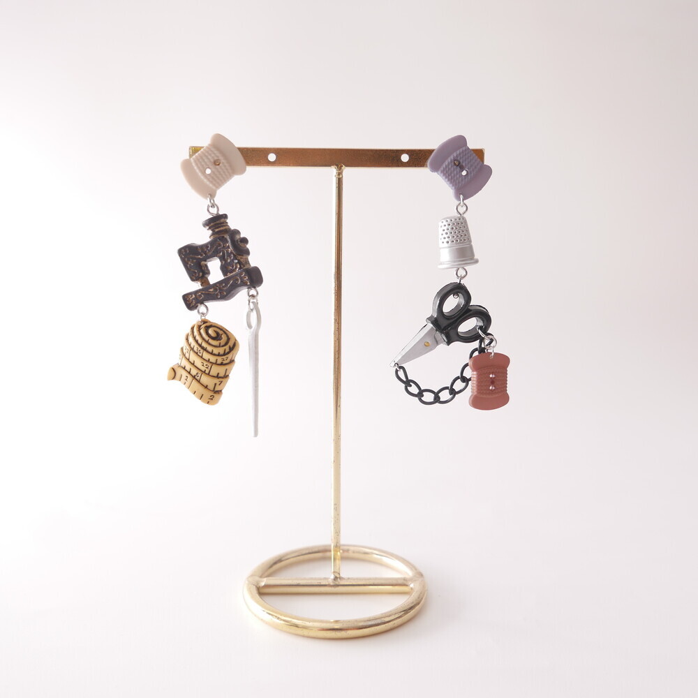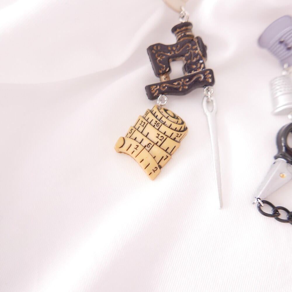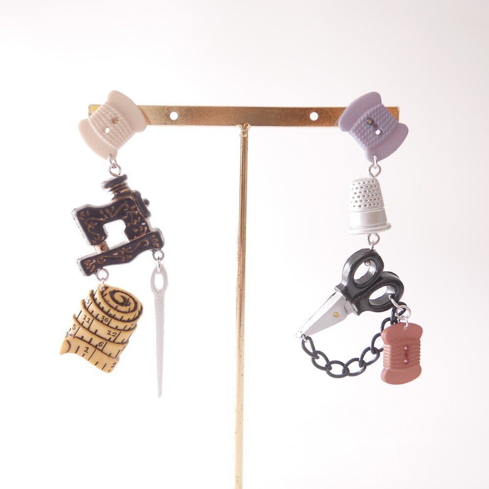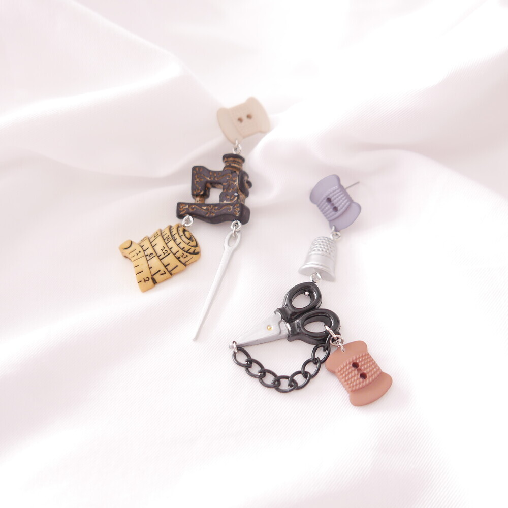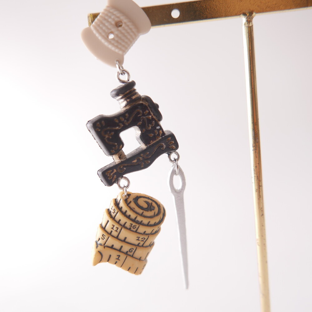 Celebrate creativity with these atelier-themed earrings inspired by sewing rooms and handmade artistry. One earring features a vintage-style sewing machine, yellow measuring tape, and a silver needle. The other showcases a silver thimble, black scissors, and a thread bobbin. A charming tribute to craft lovers, tailors, and designers alike.