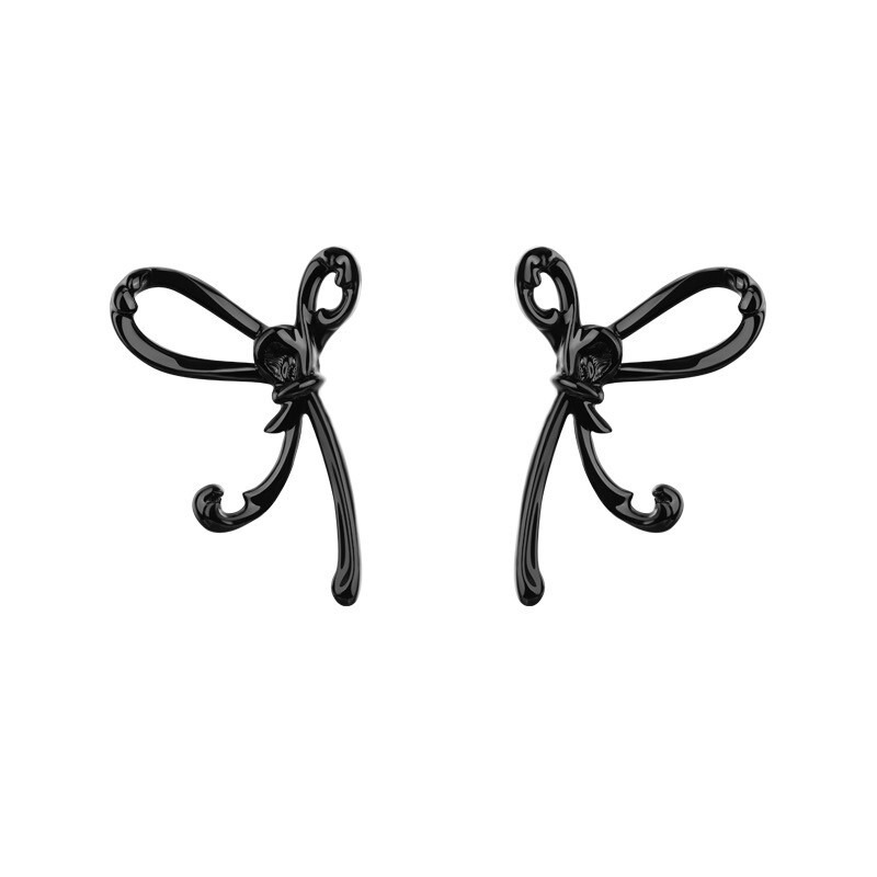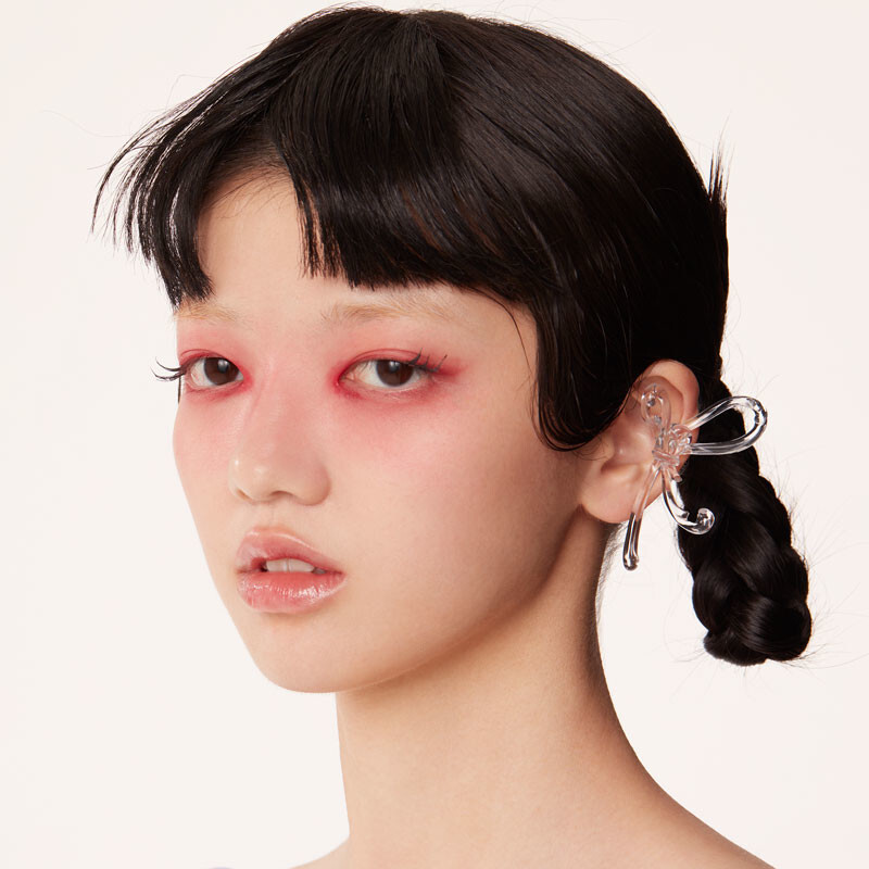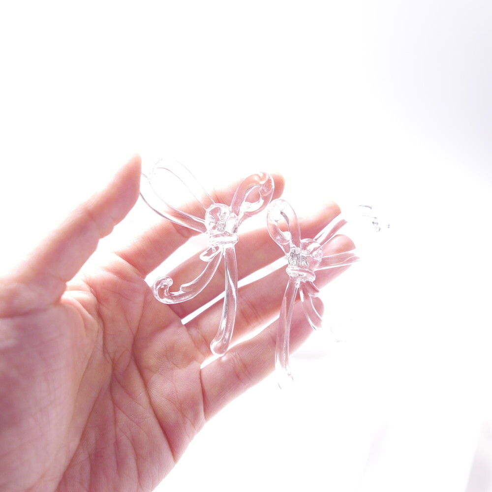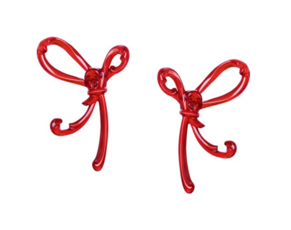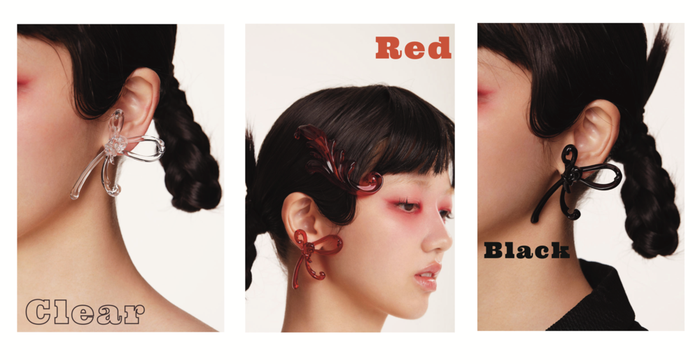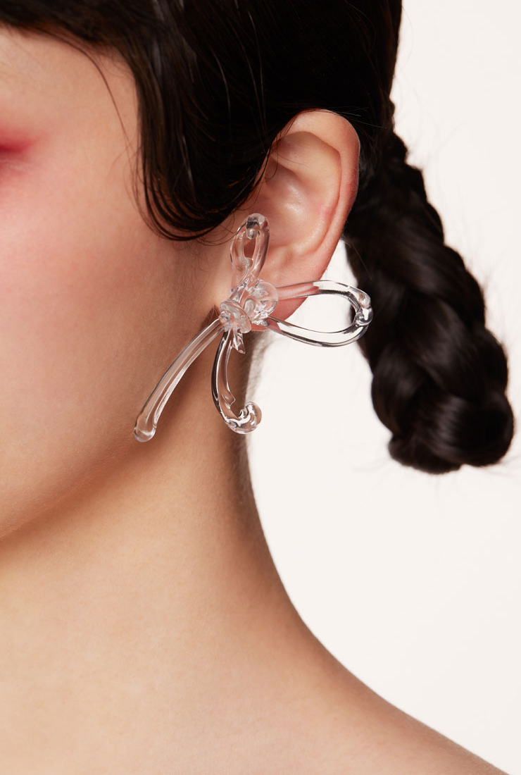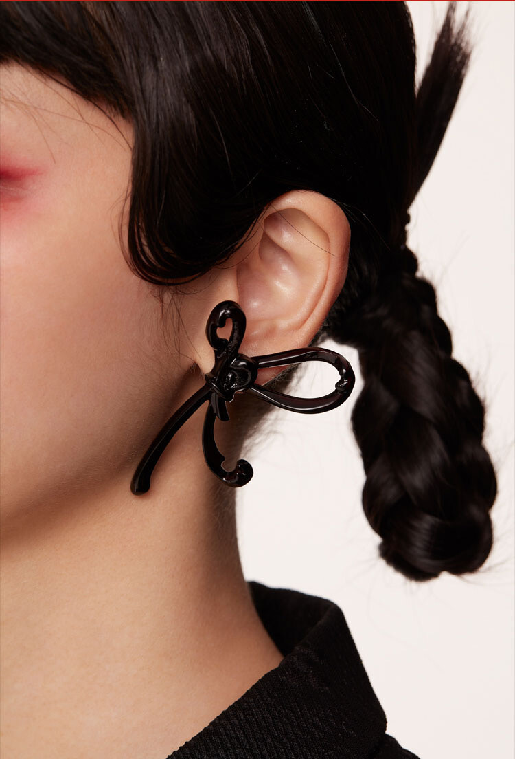 A bold and sculptural statement earring shaped like a tied ribbon. Made from smooth, glossy acrylic, its oversized and fluid form brings an artistic and unique edge to your look. Available in clear, red, and black with both earring and clip-on options. A striking accent for fashion-forward styling.