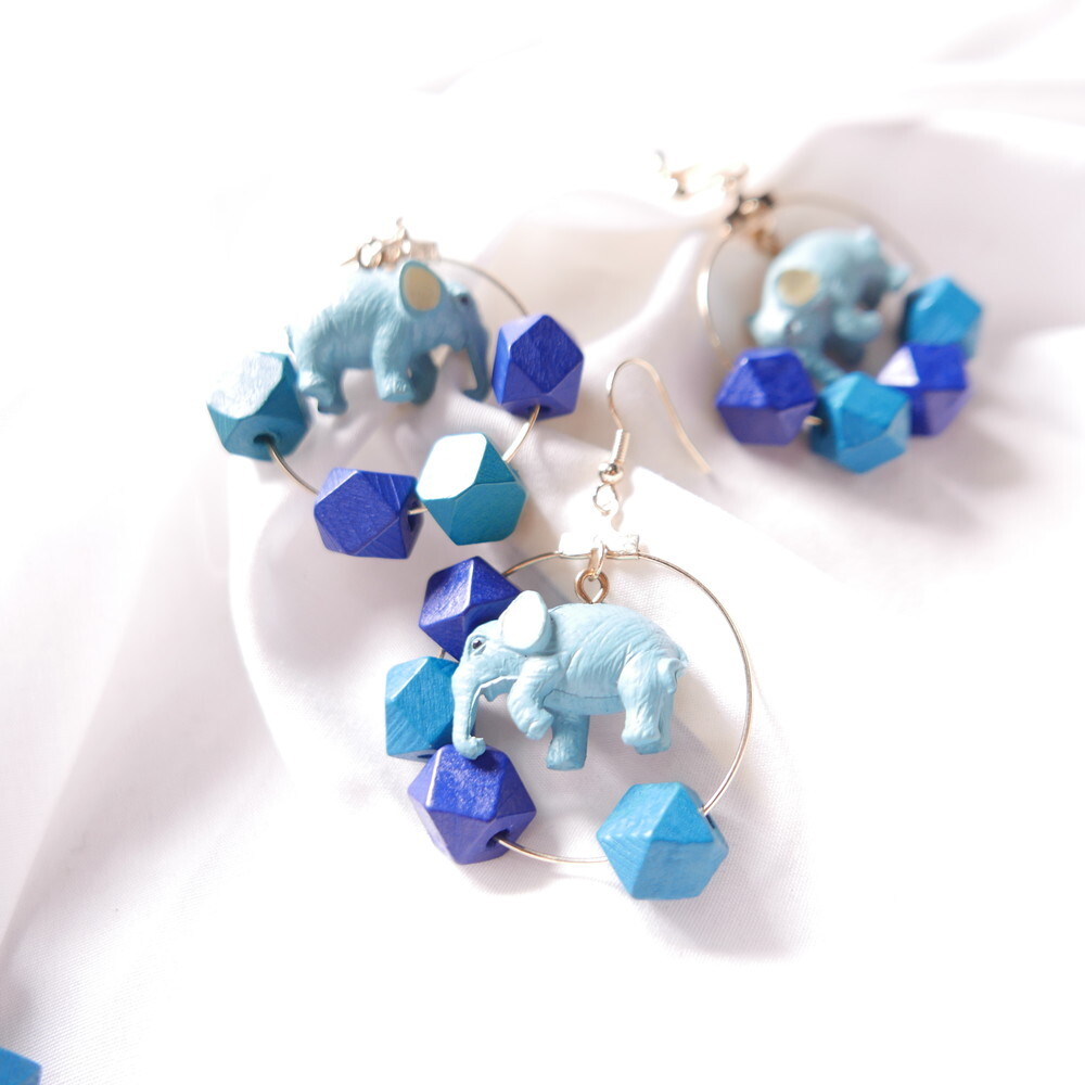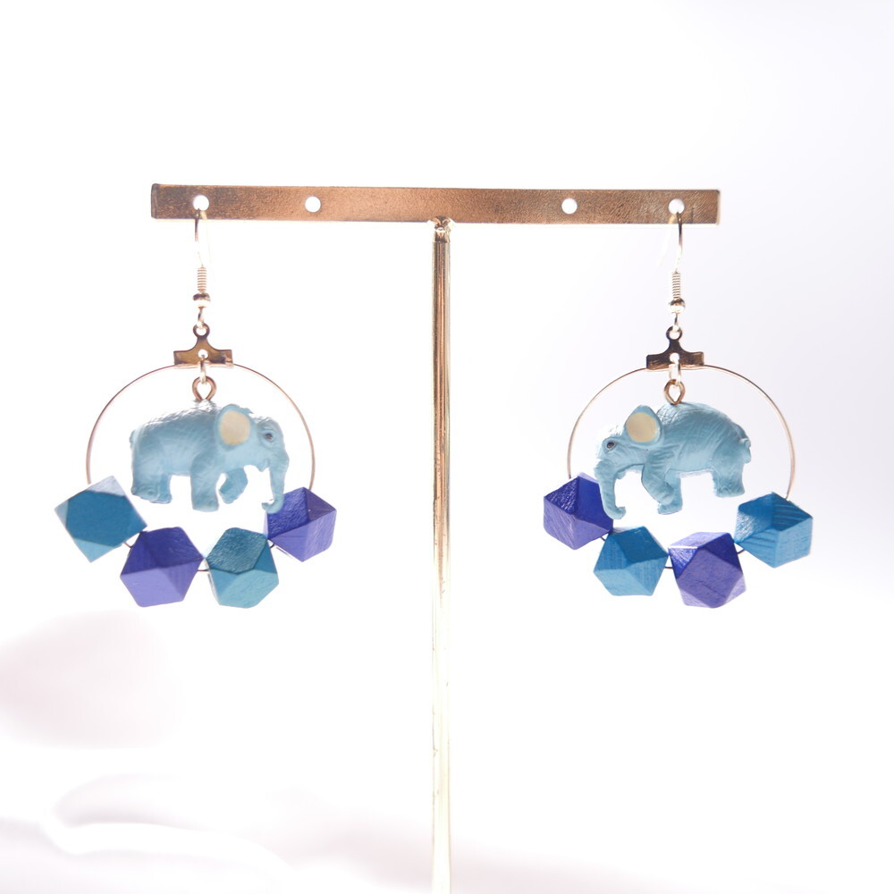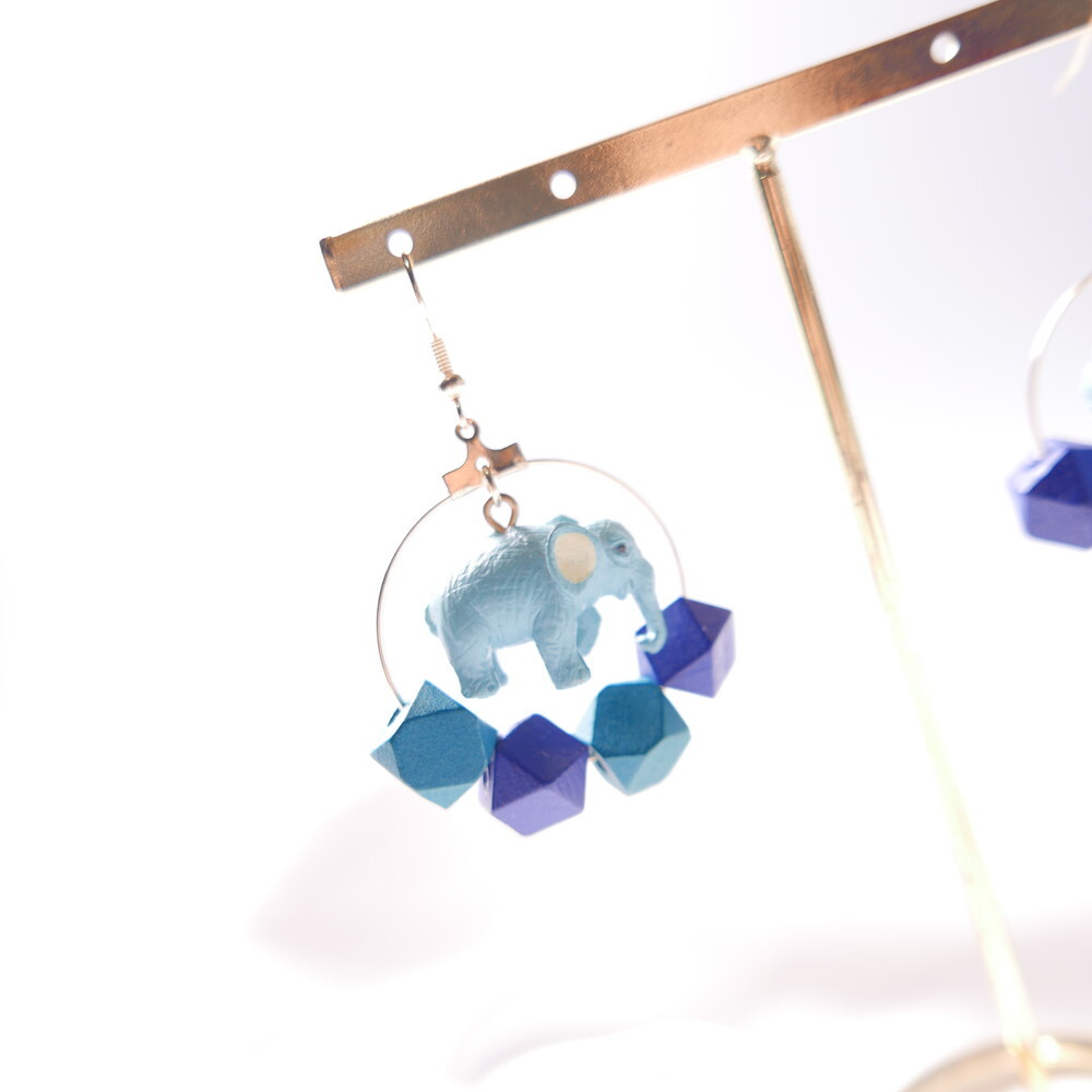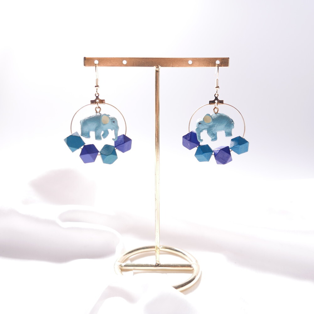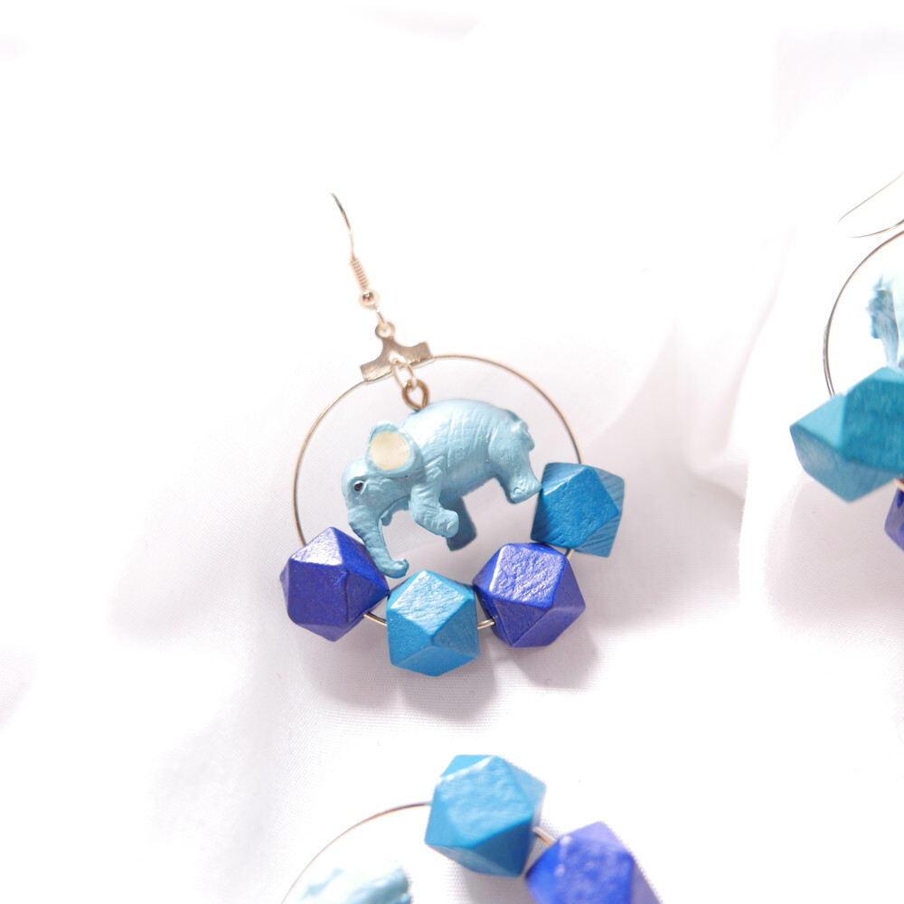 These adorable earrings feature a blue elephant figure surrounded by geometric wooden beads in cool ocean tones.