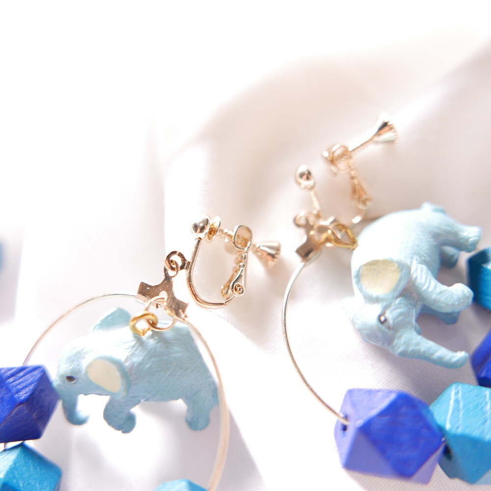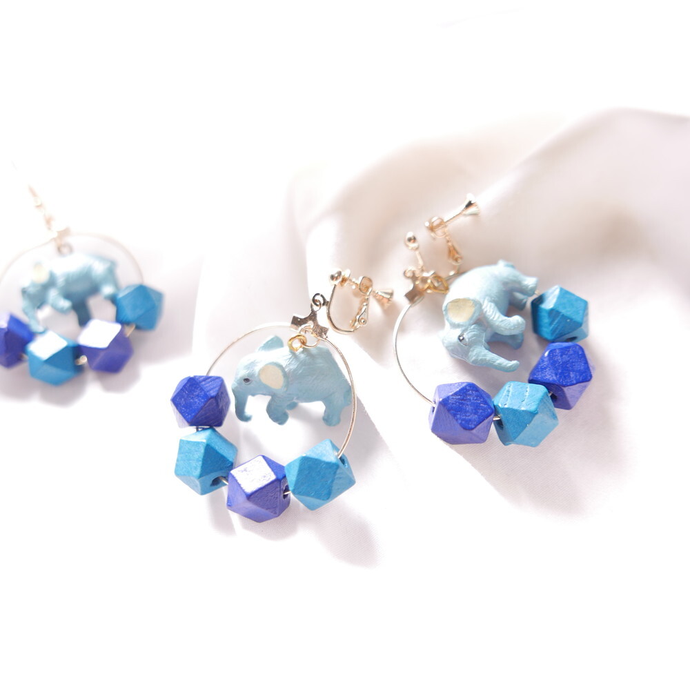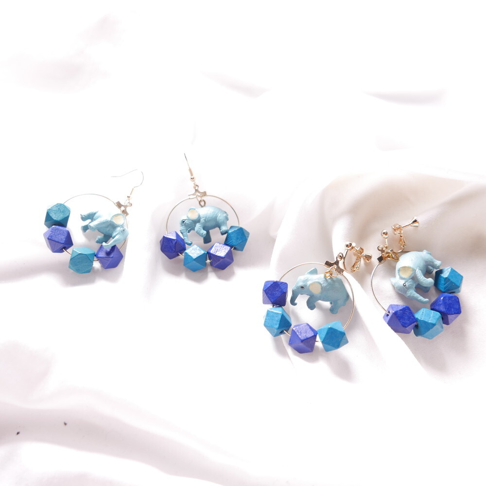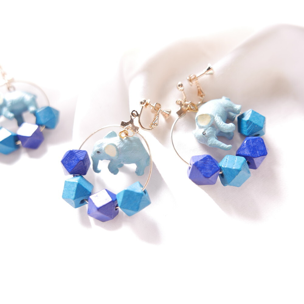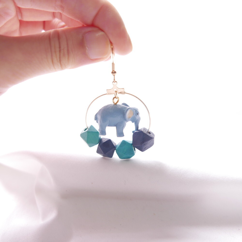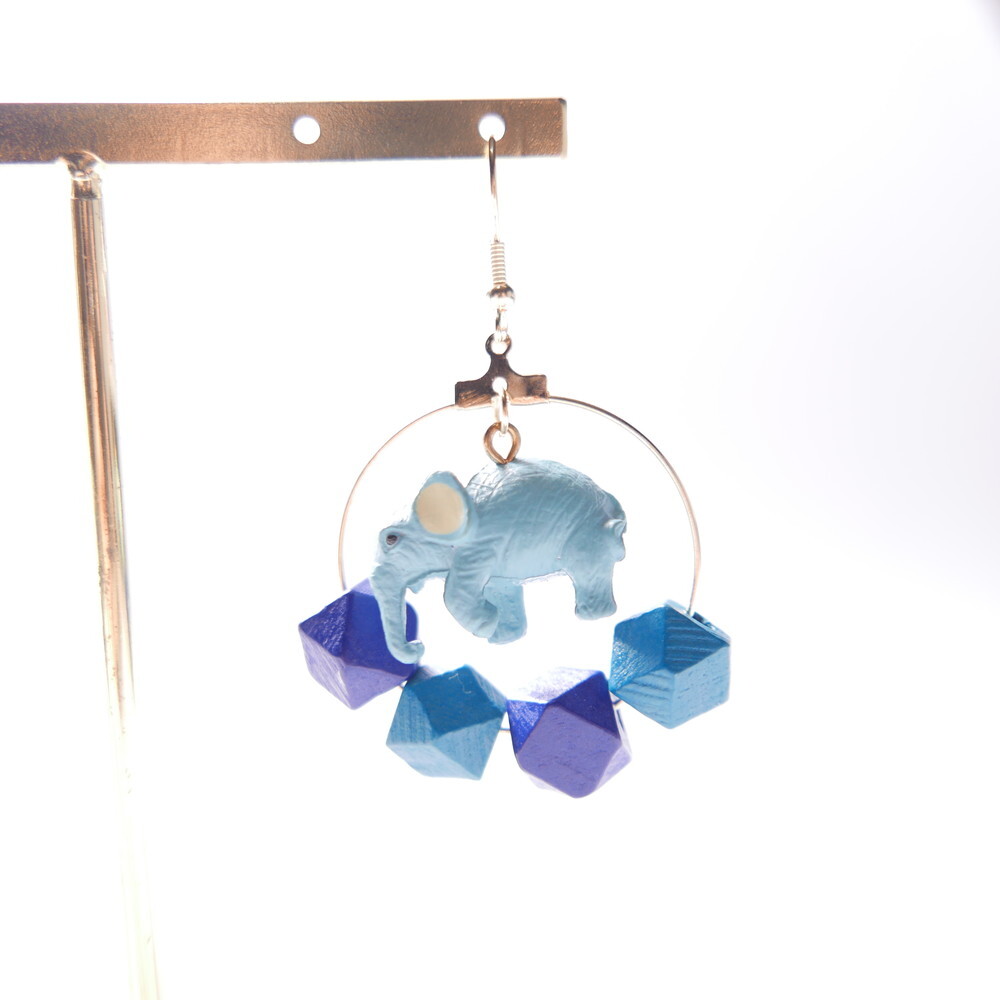 These adorable earrings feature a blue elephant figure surrounded by geometric wooden beads in cool ocean tones.