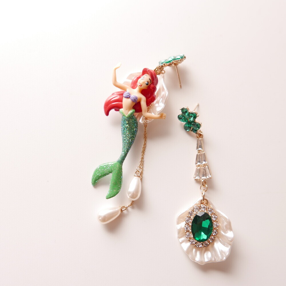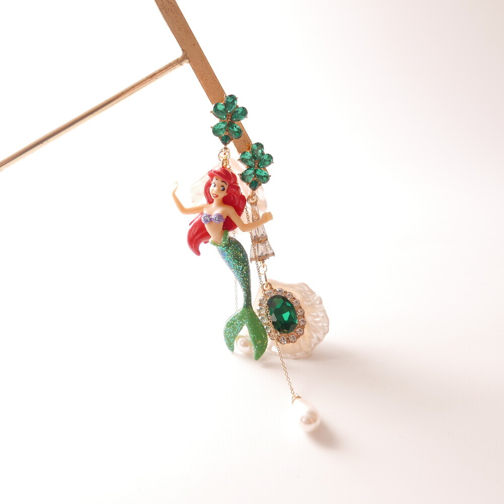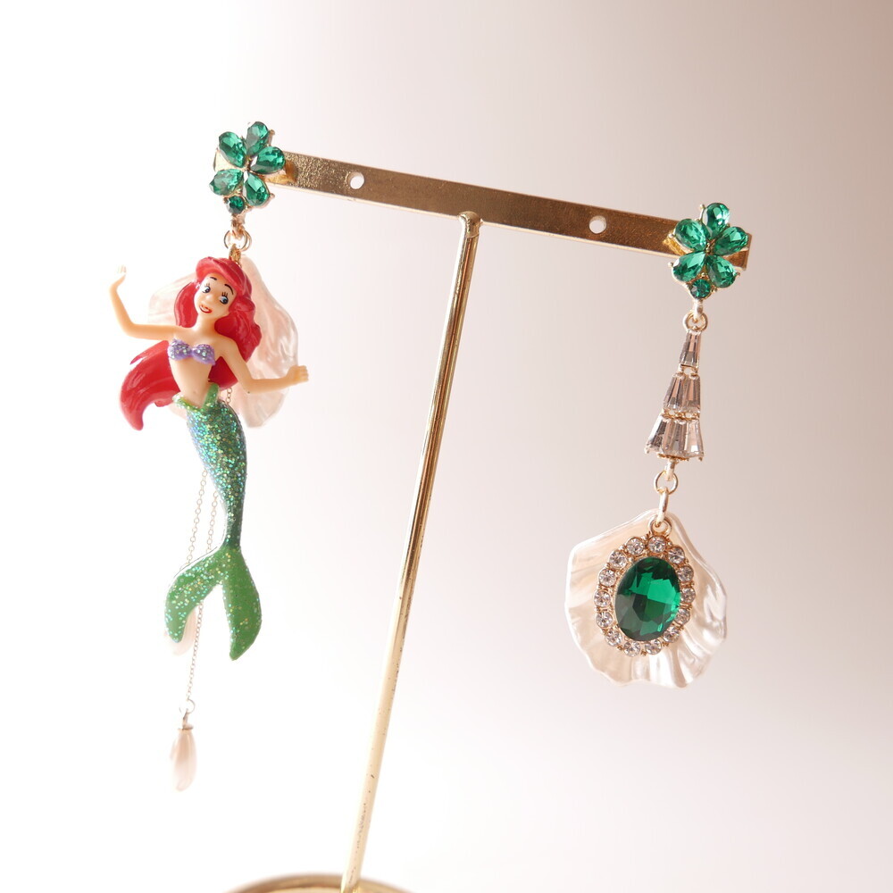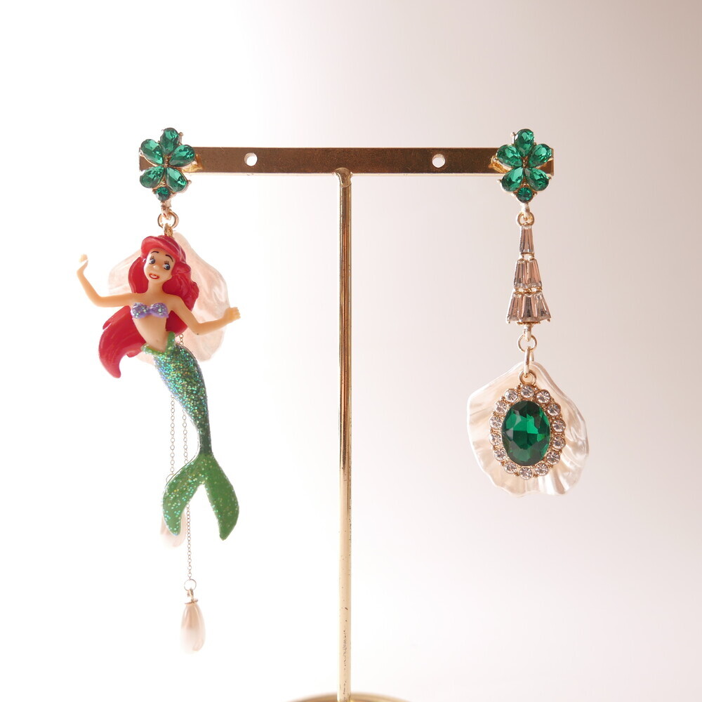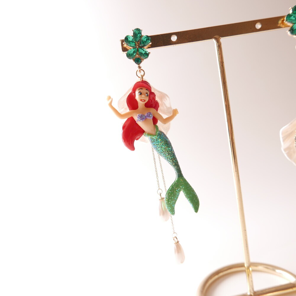 Inspired by the beloved undersea princess, this asymmetrical pair features Ariel in her shimmering green tail on one side and a seashell adorned with a sparkling emerald gem on the other.